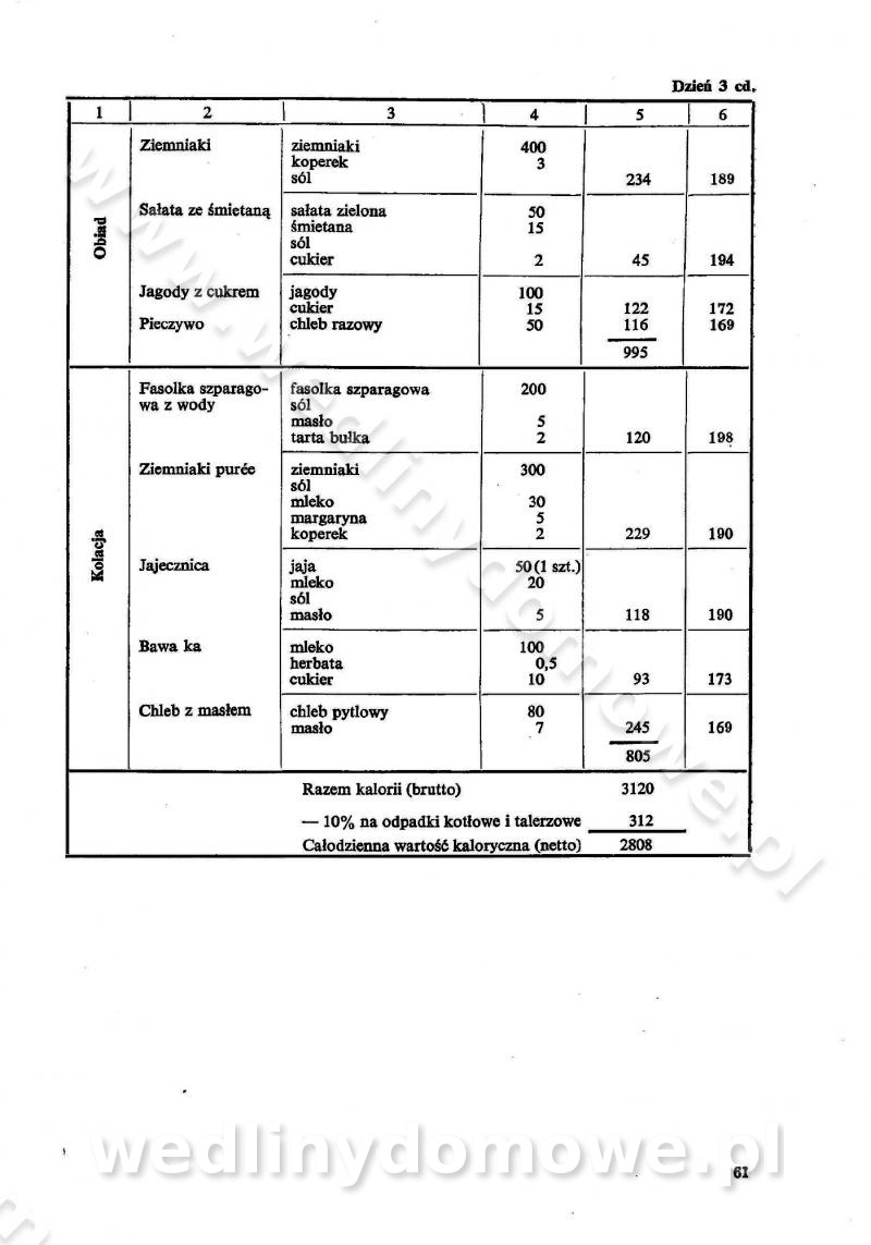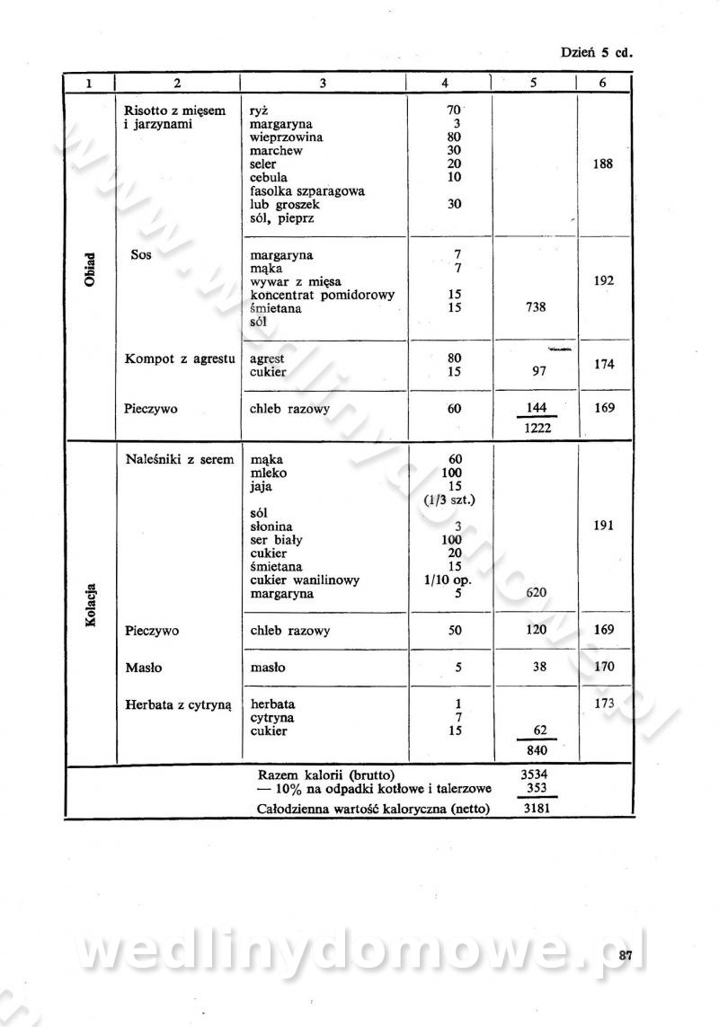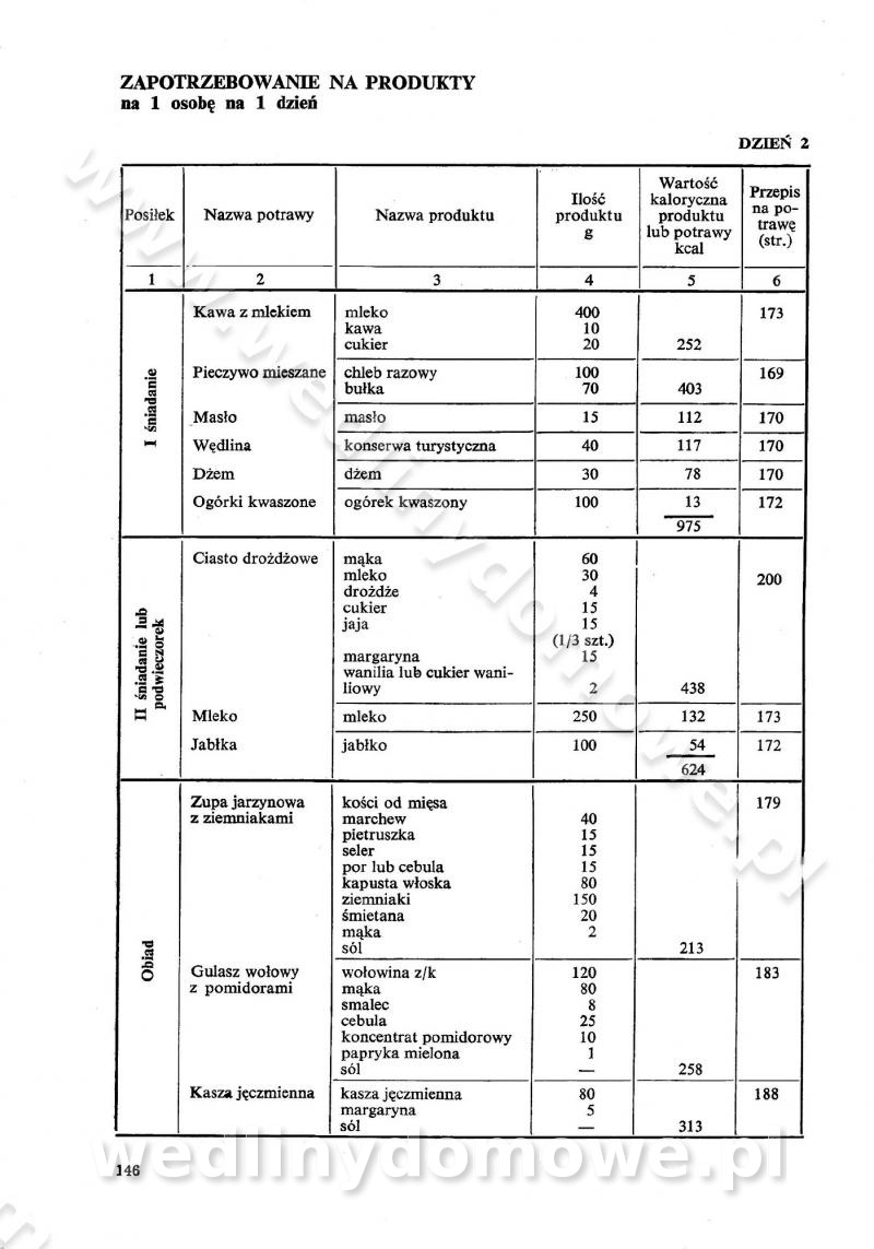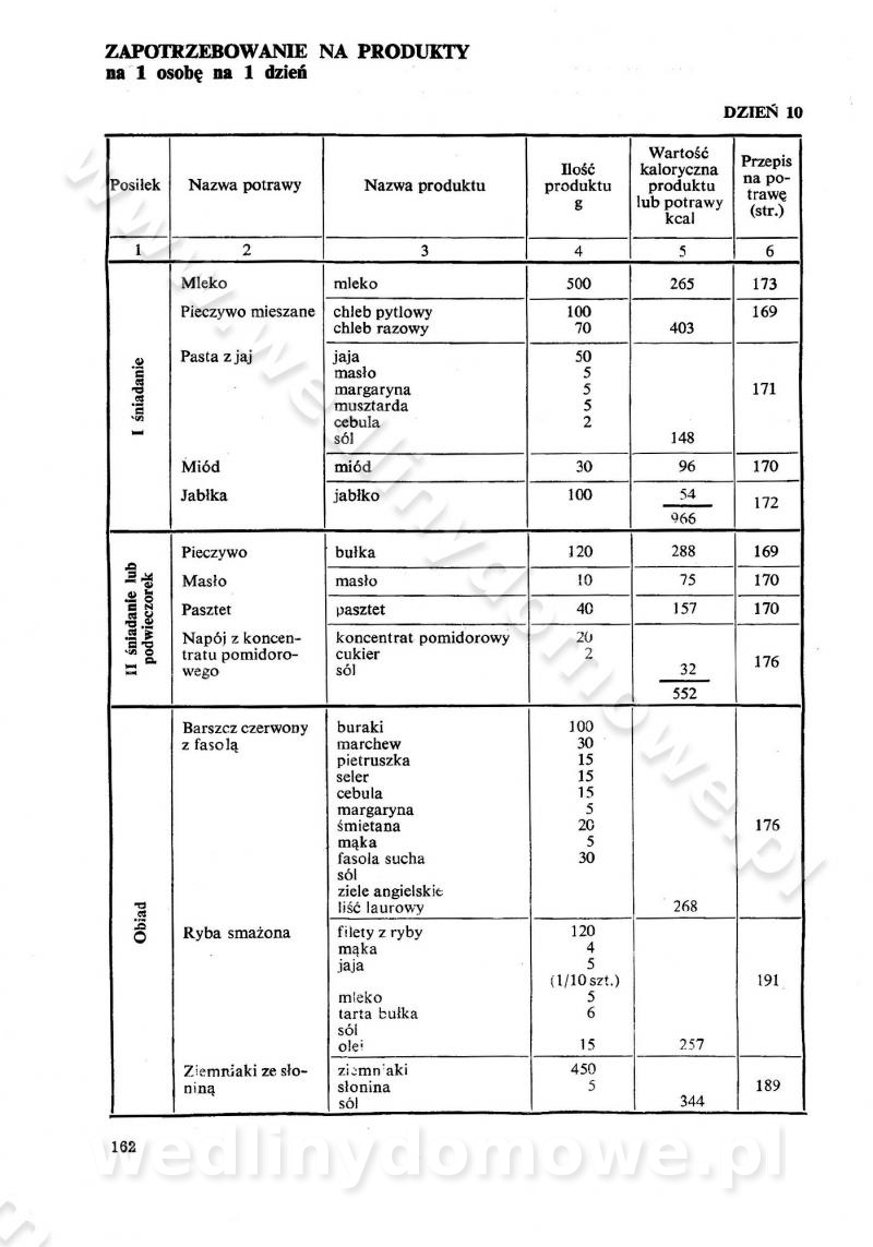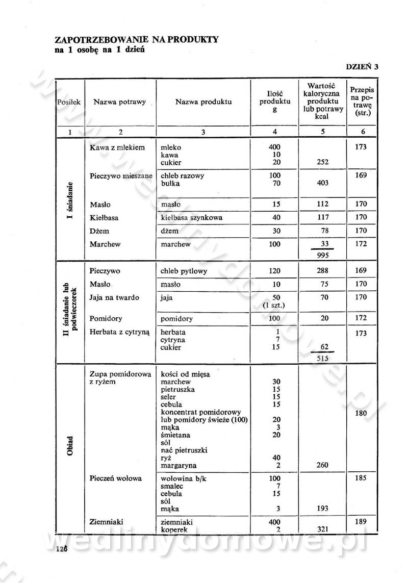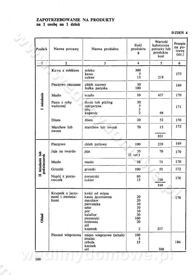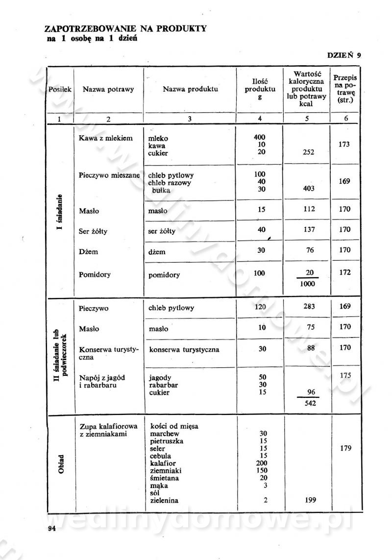 SPIS TREŚCI CZĘŚĆ I TEORETYCZNE PODSTAWY RACJONALNEGO ŻYWIENIA ZBIOROWEGO inż. Krystyna Wolf I. WSKAZÓWKI DO REALIZACJI NORM ŻYWIENIA WYRAŻONYCH W CAŁODZIENNYCH RACJACH POKARMOWYCH II. SKŁADNIKI POKARMOWE I ICH ROLA W ŻYWIENIU Zawartość składników pokarmowych w produktach Rola pożywienia Składniki pokarmowe Wzajemne zależności między składnikami pokarmowymi III. NORMY WYŻYWIENIA Normy zapotrzebowania na składniki pokarmowe Podział produktów Podział produktów na 2 grupy Podział produktów na 9 grup Podział produktów na 12 grup Całodzienne racje pokarmowe Zamiana produktów IV. WYTYCZNE PLANOWANIA ZESTAWU CAŁODZIENNYCH POSIŁKÓW Zasady podziału całodziennych racji pokarmowych na poszczególne posiłki Śniadanie Obiad Kolacja Wytyczne układania jadłospisów Kontrola prawidłowości planowania jadłospisów V. PROCESY TECHNOLOGICZNE, ICH CEL, PRZEBIEG I WPŁYW NA WARTOŚĆ ODŻYWCZĄ POTRAW Cel procesu technologicznego Obróbka wstępna i termiczna Ogólne wskazówki technologiczne Wykończanie potraw VI. WSKAZÓWKI PRAKTYCZNE DOTYCZĄCE KORZYSTANIA Z RECEPTUR CZĘŚĆ II RECEPTURY I. ZUPY inż. Jadwiga Celczyńska Podstawowe zasady sporządzania Sporządzanie wywarów Podział zup Przygotowanie głównych składników zup Wykończanie zup Rodzaje zup Zupy czyste Zupy zabielane Zupy zasmażane Zupy rozklejane Zupy mleczne Zupy owocowe Zupy z wkładką pełnowartościowego białka — samodzielne dania obiadowe lub kolacyjne Zupy czyste (normatyw surowcowy na 10 porcji) Zakwas burakowy na barszcz Zakwas na żur Barszcz burakowy czysty Barszcz czerwony czysty z zagęszczonego soku buraczanego Barszcz burakowy jarski Bulion jarski Rosół z wołowiny Zupa grzybowa czysta Zupa pomidorowa czysta Zupy rozklejane (normatyw surowcowy na 10 porcji) Krupnik na podrobach Krupnik zabielany Krupnik ze słoniną Krupnik z ryżu z jarzynami Zupa grochowa z pęczakiem Zupa grochowa z ziemniakami Zupa rumfordzka Zupa ziemniaczana z fasolą Zalewajka Zalewajka z kwaśnym mlekiem Żur z kiełbasą i boczkiem Żur na podrobach zabielany Zupy zasmażane (normatyw surowcowy na 10 porcji) Kapuśniak z kwaszonej kapusty z papryką Kapuśniak mazurski z kwaszonej kapusty Kapuśniak ze słodkiej kapusty Kapuśniak ze słodkiej kapusty z jabłkami Kapuśniak z czerwonej kapusty Zacierka z ziemniakami Zupa cebulowa Zupa z dyni i pomidorów Zupa fasolowa z makaronem Zupa fasolowa z ziemniakami Zupa z flaków wołowych Zupa „garbure” Zupa grzybowa Zupa jarzynowa z papryką Zupa jarzynowa z fasolą Zupa jarzynowa (jesienna) Zupa jarzynowa z makaronem i serem Zupa z kaszy manny zasmażana Zupa neapolitańska Zupa pomidorowa zasmażana Zupa z porów Zupa z selerów Zupa ziemniaczana zasmażana Zupa ziemniaczana z pomidorami Zupy mleczne (normatyw surowcowy na 10 porcji) Kukurydzanka na mleku Manna na mleku Ryż na mleku Makaron na mleku Płatki owsiane na mleku Zupa z dyni na mleku z tartym ciastem Zupa „nic” Zupa mleczna z lanym ciastem Zupa ze zsiadłego mleka Zupy zabielane (normatyw surowcowy na 10 porcji) Barszcz czerwony zabielany Barszcz czerwony zabielany z suszu Barszcz ukraiński Barszcz czeski Barszcz z botwiną Barszcz jarski z botwiną Chłodnik z botwiną Chłodnik z botwiną na mleku Kapuśniak ze słodkiej kapusty zabielany Kapuśniak na głowiźnie Zupa z brukselki zabielana Zupa cytrynowa Zupa z fasolki szparagowej Zupa grzybowa zabielana Zupa kalafiorowa Zupa koperkowa Zupa ogórkowa Zupa pomidorowa Zupa rybna Zupa szczawiowa Zupa pieczarkowa Zupa ze szpinaku Zupa z młodych jarzyn zabielana Zupa jarzynowa zabielana z mrożonek Zupa ziemniaczana „Paysanne” Pejzanka z puree ziemniaczanym Zupa z młodych ziemniaków Zupa ziemniaczana z porami Zupa z zielonego groszku Zupy owocowe (normatyw surowcowy na 10 porcji) Chłodnik z czarnych jagód Chłodnik truskawkowy Zupa z czarnych jagód Zupa jabłkowa Zupa jabłkowa zabielana Zupa z jabłek i śliwek Zupa ze śliwek Zupa z owoców mieszanych Zupa owocowa z suszu jabłkowego i marmolady Zupa owocowa czysta Zupa z powideł śliwkowych Zupa rabarbarowa Zupa z suszonych śliwek Zupa truskawkowa Zupa z truskawek i rabarbaru Zupy z wkładką mięsną (normatyw surowcowy na 10 porcji) Barszcz małorosyjski na rosole z mięsem Barszcz z ziemniakami i serdelkami Grochówka z mięsem i ziemniakami Kapuśniak z kwaszonej kapusty z kiełbasą Kapuśniak ze słodkiej kapusty z pomidorami i mięsem Krupnik z ryżu na mięsie Krupnik na mięsie Pejzanka na żeberkach Zupa z fasolki szparagowej na mięsie Zupa fasolowa z mięsem i makaronem Zupa jarzynowa z mięsem Gulaszowa polewka Zupa koperkowa na mięsie Zupa ogórkowa z ziemniakami na mięsie Zupa pomidorowa z makaronem i mięsem Zupa z porów z ziemniakami i wątróbką Zupa wiosenna z jajami Zupa ziemniaczana z mięsem Żur z kiełbasą i ziemniakami II. POTRAWY MIĘSNE inż. Krystyna Wolf Podstawowe zasady sporządzania Zachowanie wartości odżywczej dań mięsnych Cechy prawidłowo przyrządzonego mięsa Przechowywanie Rozmrażanie mięsa Rozbiór tuszy zwierząt rzeźnych Obróbka wstępna Obróbka termiczna Potrawy z baraniny (normatyw surowcowy na 10 porcji) Potrawka z baraniny Kotlet barani mielony Kotlet barani mielony z ryżem Baranina w warzywach Ragout baranie Baranina duszona Potrawy z cielęciny (normatyw surowcowy na 10 porcji) Potrawka cielęca Pulpety cielęce Kotlet cielęcy mielony Klopsiki cielęce do sosów Sznycel cielęcy (mielony) Filet cielęcy (do sosów i dodatków) Zrazy cielęce bite (do sosów) Zrazy cielęce nadziewane słoniną Sznycel cielęcy Zrazy cielęce po polsku (faszerowane) Paprykarz cielęcy Pieczeń cielęca duszona Pieczeń cielęca Mostek cielęcy po wiedeńsku Mostek cielęcy faszerowany Rolada cielęca faszerowana Potrawy z wieprzowiny (normatyw surowcowy na 10 porcji) Mięso wieprzowe gotowane Peklówka wieprzowa gotowana Filet wieprzowy saute Kotlet wieprzowy mielony Zraz wieprzowy (klopsik) mielony do sosów Kotlet miel