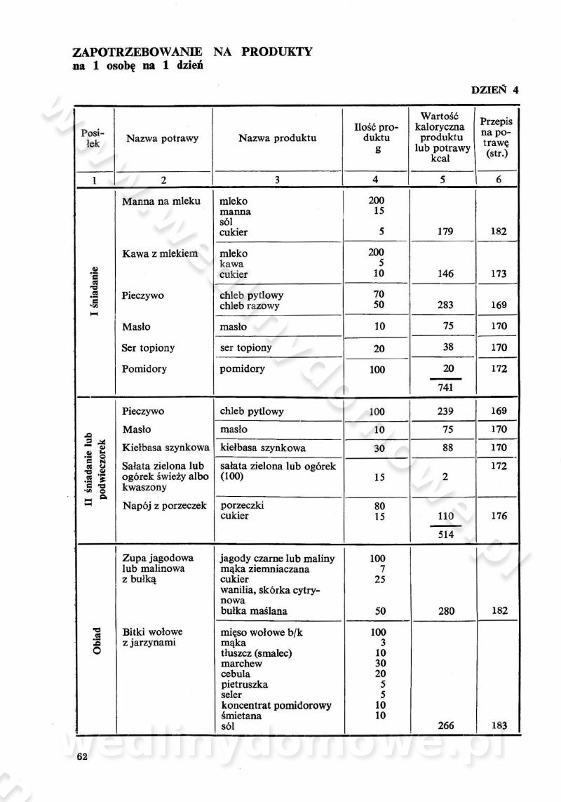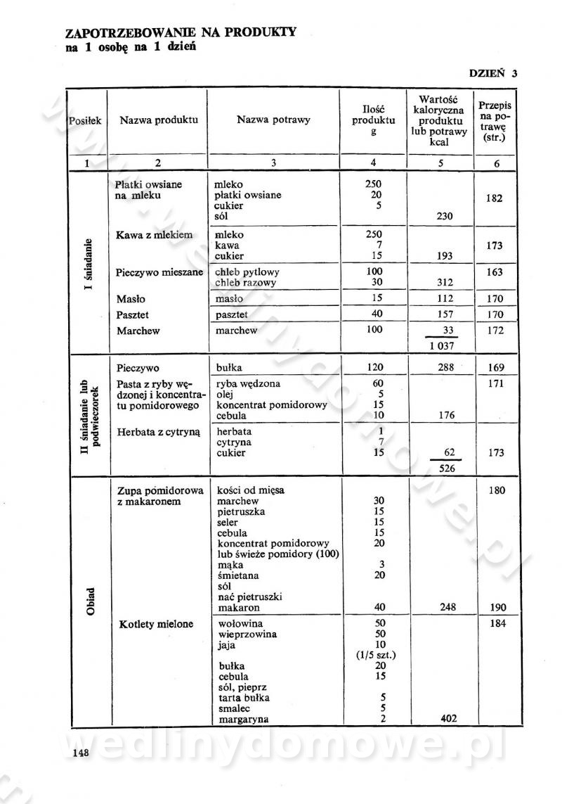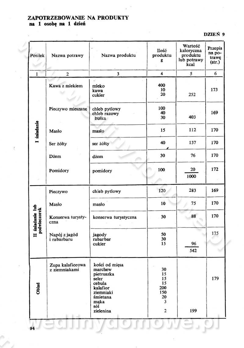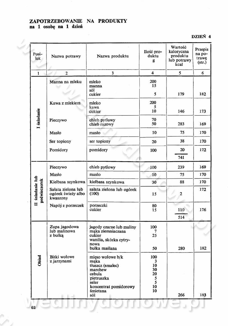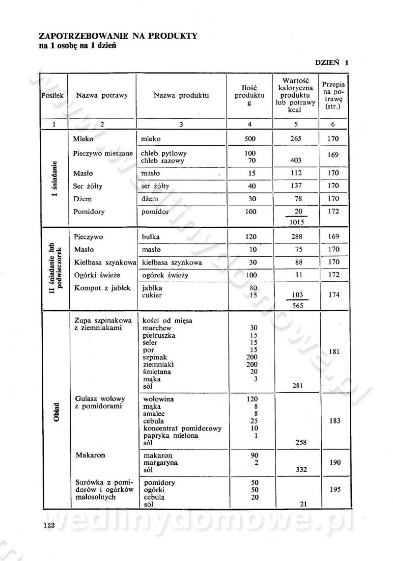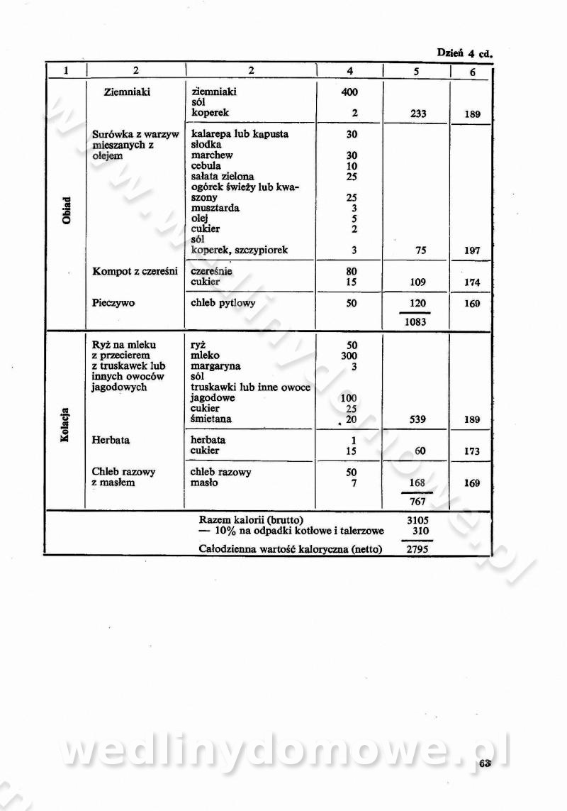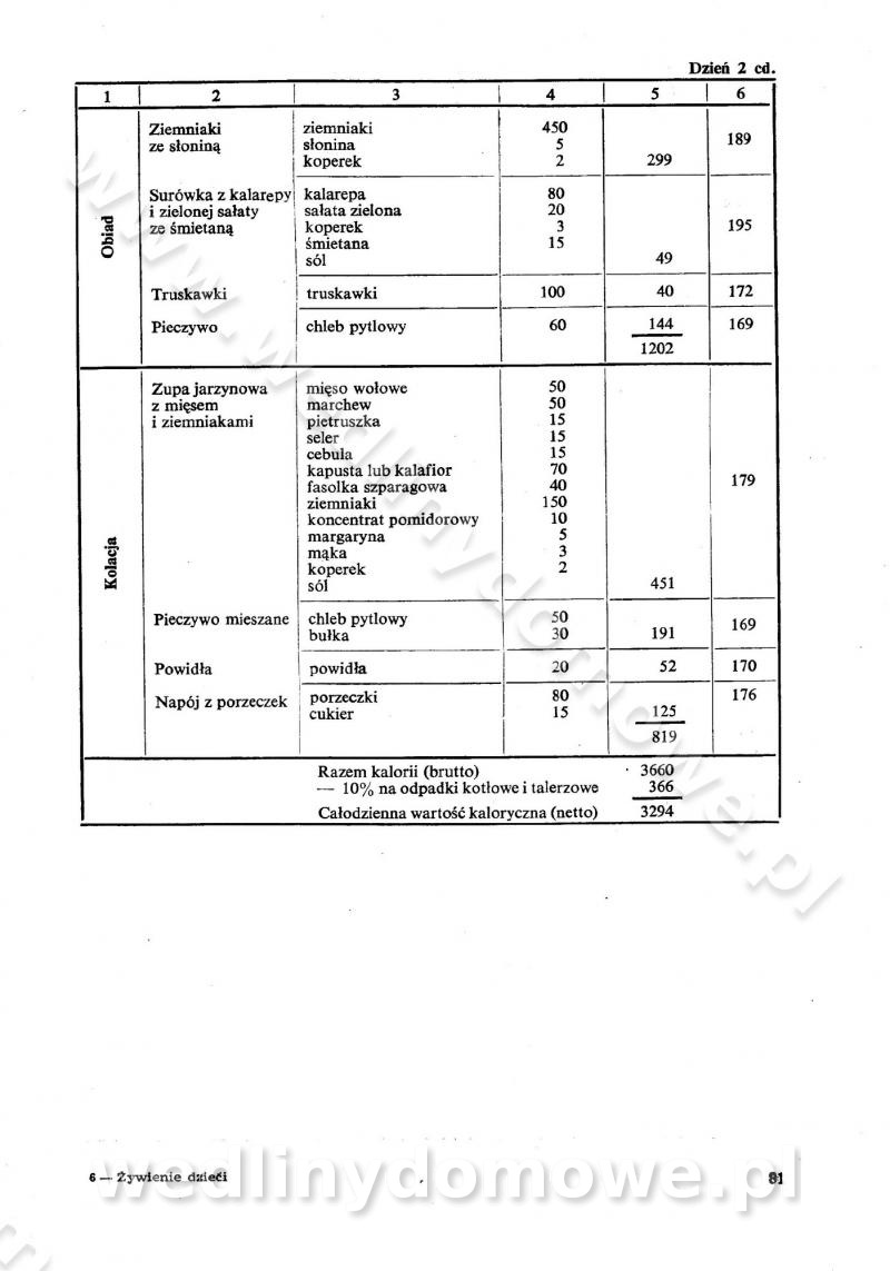SPIS TREŚCI CZĘŚĆ I TEORETYCZNE PODSTAWY RACJONALNEGO ŻYWIENIA ZBIOROWEGO inż. Krystyna Wolf I. WSKAZÓWKI DO REALIZACJI NORM ŻYWIENIA WYRAŻONYCH W CAŁODZIENNYCH RACJACH POKARMOWYCH II. SKŁADNIKI POKARMOWE I ICH ROLA W ŻYWIENIU Zawartość składników pokarmowych w produktach Rola pożywienia Składniki pokarmowe Wzajemne zależności między składnikami pokarmowymi III. NORMY WYŻYWIENIA Normy zapotrzebowania na składniki pokarmowe Podział produktów Podział produktów na 2 grupy Podział produktów na 9 grup Podział produktów na 12 grup Całodzienne racje pokarmowe Zamiana produktów IV. WYTYCZNE PLANOWANIA ZESTAWU CAŁODZIENNYCH POSIŁKÓW Zasady podziału całodziennych racji pokarmowych na poszczególne posiłki Śniadanie Obiad Kolacja Wytyczne układania jadłospisów Kontrola prawidłowości planowania jadłospisów V. PROCESY TECHNOLOGICZNE, ICH CEL, PRZEBIEG I WPŁYW NA WARTOŚĆ ODŻYWCZĄ POTRAW Cel procesu technologicznego Obróbka wstępna i termiczna Ogólne wskazówki technologiczne Wykończanie potraw VI. WSKAZÓWKI PRAKTYCZNE DOTYCZĄCE KORZYSTANIA Z RECEPTUR CZĘŚĆ II RECEPTURY I. ZUPY inż. Jadwiga Celczyńska Podstawowe zasady sporządzania Sporządzanie wywarów Podział zup Przygotowanie głównych składników zup Wykończanie zup Rodzaje zup Zupy czyste Zupy zabielane Zupy zasmażane Zupy rozklejane Zupy mleczne Zupy owocowe Zupy z wkładką pełnowartościowego białka — samodzielne dania obiadowe lub kolacyjne Zupy czyste (normatyw surowcowy na 10 porcji) Zakwas burakowy na barszcz Zakwas na żur Barszcz burakowy czysty Barszcz czerwony czysty z zagęszczonego soku buraczanego Barszcz burakowy jarski Bulion jarski Rosół z wołowiny Zupa grzybowa czysta Zupa pomidorowa czysta Zupy rozklejane (normatyw surowcowy na 10 porcji) Krupnik na podrobach Krupnik zabielany Krupnik ze słoniną Krupnik z ryżu z jarzynami Zupa grochowa z pęczakiem Zupa grochowa z ziemniakami Zupa rumfordzka Zupa ziemniaczana z fasolą Zalewajka Zalewajka z kwaśnym mlekiem Żur z kiełbasą i boczkiem Żur na podrobach zabielany Zupy zasmażane (normatyw surowcowy na 10 porcji) Kapuśniak z kwaszonej kapusty z papryką Kapuśniak mazurski z kwaszonej kapusty Kapuśniak ze słodkiej kapusty Kapuśniak ze słodkiej kapusty z jabłkami Kapuśniak z czerwonej kapusty Zacierka z ziemniakami Zupa cebulowa Zupa z dyni i pomidorów Zupa fasolowa z makaronem Zupa fasolowa z ziemniakami Zupa z flaków wołowych Zupa „garbure” Zupa grzybowa Zupa jarzynowa z papryką Zupa jarzynowa z fasolą Zupa jarzynowa (jesienna) Zupa jarzynowa z makaronem i serem Zupa z kaszy manny zasmażana Zupa neapolitańska Zupa pomidorowa zasmażana Zupa z porów Zupa z selerów Zupa ziemniaczana zasmażana Zupa ziemniaczana z pomidorami Zupy mleczne (normatyw surowcowy na 10 porcji) Kukurydzanka na mleku Manna na mleku Ryż na mleku Makaron na mleku Płatki owsiane na mleku Zupa z dyni na mleku z tartym ciastem Zupa „nic” Zupa mleczna z lanym ciastem Zupa ze zsiadłego mleka Zupy zabielane (normatyw surowcowy na 10 porcji) Barszcz czerwony zabielany Barszcz czerwony zabielany z suszu Barszcz ukraiński Barszcz czeski Barszcz z botwiną Barszcz jarski z botwiną Chłodnik z botwiną Chłodnik z botwiną na mleku Kapuśniak ze słodkiej kapusty zabielany Kapuśniak na głowiźnie Zupa z brukselki zabielana Zupa cytrynowa Zupa z fasolki szparagowej Zupa grzybowa zabielana Zupa kalafiorowa Zupa koperkowa Zupa ogórkowa Zupa pomidorowa Zupa rybna Zupa szczawiowa Zupa pieczarkowa Zupa ze szpinaku Zupa z młodych jarzyn zabielana Zupa jarzynowa zabielana z mrożonek Zupa ziemniaczana „Paysanne” Pejzanka z puree ziemniaczanym Zupa z młodych ziemniaków Zupa ziemniaczana z porami Zupa z zielonego groszku Zupy owocowe (normatyw surowcowy na 10 porcji) Chłodnik z czarnych jagód Chłodnik truskawkowy Zupa z czarnych jagód Zupa jabłkowa Zupa jabłkowa zabielana Zupa z jabłek i śliwek Zupa ze śliwek Zupa z owoców mieszanych Zupa owocowa z suszu jabłkowego i marmolady Zupa owocowa czysta Zupa z powideł śliwkowych Zupa rabarbarowa Zupa z suszonych śliwek Zupa truskawkowa Zupa z truskawek i rabarbaru Zupy z wkładką mięsną (normatyw surowcowy na 10 porcji) Barszcz małorosyjski na rosole z mięsem Barszcz z ziemniakami i serdelkami Grochówka z mięsem i ziemniakami Kapuśniak z kwaszonej kapusty z kiełbasą Kapuśniak ze słodkiej kapusty z pomidorami i mięsem Krupnik z ryżu na mięsie Krupnik na mięsie Pejzanka na żeberkach Zupa z fasolki szparagowej na mięsie Zupa fasolowa z mięsem i makaronem Zupa jarzynowa z mięsem Gulaszowa polewka Zupa koperkowa na mięsie Zupa ogórkowa z ziemniakami na mięsie Zupa pomidorowa z makaronem i mięsem Zupa z porów z ziemniakami i wątróbką Zupa wiosenna z jajami Zupa ziemniaczana z mięsem Żur z kiełbasą i ziemniakami II. POTRAWY MIĘSNE inż. Krystyna Wolf Podstawowe zasady sporządzania Zachowanie wartości odżywczej dań mięsnych Cechy prawidłowo przyrządzonego mięsa Przechowywanie Rozmrażanie mięsa Rozbiór tuszy zwierząt rzeźnych Obróbka wstępna Obróbka termiczna Potrawy z baraniny (normatyw surowcowy na 10 porcji) Potrawka z baraniny Kotlet barani mielony Kotlet barani mielony z ryżem Baranina w warzywach Ragout baranie Baranina duszona Potrawy z cielęciny (normatyw surowcowy na 10 porcji) Potrawka cielęca Pulpety cielęce Kotlet cielęcy mielony Klopsiki cielęce do sosów Sznycel cielęcy (mielony) Filet cielęcy (do sosów i dodatków) Zrazy cielęce bite (do sosów) Zrazy cielęce nadziewane słoniną Sznycel cielęcy Zrazy cielęce po polsku (faszerowane) Paprykarz cielęcy Pieczeń cielęca duszona Pieczeń cielęca Mostek cielęcy po wiedeńsku Mostek cielęcy faszerowany Rolada cielęca faszerowana Potrawy z wieprzowiny (normatyw surowcowy na 10 porcji) Mięso wieprzowe gotowane Peklówka wieprzowa gotowana Filet wieprzowy saute Kotlet wieprzowy mielony Zraz wieprzowy (klopsik) mielony do sosów Kotlet miel