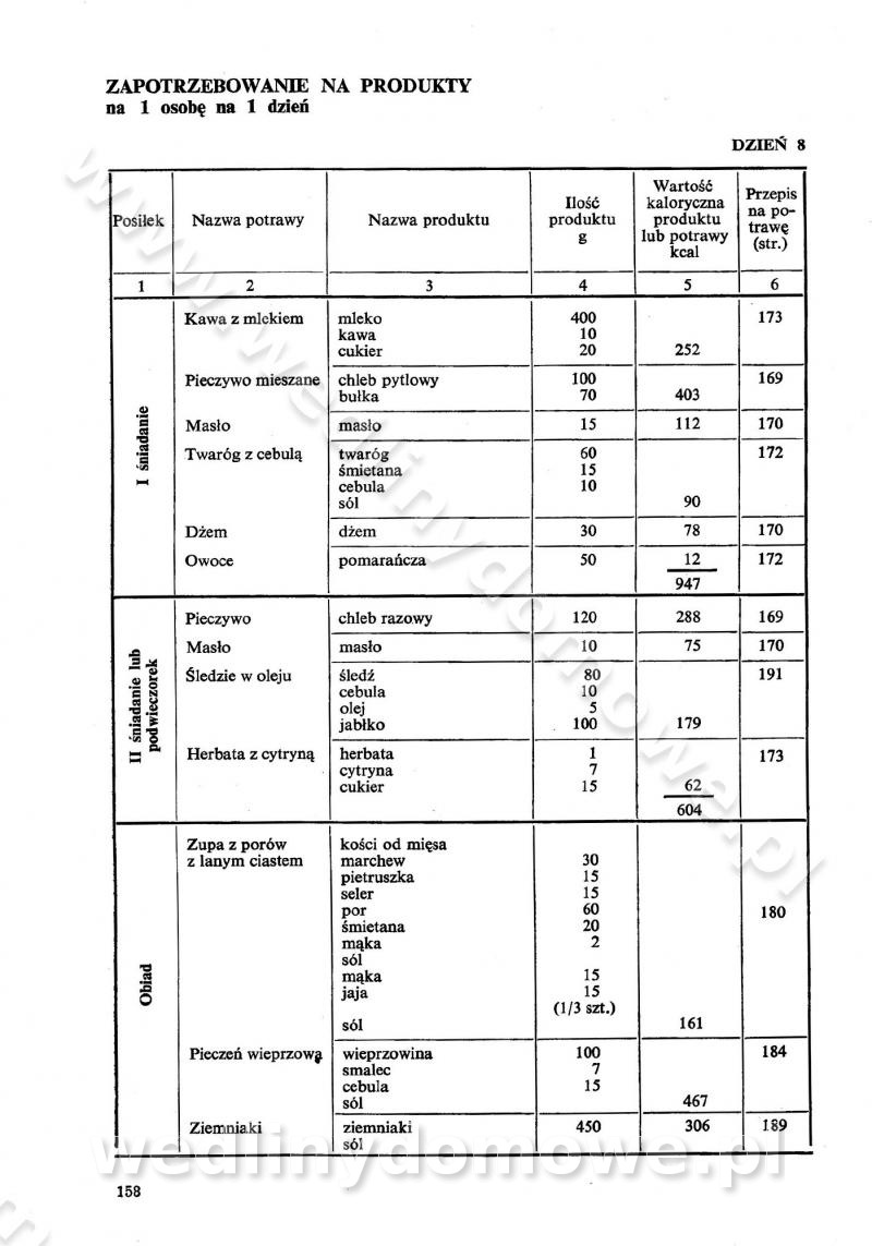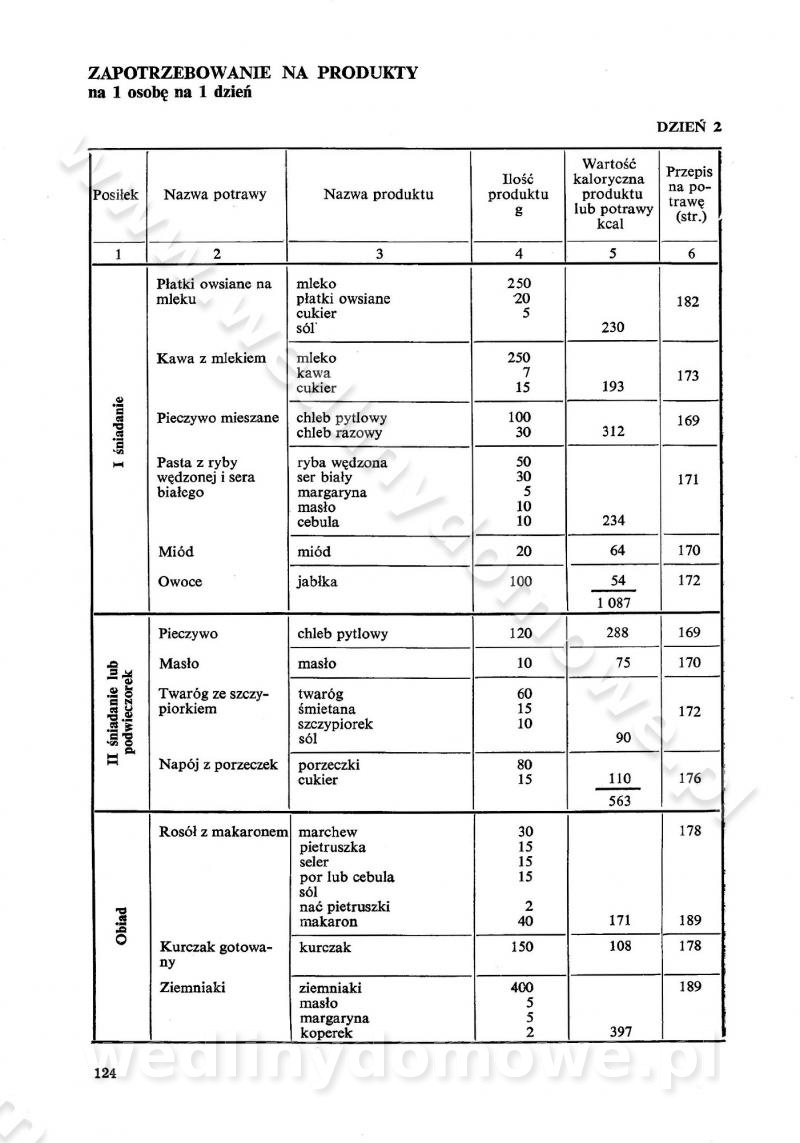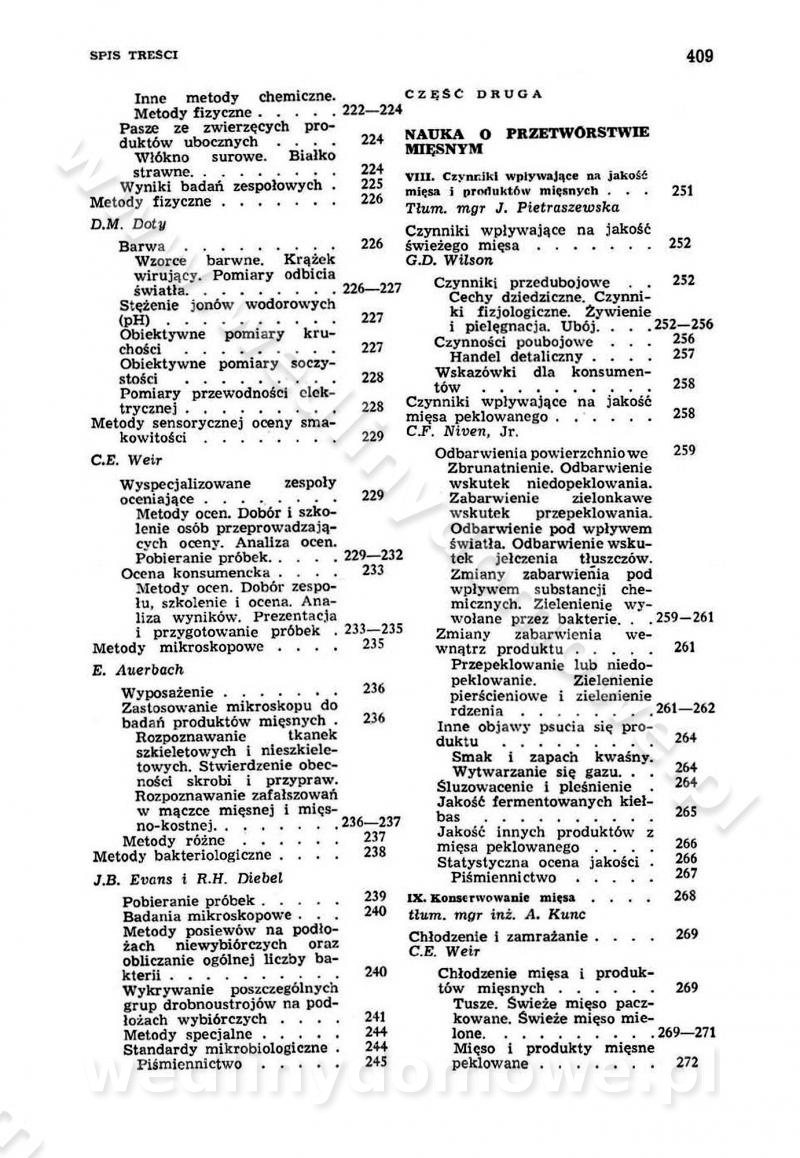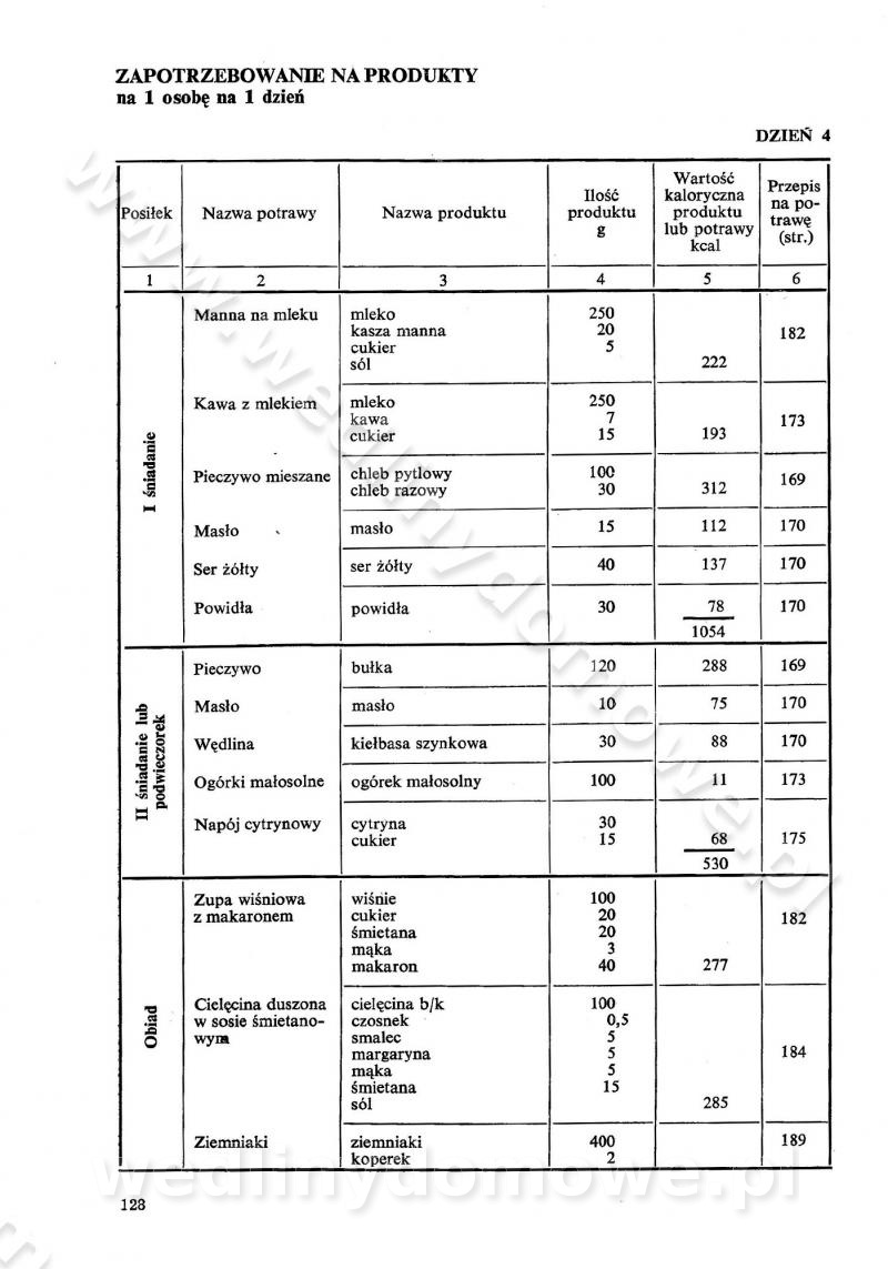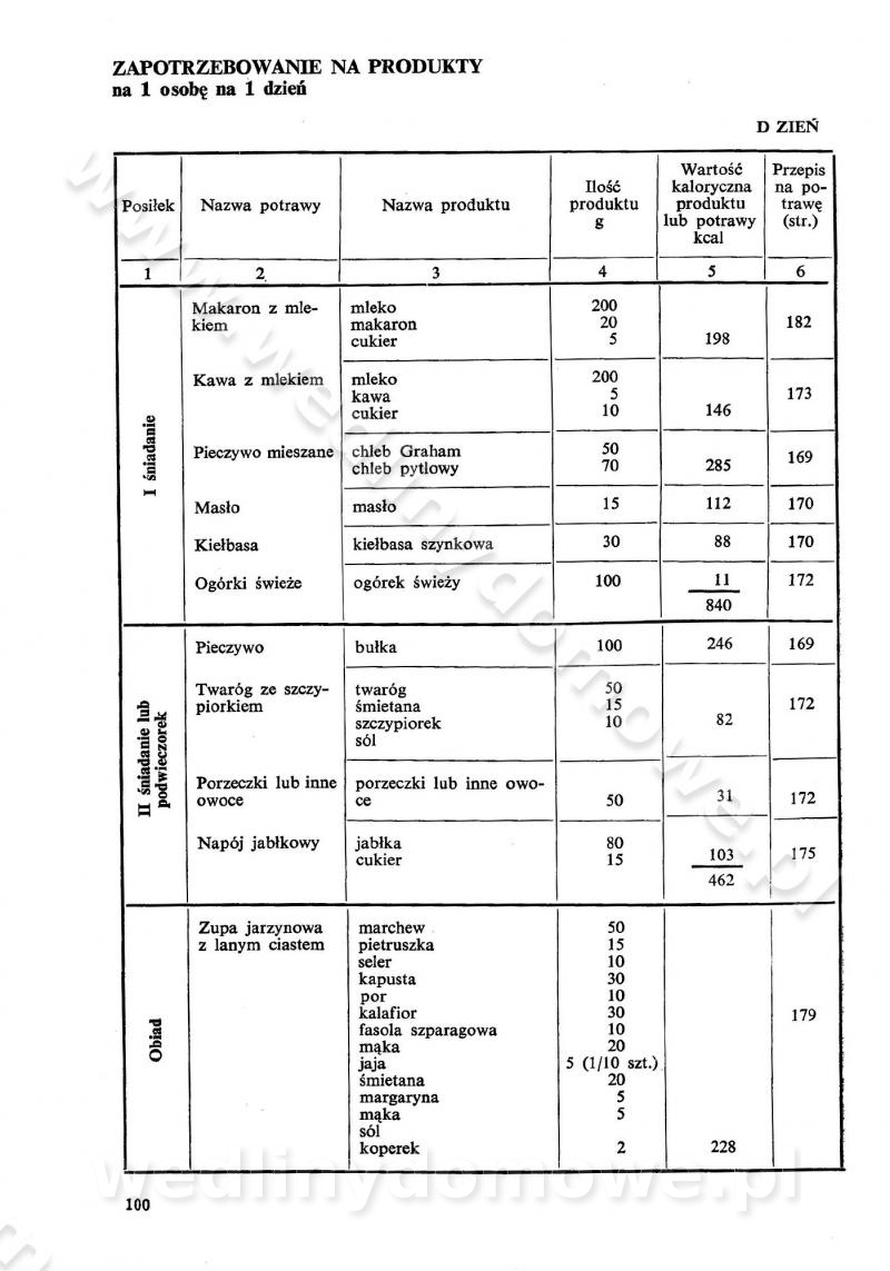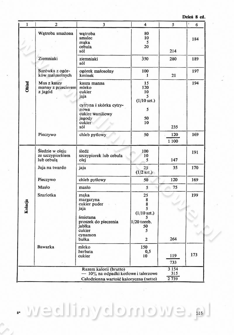 SPIS TREŚCI CZĘŚĆ I TEORETYCZNE PODSTAWY RACJONALNEGO ŻYWIENIA ZBIOROWEGO inż. Krystyna Wolf I. WSKAZÓWKI DO REALIZACJI NORM ŻYWIENIA WYRAŻONYCH W CAŁODZIENNYCH RACJACH POKARMOWYCH II. SKŁADNIKI POKARMOWE I ICH ROLA W ŻYWIENIU Zawartość składników pokarmowych w produktach Rola pożywienia Składniki pokarmowe Wzajemne zależności między składnikami pokarmowymi III. NORMY WYŻYWIENIA Normy zapotrzebowania na składniki pokarmowe Podział produktów Podział produktów na 2 grupy Podział produktów na 9 grup Podział produktów na 12 grup Całodzienne racje pokarmowe Zamiana produktów IV. WYTYCZNE PLANOWANIA ZESTAWU CAŁODZIENNYCH POSIŁKÓW Zasady podziału całodziennych racji pokarmowych na poszczególne posiłki Śniadanie Obiad Kolacja Wytyczne układania jadłospisów Kontrola prawidłowości planowania jadłospisów V. PROCESY TECHNOLOGICZNE, ICH CEL, PRZEBIEG I WPŁYW NA WARTOŚĆ ODŻYWCZĄ POTRAW Cel procesu technologicznego Obróbka wstępna i termiczna Ogólne wskazówki technologiczne Wykończanie potraw VI. WSKAZÓWKI PRAKTYCZNE DOTYCZĄCE KORZYSTANIA Z RECEPTUR CZĘŚĆ II RECEPTURY I. ZUPY inż. Jadwiga Celczyńska Podstawowe zasady sporządzania Sporządzanie wywarów Podział zup Przygotowanie głównych składników zup Wykończanie zup Rodzaje zup Zupy czyste Zupy zabielane Zupy zasmażane Zupy rozklejane Zupy mleczne Zupy owocowe Zupy z wkładką pełnowartościowego białka — samodzielne dania obiadowe lub kolacyjne Zupy czyste (normatyw surowcowy na 10 porcji) Zakwas burakowy na barszcz Zakwas na żur Barszcz burakowy czysty Barszcz czerwony czysty z zagęszczonego soku buraczanego Barszcz burakowy jarski Bulion jarski Rosół z wołowiny Zupa grzybowa czysta Zupa pomidorowa czysta Zupy rozklejane (normatyw surowcowy na 10 porcji) Krupnik na podrobach Krupnik zabielany Krupnik ze słoniną Krupnik z ryżu z jarzynami Zupa grochowa z pęczakiem Zupa grochowa z ziemniakami Zupa rumfordzka Zupa ziemniaczana z fasolą Zalewajka Zalewajka z kwaśnym mlekiem Żur z kiełbasą i boczkiem Żur na podrobach zabielany Zupy zasmażane (normatyw surowcowy na 10 porcji) Kapuśniak z kwaszonej kapusty z papryką Kapuśniak mazurski z kwaszonej kapusty Kapuśniak ze słodkiej kapusty Kapuśniak ze słodkiej kapusty z jabłkami Kapuśniak z czerwonej kapusty Zacierka z ziemniakami Zupa cebulowa Zupa z dyni i pomidorów Zupa fasolowa z makaronem Zupa fasolowa z ziemniakami Zupa z flaków wołowych Zupa „garbure” Zupa grzybowa Zupa jarzynowa z papryką Zupa jarzynowa z fasolą Zupa jarzynowa (jesienna) Zupa jarzynowa z makaronem i serem Zupa z kaszy manny zasmażana Zupa neapolitańska Zupa pomidorowa zasmażana Zupa z porów Zupa z selerów Zupa ziemniaczana zasmażana Zupa ziemniaczana z pomidorami Zupy mleczne (normatyw surowcowy na 10 porcji) Kukurydzanka na mleku Manna na mleku Ryż na mleku Makaron na mleku Płatki owsiane na mleku Zupa z dyni na mleku z tartym ciastem Zupa „nic” Zupa mleczna z lanym ciastem Zupa ze zsiadłego mleka Zupy zabielane (normatyw surowcowy na 10 porcji) Barszcz czerwony zabielany Barszcz czerwony zabielany z suszu Barszcz ukraiński Barszcz czeski Barszcz z botwiną Barszcz jarski z botwiną Chłodnik z botwiną Chłodnik z botwiną na mleku Kapuśniak ze słodkiej kapusty zabielany Kapuśniak na głowiźnie Zupa z brukselki zabielana Zupa cytrynowa Zupa z fasolki szparagowej Zupa grzybowa zabielana Zupa kalafiorowa Zupa koperkowa Zupa ogórkowa Zupa pomidorowa Zupa rybna Zupa szczawiowa Zupa pieczarkowa Zupa ze szpinaku Zupa z młodych jarzyn zabielana Zupa jarzynowa zabielana z mrożonek Zupa ziemniaczana „Paysanne” Pejzanka z puree ziemniaczanym Zupa z młodych ziemniaków Zupa ziemniaczana z porami Zupa z zielonego groszku Zupy owocowe (normatyw surowcowy na 10 porcji) Chłodnik z czarnych jagód Chłodnik truskawkowy Zupa z czarnych jagód Zupa jabłkowa Zupa jabłkowa zabielana Zupa z jabłek i śliwek Zupa ze śliwek Zupa z owoców mieszanych Zupa owocowa z suszu jabłkowego i marmolady Zupa owocowa czysta Zupa z powideł śliwkowych Zupa rabarbarowa Zupa z suszonych śliwek Zupa truskawkowa Zupa z truskawek i rabarbaru Zupy z wkładką mięsną (normatyw surowcowy na 10 porcji) Barszcz małorosyjski na rosole z mięsem Barszcz z ziemniakami i serdelkami Grochówka z mięsem i ziemniakami Kapuśniak z kwaszonej kapusty z kiełbasą Kapuśniak ze słodkiej kapusty z pomidorami i mięsem Krupnik z ryżu na mięsie Krupnik na mięsie Pejzanka na żeberkach Zupa z fasolki szparagowej na mięsie Zupa fasolowa z mięsem i makaronem Zupa jarzynowa z mięsem Gulaszowa polewka Zupa koperkowa na mięsie Zupa ogórkowa z ziemniakami na mięsie Zupa pomidorowa z makaronem i mięsem Zupa z porów z ziemniakami i wątróbką Zupa wiosenna z jajami Zupa ziemniaczana z mięsem Żur z kiełbasą i ziemniakami II. POTRAWY MIĘSNE inż. Krystyna Wolf Podstawowe zasady sporządzania Zachowanie wartości odżywczej dań mięsnych Cechy prawidłowo przyrządzonego mięsa Przechowywanie Rozmrażanie mięsa Rozbiór tuszy zwierząt rzeźnych Obróbka wstępna Obróbka termiczna Potrawy z baraniny (normatyw surowcowy na 10 porcji) Potrawka z baraniny Kotlet barani mielony Kotlet barani mielony z ryżem Baranina w warzywach Ragout baranie Baranina duszona Potrawy z cielęciny (normatyw surowcowy na 10 porcji) Potrawka cielęca Pulpety cielęce Kotlet cielęcy mielony Klopsiki cielęce do sosów Sznycel cielęcy (mielony) Filet cielęcy (do sosów i dodatków) Zrazy cielęce bite (do sosów) Zrazy cielęce nadziewane słoniną Sznycel cielęcy Zrazy cielęce po polsku (faszerowane) Paprykarz cielęcy Pieczeń cielęca duszona Pieczeń cielęca Mostek cielęcy po wiedeńsku Mostek cielęcy faszerowany Rolada cielęca faszerowana Potrawy z wieprzowiny (normatyw surowcowy na 10 porcji) Mięso wieprzowe gotowane Peklówka wieprzowa gotowana Filet wieprzowy saute Kotlet wieprzowy mielony Zraz wieprzowy (klopsik) mielony do sosów Kotlet miel