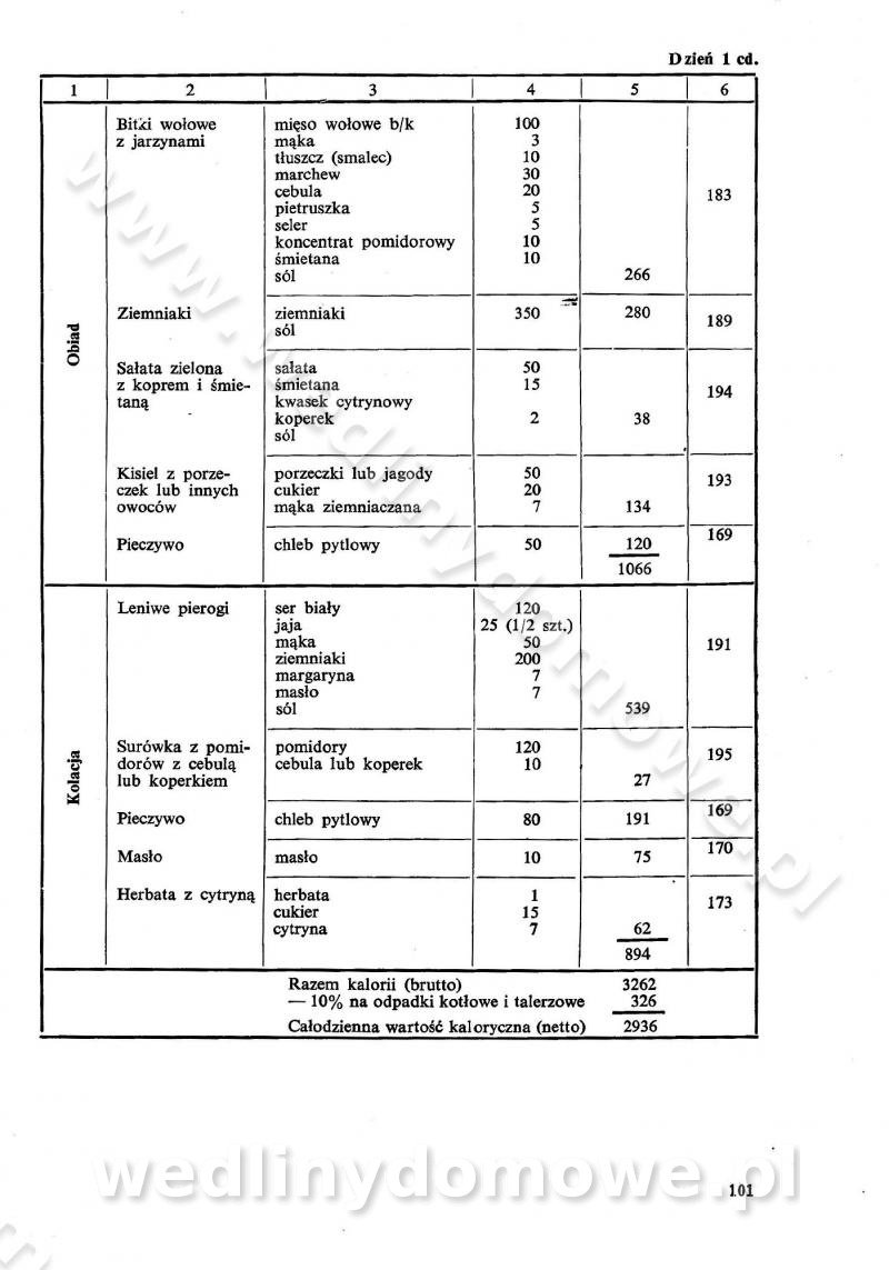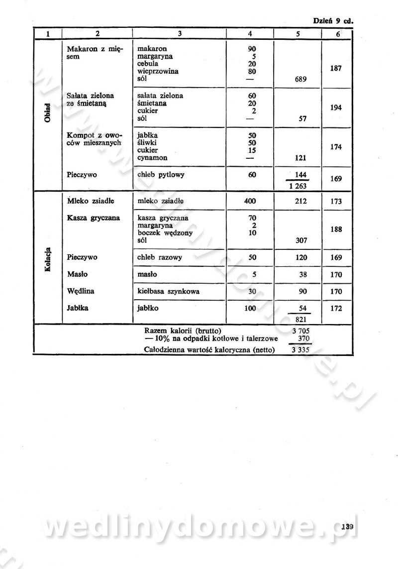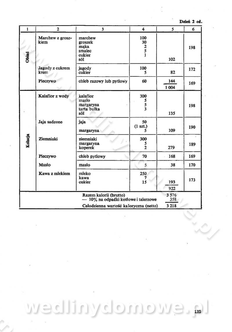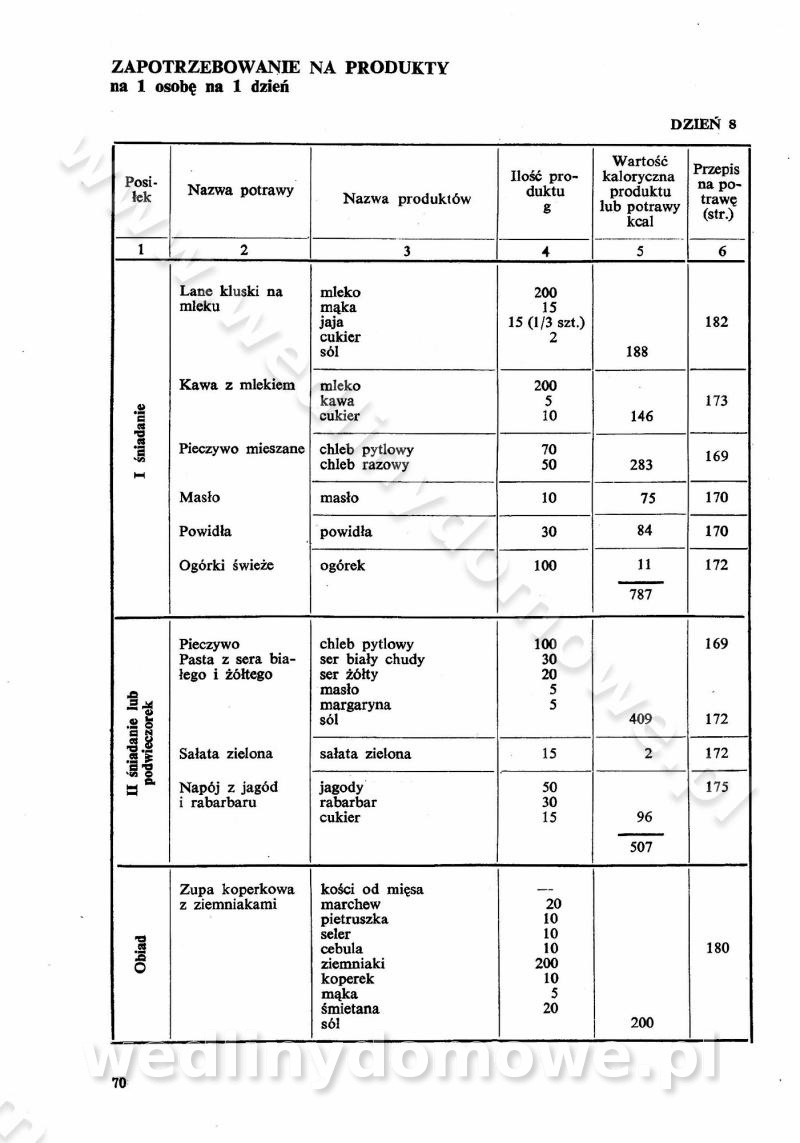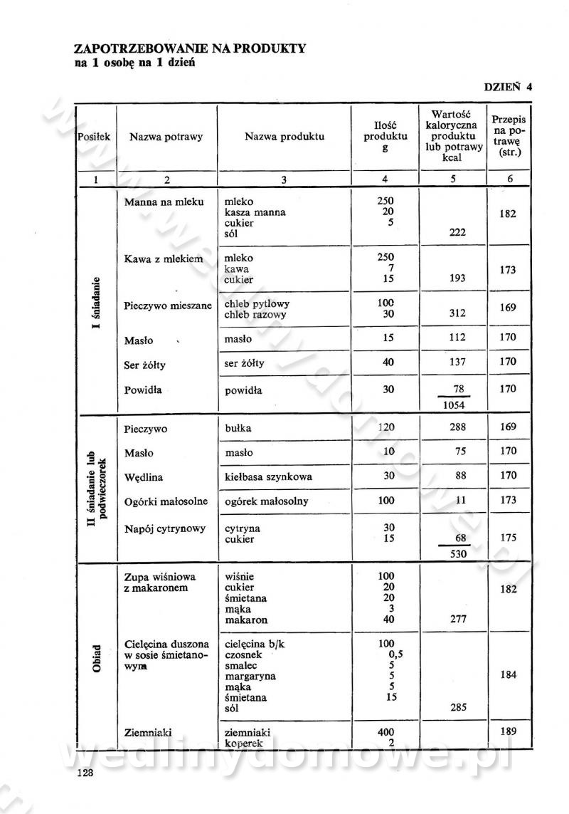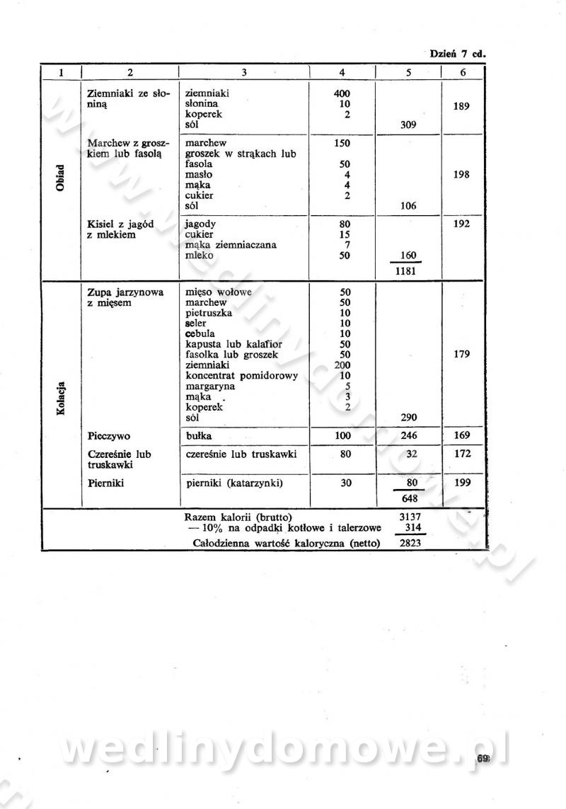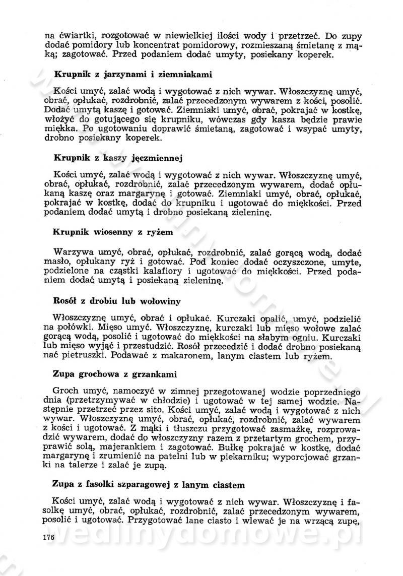 SPIS TREŚCI CZĘŚĆ I TEORETYCZNE PODSTAWY RACJONALNEGO ŻYWIENIA ZBIOROWEGO inż. Krystyna Wolf I. WSKAZÓWKI DO REALIZACJI NORM ŻYWIENIA WYRAŻONYCH W CAŁODZIENNYCH RACJACH POKARMOWYCH II. SKŁADNIKI POKARMOWE I ICH ROLA W ŻYWIENIU Zawartość składników pokarmowych w produktach Rola pożywienia Składniki pokarmowe Wzajemne zależności między składnikami pokarmowymi III. NORMY WYŻYWIENIA Normy zapotrzebowania na składniki pokarmowe Podział produktów Podział produktów na 2 grupy Podział produktów na 9 grup Podział produktów na 12 grup Całodzienne racje pokarmowe Zamiana produktów IV. WYTYCZNE PLANOWANIA ZESTAWU CAŁODZIENNYCH POSIŁKÓW Zasady podziału całodziennych racji pokarmowych na poszczególne posiłki Śniadanie Obiad Kolacja Wytyczne układania jadłospisów Kontrola prawidłowości planowania jadłospisów V. PROCESY TECHNOLOGICZNE, ICH CEL, PRZEBIEG I WPŁYW NA WARTOŚĆ ODŻYWCZĄ POTRAW Cel procesu technologicznego Obróbka wstępna i termiczna Ogólne wskazówki technologiczne Wykończanie potraw VI. WSKAZÓWKI PRAKTYCZNE DOTYCZĄCE KORZYSTANIA Z RECEPTUR CZĘŚĆ II RECEPTURY I. ZUPY inż. Jadwiga Celczyńska Podstawowe zasady sporządzania Sporządzanie wywarów Podział zup Przygotowanie głównych składników zup Wykończanie zup Rodzaje zup Zupy czyste Zupy zabielane Zupy zasmażane Zupy rozklejane Zupy mleczne Zupy owocowe Zupy z wkładką pełnowartościowego białka — samodzielne dania obiadowe lub kolacyjne Zupy czyste (normatyw surowcowy na 10 porcji) Zakwas burakowy na barszcz Zakwas na żur Barszcz burakowy czysty Barszcz czerwony czysty z zagęszczonego soku buraczanego Barszcz burakowy jarski Bulion jarski Rosół z wołowiny Zupa grzybowa czysta Zupa pomidorowa czysta Zupy rozklejane (normatyw surowcowy na 10 porcji) Krupnik na podrobach Krupnik zabielany Krupnik ze słoniną Krupnik z ryżu z jarzynami Zupa grochowa z pęczakiem Zupa grochowa z ziemniakami Zupa rumfordzka Zupa ziemniaczana z fasolą Zalewajka Zalewajka z kwaśnym mlekiem Żur z kiełbasą i boczkiem Żur na podrobach zabielany Zupy zasmażane (normatyw surowcowy na 10 porcji) Kapuśniak z kwaszonej kapusty z papryką Kapuśniak mazurski z kwaszonej kapusty Kapuśniak ze słodkiej kapusty Kapuśniak ze słodkiej kapusty z jabłkami Kapuśniak z czerwonej kapusty Zacierka z ziemniakami Zupa cebulowa Zupa z dyni i pomidorów Zupa fasolowa z makaronem Zupa fasolowa z ziemniakami Zupa z flaków wołowych Zupa „garbure” Zupa grzybowa Zupa jarzynowa z papryką Zupa jarzynowa z fasolą Zupa jarzynowa (jesienna) Zupa jarzynowa z makaronem i serem Zupa z kaszy manny zasmażana Zupa neapolitańska Zupa pomidorowa zasmażana Zupa z porów Zupa z selerów Zupa ziemniaczana zasmażana Zupa ziemniaczana z pomidorami Zupy mleczne (normatyw surowcowy na 10 porcji) Kukurydzanka na mleku Manna na mleku Ryż na mleku Makaron na mleku Płatki owsiane na mleku Zupa z dyni na mleku z tartym ciastem Zupa „nic” Zupa mleczna z lanym ciastem Zupa ze zsiadłego mleka Zupy zabielane (normatyw surowcowy na 10 porcji) Barszcz czerwony zabielany Barszcz czerwony zabielany z suszu Barszcz ukraiński Barszcz czeski Barszcz z botwiną Barszcz jarski z botwiną Chłodnik z botwiną Chłodnik z botwiną na mleku Kapuśniak ze słodkiej kapusty zabielany Kapuśniak na głowiźnie Zupa z brukselki zabielana Zupa cytrynowa Zupa z fasolki szparagowej Zupa grzybowa zabielana Zupa kalafiorowa Zupa koperkowa Zupa ogórkowa Zupa pomidorowa Zupa rybna Zupa szczawiowa Zupa pieczarkowa Zupa ze szpinaku Zupa z młodych jarzyn zabielana Zupa jarzynowa zabielana z mrożonek Zupa ziemniaczana „Paysanne” Pejzanka z puree ziemniaczanym Zupa z młodych ziemniaków Zupa ziemniaczana z porami Zupa z zielonego groszku Zupy owocowe (normatyw surowcowy na 10 porcji) Chłodnik z czarnych jagód Chłodnik truskawkowy Zupa z czarnych jagód Zupa jabłkowa Zupa jabłkowa zabielana Zupa z jabłek i śliwek Zupa ze śliwek Zupa z owoców mieszanych Zupa owocowa z suszu jabłkowego i marmolady Zupa owocowa czysta Zupa z powideł śliwkowych Zupa rabarbarowa Zupa z suszonych śliwek Zupa truskawkowa Zupa z truskawek i rabarbaru Zupy z wkładką mięsną (normatyw surowcowy na 10 porcji) Barszcz małorosyjski na rosole z mięsem Barszcz z ziemniakami i serdelkami Grochówka z mięsem i ziemniakami Kapuśniak z kwaszonej kapusty z kiełbasą Kapuśniak ze słodkiej kapusty z pomidorami i mięsem Krupnik z ryżu na mięsie Krupnik na mięsie Pejzanka na żeberkach Zupa z fasolki szparagowej na mięsie Zupa fasolowa z mięsem i makaronem Zupa jarzynowa z mięsem Gulaszowa polewka Zupa koperkowa na mięsie Zupa ogórkowa z ziemniakami na mięsie Zupa pomidorowa z makaronem i mięsem Zupa z porów z ziemniakami i wątróbką Zupa wiosenna z jajami Zupa ziemniaczana z mięsem Żur z kiełbasą i ziemniakami II. POTRAWY MIĘSNE inż. Krystyna Wolf Podstawowe zasady sporządzania Zachowanie wartości odżywczej dań mięsnych Cechy prawidłowo przyrządzonego mięsa Przechowywanie Rozmrażanie mięsa Rozbiór tuszy zwierząt rzeźnych Obróbka wstępna Obróbka termiczna Potrawy z baraniny (normatyw surowcowy na 10 porcji) Potrawka z baraniny Kotlet barani mielony Kotlet barani mielony z ryżem Baranina w warzywach Ragout baranie Baranina duszona Potrawy z cielęciny (normatyw surowcowy na 10 porcji) Potrawka cielęca Pulpety cielęce Kotlet cielęcy mielony Klopsiki cielęce do sosów Sznycel cielęcy (mielony) Filet cielęcy (do sosów i dodatków) Zrazy cielęce bite (do sosów) Zrazy cielęce nadziewane słoniną Sznycel cielęcy Zrazy cielęce po polsku (faszerowane) Paprykarz cielęcy Pieczeń cielęca duszona Pieczeń cielęca Mostek cielęcy po wiedeńsku Mostek cielęcy faszerowany Rolada cielęca faszerowana Potrawy z wieprzowiny (normatyw surowcowy na 10 porcji) Mięso wieprzowe gotowane Peklówka wieprzowa gotowana Filet wieprzowy saute Kotlet wieprzowy mielony Zraz wieprzowy (klopsik) mielony do sosów Kotlet miel