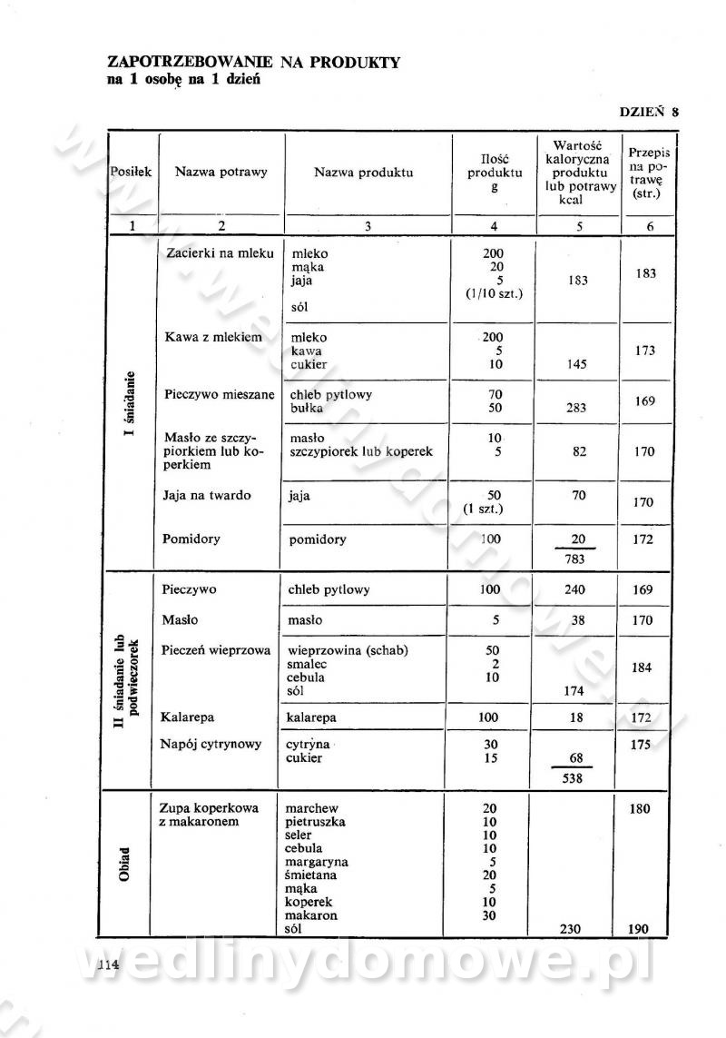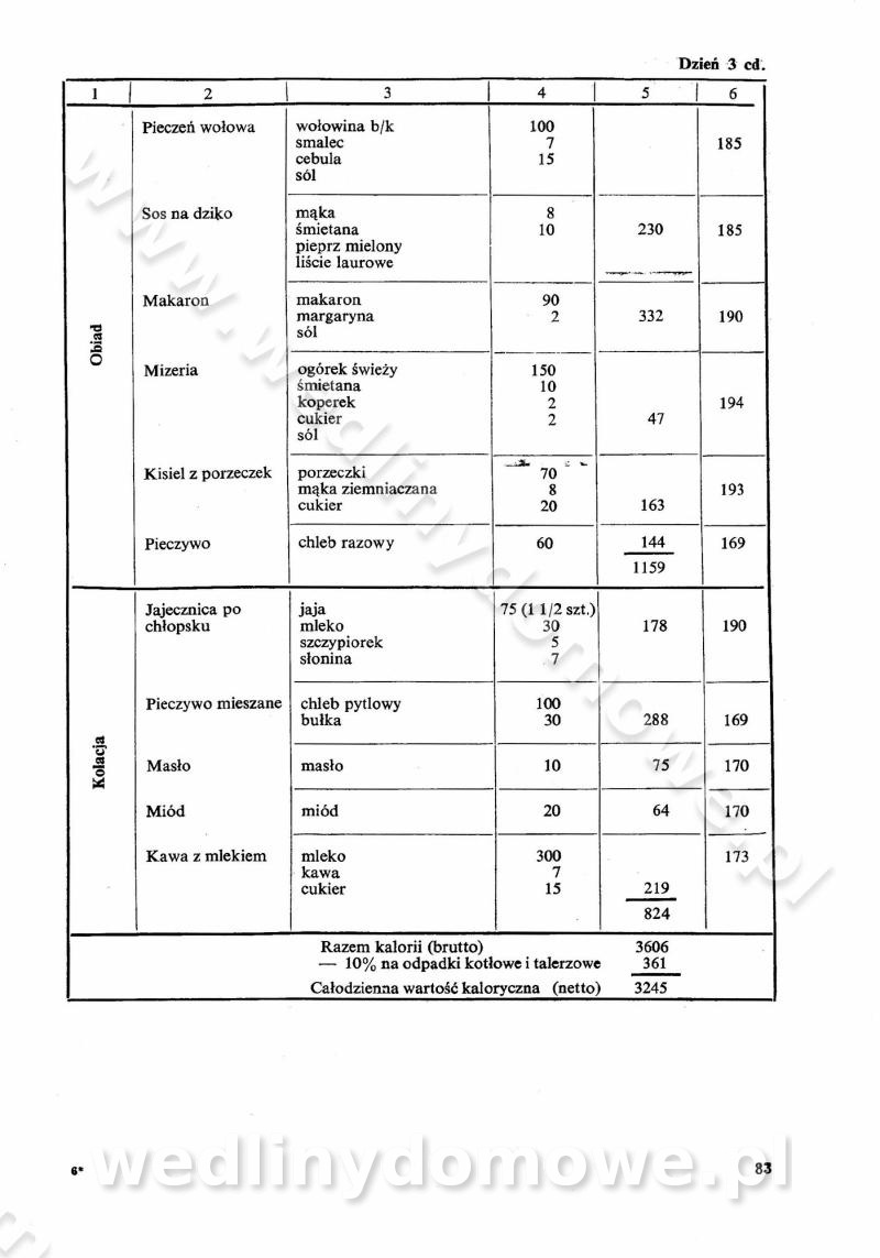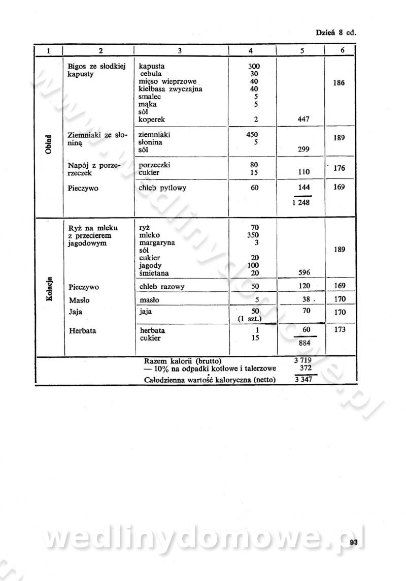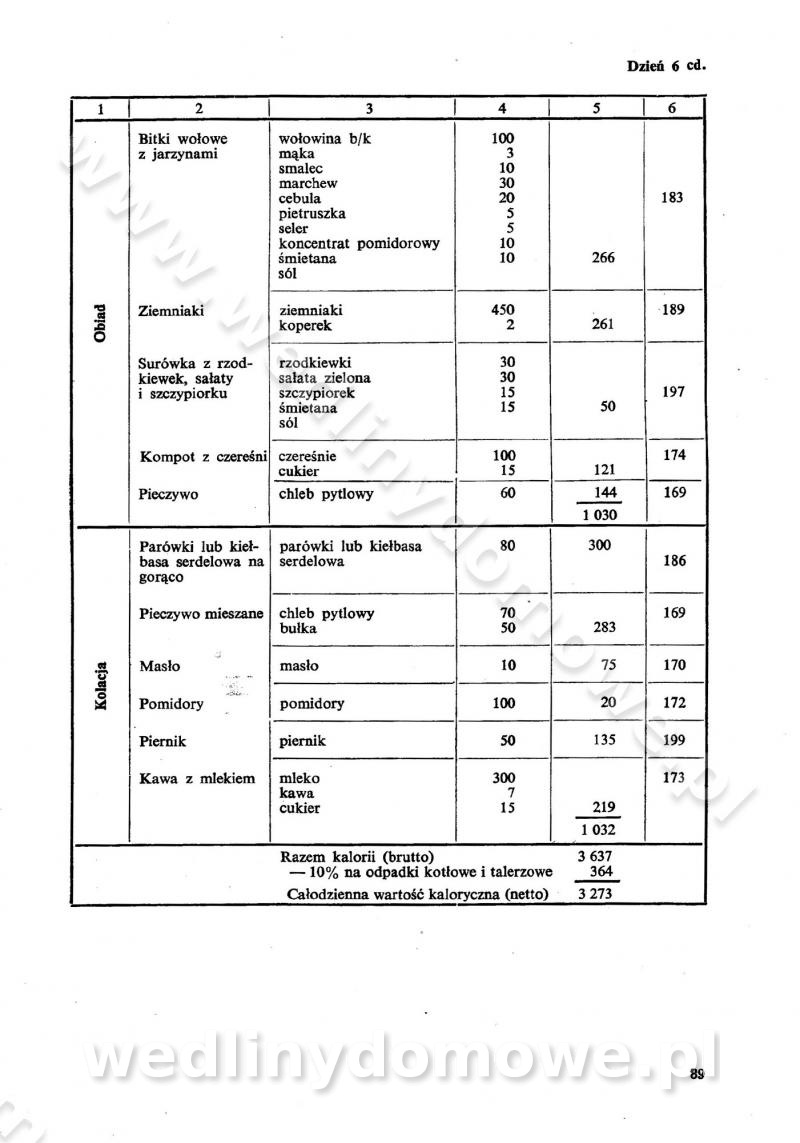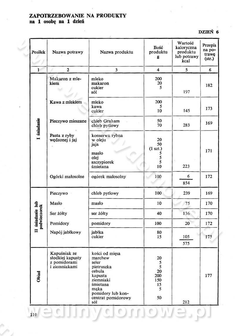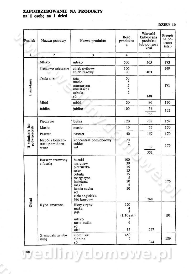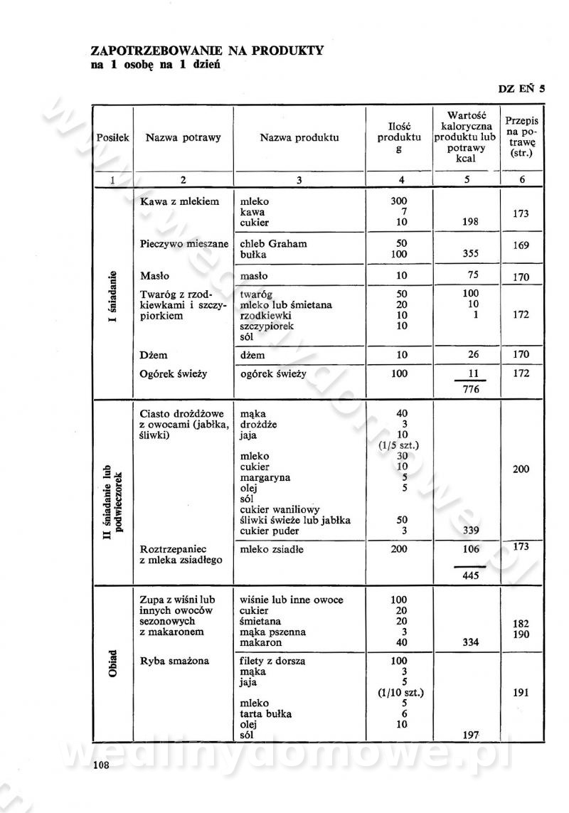 SPIS TREŚCI CZĘŚĆ I TEORETYCZNE PODSTAWY RACJONALNEGO ŻYWIENIA ZBIOROWEGO inż. Krystyna Wolf I. WSKAZÓWKI DO REALIZACJI NORM ŻYWIENIA WYRAŻONYCH W CAŁODZIENNYCH RACJACH POKARMOWYCH II. SKŁADNIKI POKARMOWE I ICH ROLA W ŻYWIENIU Zawartość składników pokarmowych w produktach Rola pożywienia Składniki pokarmowe Wzajemne zależności między składnikami pokarmowymi III. NORMY WYŻYWIENIA Normy zapotrzebowania na składniki pokarmowe Podział produktów Podział produktów na 2 grupy Podział produktów na 9 grup Podział produktów na 12 grup Całodzienne racje pokarmowe Zamiana produktów IV. WYTYCZNE PLANOWANIA ZESTAWU CAŁODZIENNYCH POSIŁKÓW Zasady podziału całodziennych racji pokarmowych na poszczególne posiłki Śniadanie Obiad Kolacja Wytyczne układania jadłospisów Kontrola prawidłowości planowania jadłospisów V. PROCESY TECHNOLOGICZNE, ICH CEL, PRZEBIEG I WPŁYW NA WARTOŚĆ ODŻYWCZĄ POTRAW Cel procesu technologicznego Obróbka wstępna i termiczna Ogólne wskazówki technologiczne Wykończanie potraw VI. WSKAZÓWKI PRAKTYCZNE DOTYCZĄCE KORZYSTANIA Z RECEPTUR CZĘŚĆ II RECEPTURY I. ZUPY inż. Jadwiga Celczyńska Podstawowe zasady sporządzania Sporządzanie wywarów Podział zup Przygotowanie głównych składników zup Wykończanie zup Rodzaje zup Zupy czyste Zupy zabielane Zupy zasmażane Zupy rozklejane Zupy mleczne Zupy owocowe Zupy z wkładką pełnowartościowego białka — samodzielne dania obiadowe lub kolacyjne Zupy czyste (normatyw surowcowy na 10 porcji) Zakwas burakowy na barszcz Zakwas na żur Barszcz burakowy czysty Barszcz czerwony czysty z zagęszczonego soku buraczanego Barszcz burakowy jarski Bulion jarski Rosół z wołowiny Zupa grzybowa czysta Zupa pomidorowa czysta Zupy rozklejane (normatyw surowcowy na 10 porcji) Krupnik na podrobach Krupnik zabielany Krupnik ze słoniną Krupnik z ryżu z jarzynami Zupa grochowa z pęczakiem Zupa grochowa z ziemniakami Zupa rumfordzka Zupa ziemniaczana z fasolą Zalewajka Zalewajka z kwaśnym mlekiem Żur z kiełbasą i boczkiem Żur na podrobach zabielany Zupy zasmażane (normatyw surowcowy na 10 porcji) Kapuśniak z kwaszonej kapusty z papryką Kapuśniak mazurski z kwaszonej kapusty Kapuśniak ze słodkiej kapusty Kapuśniak ze słodkiej kapusty z jabłkami Kapuśniak z czerwonej kapusty Zacierka z ziemniakami Zupa cebulowa Zupa z dyni i pomidorów Zupa fasolowa z makaronem Zupa fasolowa z ziemniakami Zupa z flaków wołowych Zupa „garbure” Zupa grzybowa Zupa jarzynowa z papryką Zupa jarzynowa z fasolą Zupa jarzynowa (jesienna) Zupa jarzynowa z makaronem i serem Zupa z kaszy manny zasmażana Zupa neapolitańska Zupa pomidorowa zasmażana Zupa z porów Zupa z selerów Zupa ziemniaczana zasmażana Zupa ziemniaczana z pomidorami Zupy mleczne (normatyw surowcowy na 10 porcji) Kukurydzanka na mleku Manna na mleku Ryż na mleku Makaron na mleku Płatki owsiane na mleku Zupa z dyni na mleku z tartym ciastem Zupa „nic” Zupa mleczna z lanym ciastem Zupa ze zsiadłego mleka Zupy zabielane (normatyw surowcowy na 10 porcji) Barszcz czerwony zabielany Barszcz czerwony zabielany z suszu Barszcz ukraiński Barszcz czeski Barszcz z botwiną Barszcz jarski z botwiną Chłodnik z botwiną Chłodnik z botwiną na mleku Kapuśniak ze słodkiej kapusty zabielany Kapuśniak na głowiźnie Zupa z brukselki zabielana Zupa cytrynowa Zupa z fasolki szparagowej Zupa grzybowa zabielana Zupa kalafiorowa Zupa koperkowa Zupa ogórkowa Zupa pomidorowa Zupa rybna Zupa szczawiowa Zupa pieczarkowa Zupa ze szpinaku Zupa z młodych jarzyn zabielana Zupa jarzynowa zabielana z mrożonek Zupa ziemniaczana „Paysanne” Pejzanka z puree ziemniaczanym Zupa z młodych ziemniaków Zupa ziemniaczana z porami Zupa z zielonego groszku Zupy owocowe (normatyw surowcowy na 10 porcji) Chłodnik z czarnych jagód Chłodnik truskawkowy Zupa z czarnych jagód Zupa jabłkowa Zupa jabłkowa zabielana Zupa z jabłek i śliwek Zupa ze śliwek Zupa z owoców mieszanych Zupa owocowa z suszu jabłkowego i marmolady Zupa owocowa czysta Zupa z powideł śliwkowych Zupa rabarbarowa Zupa z suszonych śliwek Zupa truskawkowa Zupa z truskawek i rabarbaru Zupy z wkładką mięsną (normatyw surowcowy na 10 porcji) Barszcz małorosyjski na rosole z mięsem Barszcz z ziemniakami i serdelkami Grochówka z mięsem i ziemniakami Kapuśniak z kwaszonej kapusty z kiełbasą Kapuśniak ze słodkiej kapusty z pomidorami i mięsem Krupnik z ryżu na mięsie Krupnik na mięsie Pejzanka na żeberkach Zupa z fasolki szparagowej na mięsie Zupa fasolowa z mięsem i makaronem Zupa jarzynowa z mięsem Gulaszowa polewka Zupa koperkowa na mięsie Zupa ogórkowa z ziemniakami na mięsie Zupa pomidorowa z makaronem i mięsem Zupa z porów z ziemniakami i wątróbką Zupa wiosenna z jajami Zupa ziemniaczana z mięsem Żur z kiełbasą i ziemniakami II. POTRAWY MIĘSNE inż. Krystyna Wolf Podstawowe zasady sporządzania Zachowanie wartości odżywczej dań mięsnych Cechy prawidłowo przyrządzonego mięsa Przechowywanie Rozmrażanie mięsa Rozbiór tuszy zwierząt rzeźnych Obróbka wstępna Obróbka termiczna Potrawy z baraniny (normatyw surowcowy na 10 porcji) Potrawka z baraniny Kotlet barani mielony Kotlet barani mielony z ryżem Baranina w warzywach Ragout baranie Baranina duszona Potrawy z cielęciny (normatyw surowcowy na 10 porcji) Potrawka cielęca Pulpety cielęce Kotlet cielęcy mielony Klopsiki cielęce do sosów Sznycel cielęcy (mielony) Filet cielęcy (do sosów i dodatków) Zrazy cielęce bite (do sosów) Zrazy cielęce nadziewane słoniną Sznycel cielęcy Zrazy cielęce po polsku (faszerowane) Paprykarz cielęcy Pieczeń cielęca duszona Pieczeń cielęca Mostek cielęcy po wiedeńsku Mostek cielęcy faszerowany Rolada cielęca faszerowana Potrawy z wieprzowiny (normatyw surowcowy na 10 porcji) Mięso wieprzowe gotowane Peklówka wieprzowa gotowana Filet wieprzowy saute Kotlet wieprzowy mielony Zraz wieprzowy (klopsik) mielony do sosów Kotlet miel