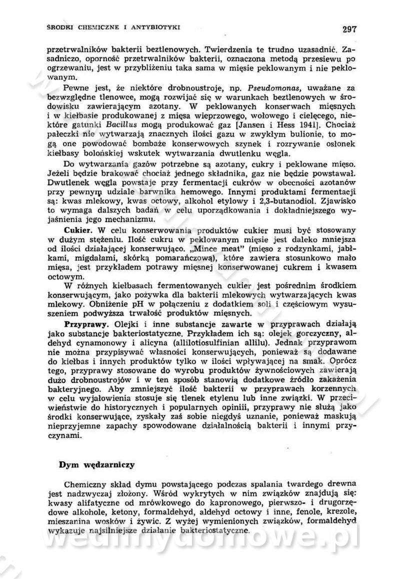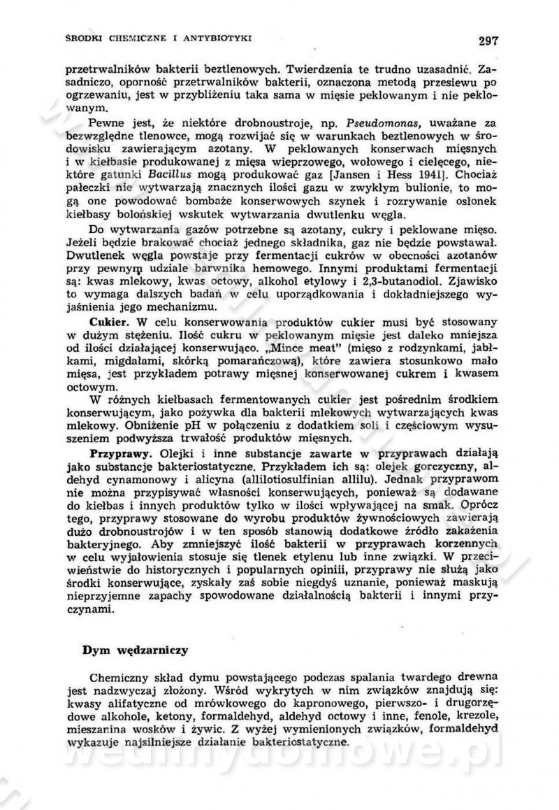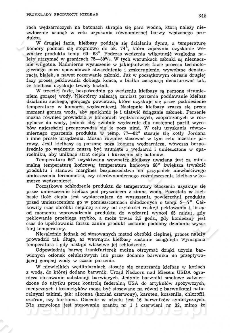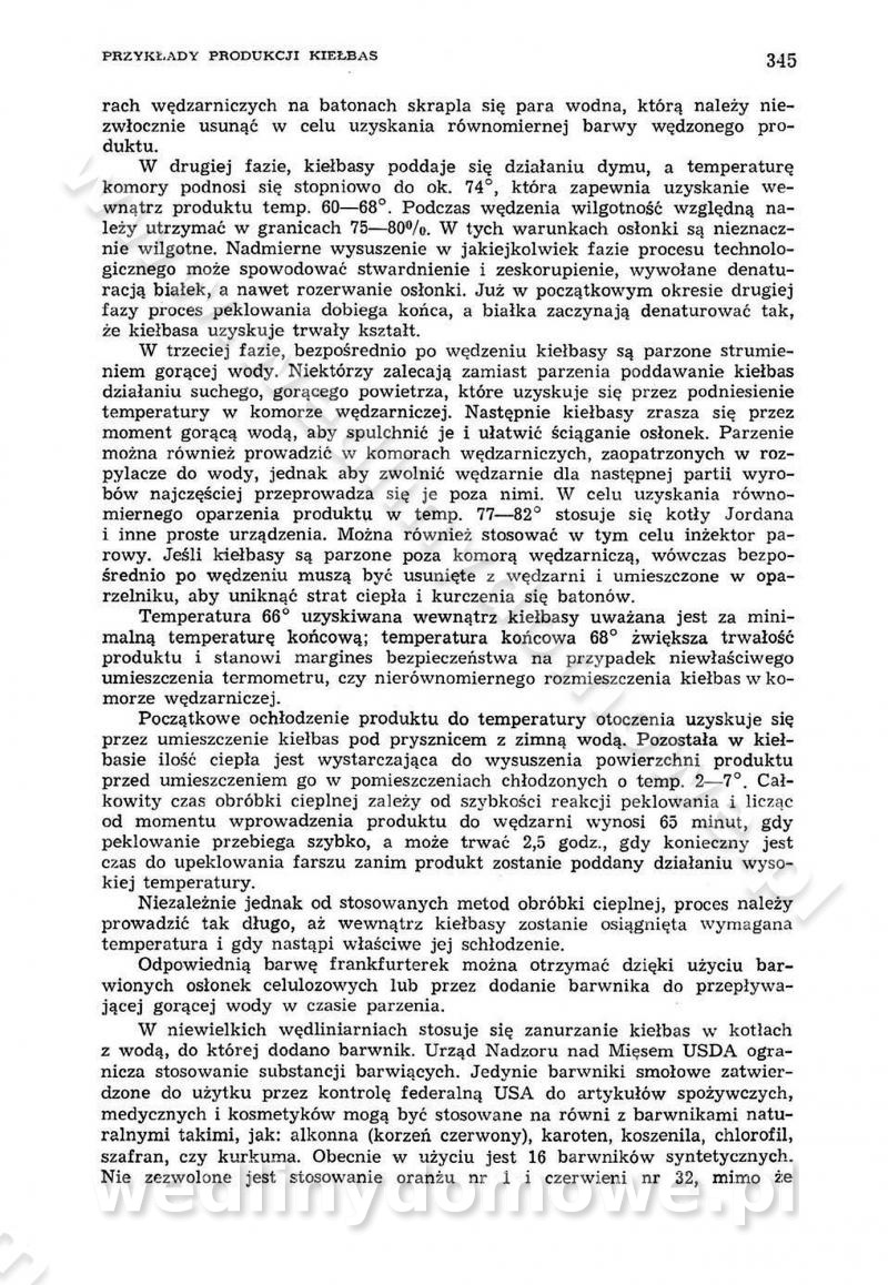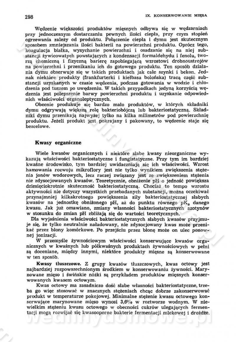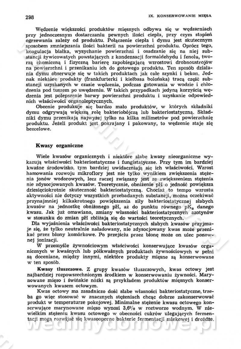 Urządzenia do wędzenia płynnymi preparatami dymu wędzarniczego Omówione wcześniej metody wytwarzania dymu wędzarniczego: tradycyjne, żarowe, cierne czy też parowe oraz sposoby doprowadzenia do komory czy rozprowadzenia dymu w komorze nie pozwalają na dokładną ocenę, jakie lotne produkty termicznego rozkładu materiału dymotwórczego i w jakich ilościach przedyfundują do produktu wędzonego. Możliwość taką daje zastosowanie preparatów dymu wędzarniczego o dokładnie określonym składzie chemicznym i stałym dla konkretnego preparatu. Preparat wędzący starannie dobiera się w zależności od tego, jakie cechy sensoryczne chcemy nadać wędzonej żywności. Podobnie jak dym wędzarniczy wytwarzany metodami tradycyjnymi, preparaty dymu wędzarniczego wykazują podobne właściwości barwiące, aromatyzujące, bakteriobójcze i antyoksydacyjne (Borys, 2005a). Sposób wytwarzania preparatów dymu wędzarniczego umożliwia uzyskanie preparatów niezawierających substancji smolistych, mutagennych i kancerogennych węglowodorów policyklicznych (Borys i Piotrowski, 1997; Pijanowski i in., 1996; Sikorski, 1980). Stwarza też możliwość nadawania im różnych aromatów dymnych o różnym stopniu kondensacji oraz wzbogacania o składniki mineralne, takie jak wapń, magnez, sód czy potas. Podstawowy skład chemiczny płynnego preparatu dymu wędzarniczego stanowią: woda 40-70%, kwas octowy 4-12%, kwas mrówkowy 0,5-3,5%, aldehyd glikolowy 1,7-5%, formaldehyd 0,5-12%, glioksal do 1,2%, acetol 2-5% i smoły do 12% (Borys, 2005, 2005a). Płynne preparaty dymu są w praktyce stosowane poprzez: rozpylanie w komorze wędzarniczej (tzw. atomizacja),natryskiwanie,zanurzanie,dodanie do mieszanki peklującej,bezpośrednie dodanie do farszu,odparowanie płynnego dymu na gorących powierzchniach komory wędzarniczej,powlekanie preparatem wędzarniczym wewnętrznych powierzchni sztucznych osłonek przetworów mięsnych.W przypadku rozpylania płynnego dymu ważne jest utrzymanie takich parametrów procesu, jak: odpowiednia koncentracja preparatu dymu,temperatura roztworu preparatu dymu,czas jego kontaktu z wędzonym produktem.Proces atomizacji polega na jednoczesnym podawaniu pod ciśnieniem 0,4 do 0,6 MPa do komory wędzarniczej mieszaniny płynnego dymu i powietrza. W komorze wędzarniczej tworzy się chmura aerozolu, którego cząstki fazy rozproszonej o średnicy 0,1-0,5 µm osiadają na powierzchni produktu i łatwiej dyfundują do jego wewnętrznych warstw. Proces atomizacji prowadzi się w szczelnych komorach wędzarniczych przy wyłączonej cyrkulacji powietrza. W trakcie pełnego cyklu wędzenia natrysk aerozolem następuje tuż po procesie podsuszania, czyli w momencie, gdy podczas tradycyjnego procesu wędzenia doprowadzany jest do komory świeży dym z generatora. Jest to etap procesu wędzenia w nowoczesnych komorach wędzarniczych i jako takim z łatwością steruje się automatycznie. O skuteczności procesu osiadania i dyfuzji preparatu decyduje wielkość cząstek fazy rozproszonej. Zaletami rozpylania płynnego dymu w urządzeniu wędzarniczym są: powtarzalność jakości wędzonego produktu,równomiernie rozłożony kolor oraz smak produktu po wędzeniu,zmniejszenie ubytku wagi produktu wędzonego o około 1-2%,obniżenie emisji dymu do środowiska,skrócenie czasu czyszczenia komór wędzarniczych, a w konsekwencji obniżenie kosztów procesu,wzrost wydajności urządzeń wędzarniczych,poprawa warunków higienicznych w wędzarni,mały koszt urządzeń do atomizacji i natrysku,zmniejszenie ryzyka powstania pożaru i wybuchu.Oprócz wymienionych już zalet zastosowania płynnego dymu przy rozpylaniu, procesy natryskiwania i zanurzania mają tę zaletę, że czas produkcji wędzonych wyrobów może zostać znacznie skrócony. Czas wędzenia skraca się o 1-2 min w stosunku do metod wędzenia dymem otrzymanym metodą termicznego rozkładu drewna. Metoda natryskowa polega na naniesieniu płynnego dymu, stosując dysze; w przypadku skraplania stosuje się sufitowy natrysk poprzez perforowane blachy. W małych zakładach proces natryskiwania prowadzi się ręcznie za pomocą pistoletu natryskowego. Po procesie natryskiwania nadmiar dymu odpływa z powrotem do zbiornika i jest ponownie wykorzystywany. Metoda immersyjna polega na zanurzaniu wędzonego produktu w roztworze wodnym preparatu dymu wędzarniczego. Kolejną metodą wytwarzania aerozolu jest odparowanie nakrapianego płynnego dymu na gorących powierzchniach komory wędzarniczej. Metodę tę cechuje równomierne rozprzestrzenianie dymu w komorze wędzarniczej. Współczesne metody nastrzykiwania surowców mięsnych solankami peklującymi umożliwiają dodanie preparatu dymu do roztworu wodnego mieszanki peklującej i wraz z nim wprowadzenie aromatu wędzarniczego do produktu. W celu uniknięcia reakcji ubocznych ze składnikami solanki peklującej stosuje się tylko takie produkty aromatów dymnych, które mają obojętne pH. Zastosowanie preparatów dymu w solance peklującej umożliwia równomierne aromatyzowanie wyrobów peklowanych na surowo. Przy produkcji wędlin preparaty dymu na bazie wody, oleju lub na nośnikach stałych (sól kuchenna) mogą być dodawane bezpośrednio do farszu. Jedną z nowszych metod jest stosowanie sztucznych osłonek do przetworów mięsnych z wewnętrzną warstwą powlekaną preparatem wędzarniczym. Z ekologicznego punktu widzenia metoda ta jest najbardziej przyjazna środowisku ze względu na brak zanieczyszczenia składnikami dymu powietrza oraz ścieków. Czas wędzenia decyduje o przejściu czynnika wędzarniczego z atmosfery wędzenia do wędzonego produktu i tym samym odgrywa ważną rolę przy przenikaniu dymu. Nowoczesne komory wędzarnicze można łatwo przestawić na proces wędzenia z zastosowaniem płynnego dymu. Warunkiem decydującym o skuteczności zastosowania płynnego dymu jest możliwość całkowitego zamknięcia urządzenia wędzarniczego. Tak samo jak w p