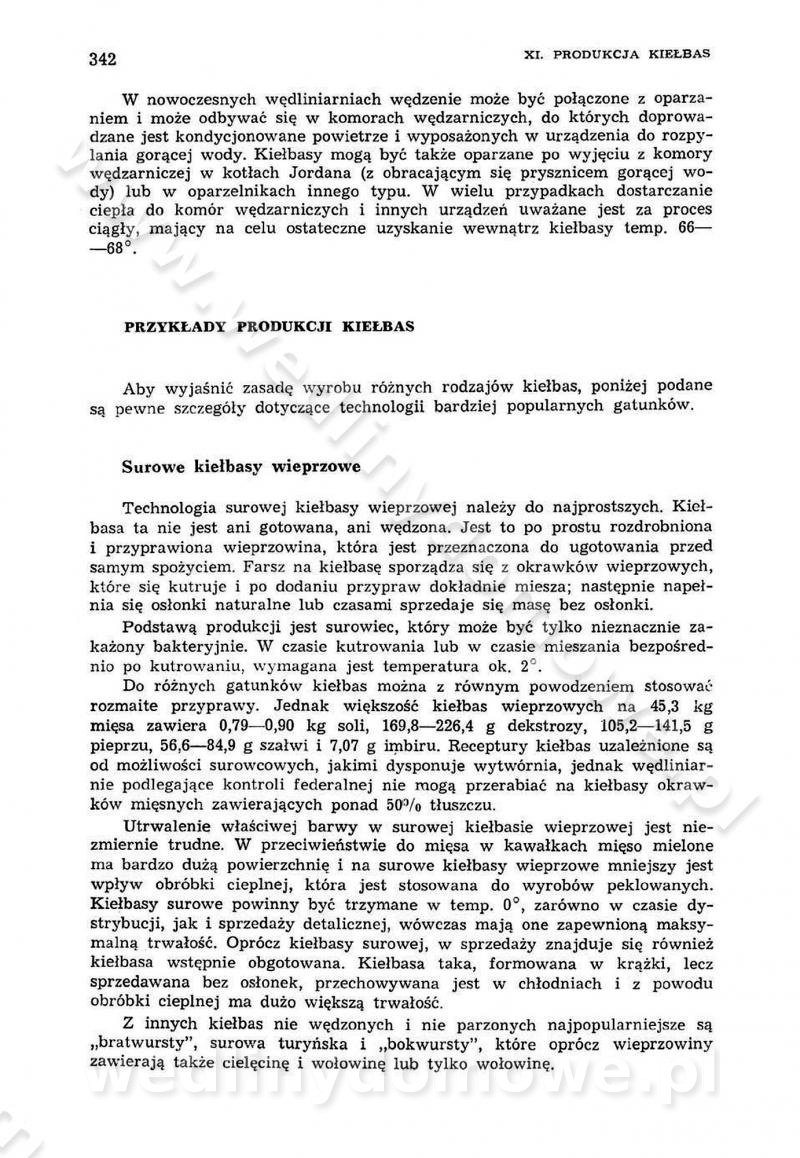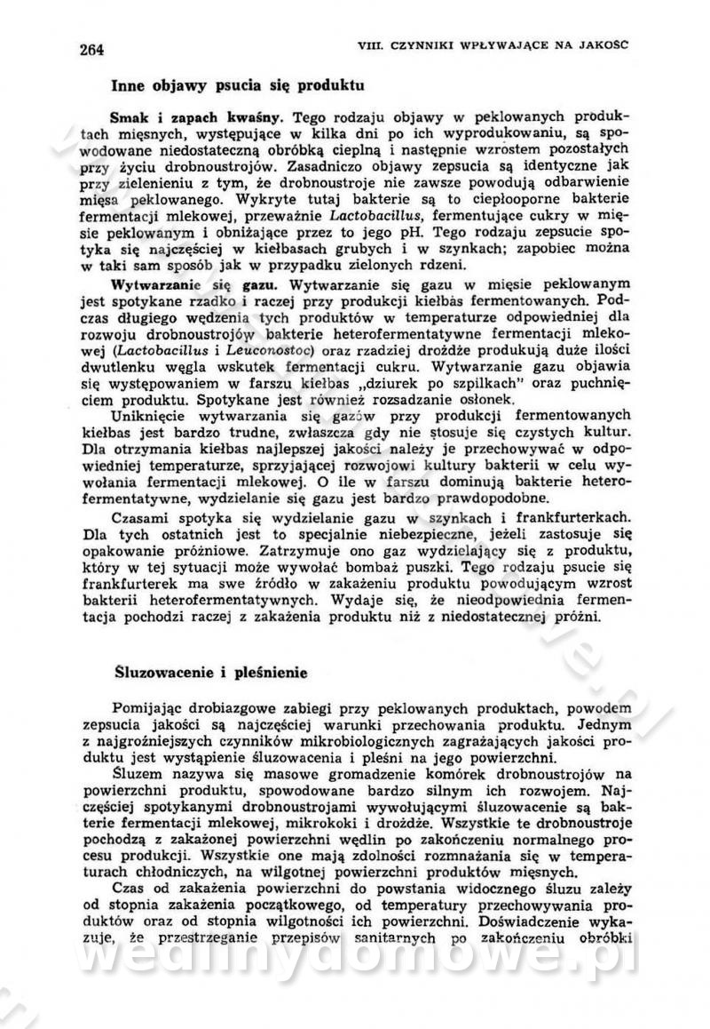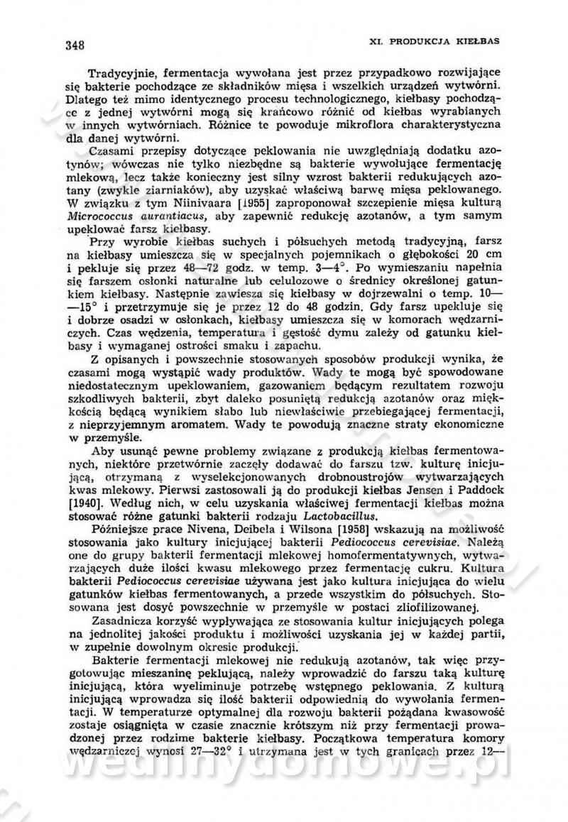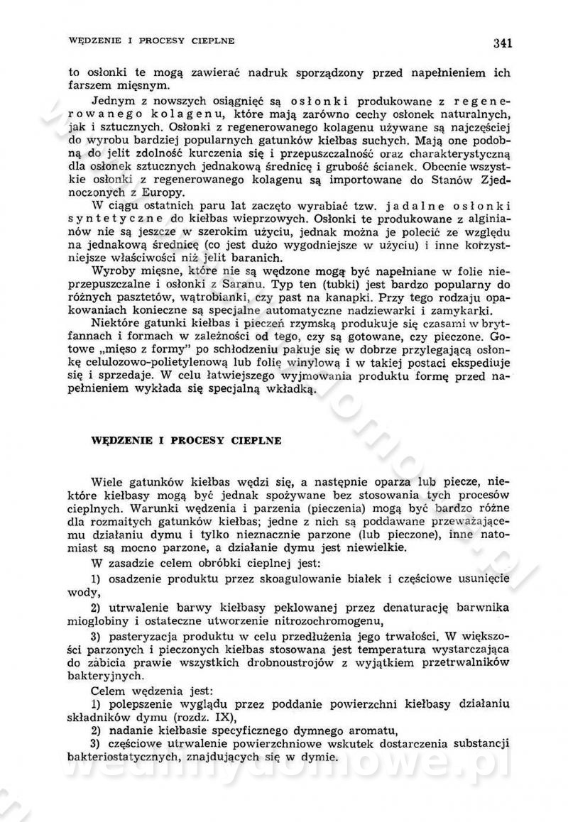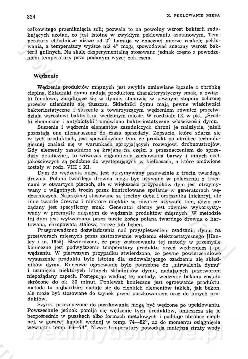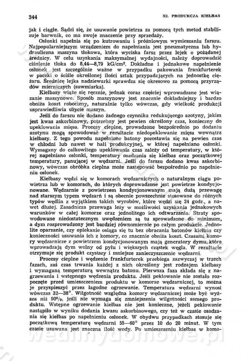 Urządzenia do wędzenia płynnymi preparatami dymu wędzarniczego Omówione wcześniej metody wytwarzania dymu wędzarniczego: tradycyjne, żarowe, cierne czy też parowe oraz sposoby doprowadzenia do komory czy rozprowadzenia dymu w komorze nie pozwalają na dokładną ocenę, jakie lotne produkty termicznego rozkładu materiału dymotwórczego i w jakich ilościach przedyfundują do produktu wędzonego. Możliwość taką daje zastosowanie preparatów dymu wędzarniczego o dokładnie określonym składzie chemicznym i stałym dla konkretnego preparatu. Preparat wędzący starannie dobiera się w zależności od tego, jakie cechy sensoryczne chcemy nadać wędzonej żywności. Podobnie jak dym wędzarniczy wytwarzany metodami tradycyjnymi, preparaty dymu wędzarniczego wykazują podobne właściwości barwiące, aromatyzujące, bakteriobójcze i antyoksydacyjne (Borys, 2005a). Sposób wytwarzania preparatów dymu wędzarniczego umożliwia uzyskanie preparatów niezawierających substancji smolistych, mutagennych i kancerogennych węglowodorów policyklicznych (Borys i Piotrowski, 1997; Pijanowski i in., 1996; Sikorski, 1980). Stwarza też możliwość nadawania im różnych aromatów dymnych o różnym stopniu kondensacji oraz wzbogacania o składniki mineralne, takie jak wapń, magnez, sód czy potas. Podstawowy skład chemiczny płynnego preparatu dymu wędzarniczego stanowią: woda 40-70%, kwas octowy 4-12%, kwas mrówkowy 0,5-3,5%, aldehyd glikolowy 1,7-5%, formaldehyd 0,5-12%, glioksal do 1,2%, acetol 2-5% i smoły do 12% (Borys, 2005, 2005a). Płynne preparaty dymu są w praktyce stosowane poprzez: rozpylanie w komorze wędzarniczej (tzw. atomizacja),natryskiwanie,zanurzanie,dodanie do mieszanki peklującej,bezpośrednie dodanie do farszu,odparowanie płynnego dymu na gorących powierzchniach komory wędzarniczej,powlekanie preparatem wędzarniczym wewnętrznych powierzchni sztucznych osłonek przetworów mięsnych.W przypadku rozpylania płynnego dymu ważne jest utrzymanie takich parametrów procesu, jak: odpowiednia koncentracja preparatu dymu,temperatura roztworu preparatu dymu,czas jego kontaktu z wędzonym produktem.Proces atomizacji polega na jednoczesnym podawaniu pod ciśnieniem 0,4 do 0,6 MPa do komory wędzarniczej mieszaniny płynnego dymu i powietrza. W komorze wędzarniczej tworzy się chmura aerozolu, którego cząstki fazy rozproszonej o średnicy 0,1-0,5 µm osiadają na powierzchni produktu i łatwiej dyfundują do jego wewnętrznych warstw. Proces atomizacji prowadzi się w szczelnych komorach wędzarniczych przy wyłączonej cyrkulacji powietrza. W trakcie pełnego cyklu wędzenia natrysk aerozolem następuje tuż po procesie podsuszania, czyli w momencie, gdy podczas tradycyjnego procesu wędzenia doprowadzany jest do komory świeży dym z generatora. Jest to etap procesu wędzenia w nowoczesnych komorach wędzarniczych i jako takim z łatwością steruje się automatycznie. O skuteczności procesu osiadania i dyfuzji preparatu decyduje wielkość cząstek fazy rozproszonej. Zaletami rozpylania płynnego dymu w urządzeniu wędzarniczym są: powtarzalność jakości wędzonego produktu,równomiernie rozłożony kolor oraz smak produktu po wędzeniu,zmniejszenie ubytku wagi produktu wędzonego o około 1-2%,obniżenie emisji dymu do środowiska,skrócenie czasu czyszczenia komór wędzarniczych, a w konsekwencji obniżenie kosztów procesu,wzrost wydajności urządzeń wędzarniczych,poprawa warunków higienicznych w wędzarni,mały koszt urządzeń do atomizacji i natrysku,zmniejszenie ryzyka powstania pożaru i wybuchu.Oprócz wymienionych już zalet zastosowania płynnego dymu przy rozpylaniu, procesy natryskiwania i zanurzania mają tę zaletę, że czas produkcji wędzonych wyrobów może zostać znacznie skrócony. Czas wędzenia skraca się o 1-2 min w stosunku do metod wędzenia dymem otrzymanym metodą termicznego rozkładu drewna. Metoda natryskowa polega na naniesieniu płynnego dymu, stosując dysze; w przypadku skraplania stosuje się sufitowy natrysk poprzez perforowane blachy. W małych zakładach proces natryskiwania prowadzi się ręcznie za pomocą pistoletu natryskowego. Po procesie natryskiwania nadmiar dymu odpływa z powrotem do zbiornika i jest ponownie wykorzystywany. Metoda immersyjna polega na zanurzaniu wędzonego produktu w roztworze wodnym preparatu dymu wędzarniczego. Kolejną metodą wytwarzania aerozolu jest odparowanie nakrapianego płynnego dymu na gorących powierzchniach komory wędzarniczej. Metodę tę cechuje równomierne rozprzestrzenianie dymu w komorze wędzarniczej. Współczesne metody nastrzykiwania surowców mięsnych solankami peklującymi umożliwiają dodanie preparatu dymu do roztworu wodnego mieszanki peklującej i wraz z nim wprowadzenie aromatu wędzarniczego do produktu. W celu uniknięcia reakcji ubocznych ze składnikami solanki peklującej stosuje się tylko takie produkty aromatów dymnych, które mają obojętne pH. Zastosowanie preparatów dymu w solance peklującej umożliwia równomierne aromatyzowanie wyrobów peklowanych na surowo. Przy produkcji wędlin preparaty dymu na bazie wody, oleju lub na nośnikach stałych (sól kuchenna) mogą być dodawane bezpośrednio do farszu. Jedną z nowszych metod jest stosowanie sztucznych osłonek do przetworów mięsnych z wewnętrzną warstwą powlekaną preparatem wędzarniczym. Z ekologicznego punktu widzenia metoda ta jest najbardziej przyjazna środowisku ze względu na brak zanieczyszczenia składnikami dymu powietrza oraz ścieków. Czas wędzenia decyduje o przejściu czynnika wędzarniczego z atmosfery wędzenia do wędzonego produktu i tym samym odgrywa ważną rolę przy przenikaniu dymu. Nowoczesne komory wędzarnicze można łatwo przestawić na proces wędzenia z zastosowaniem płynnego dymu. Warunkiem decydującym o skuteczności zastosowania płynnego dymu jest możliwość całkowitego zamknięcia urządzenia wędzarniczego. Tak samo jak w p