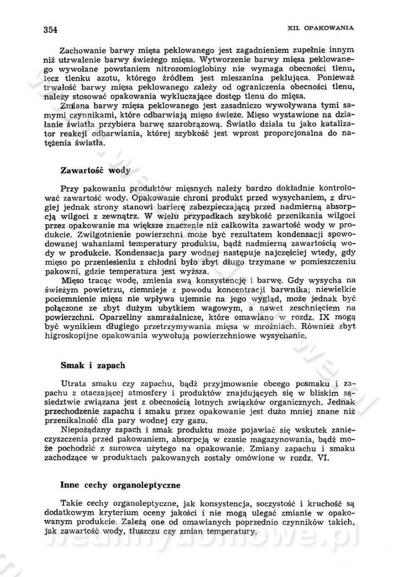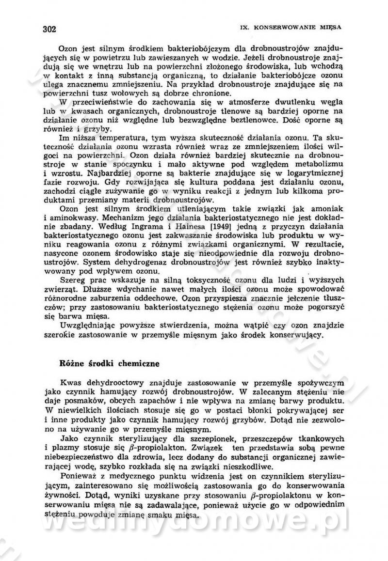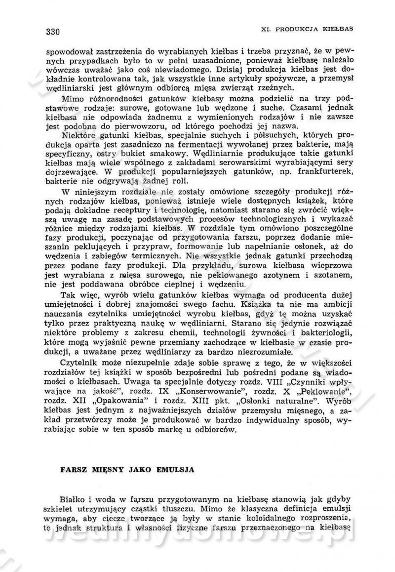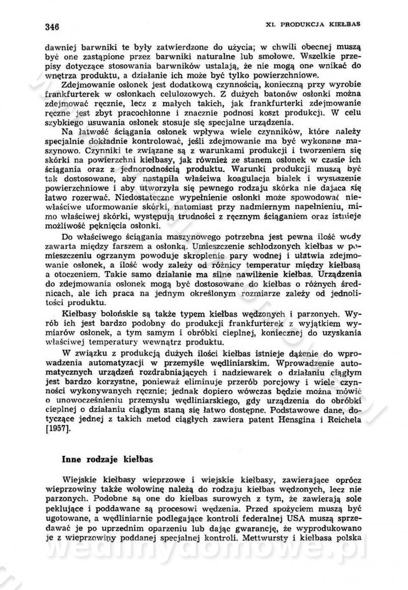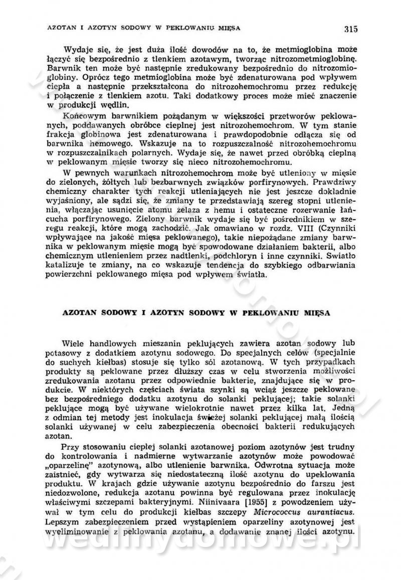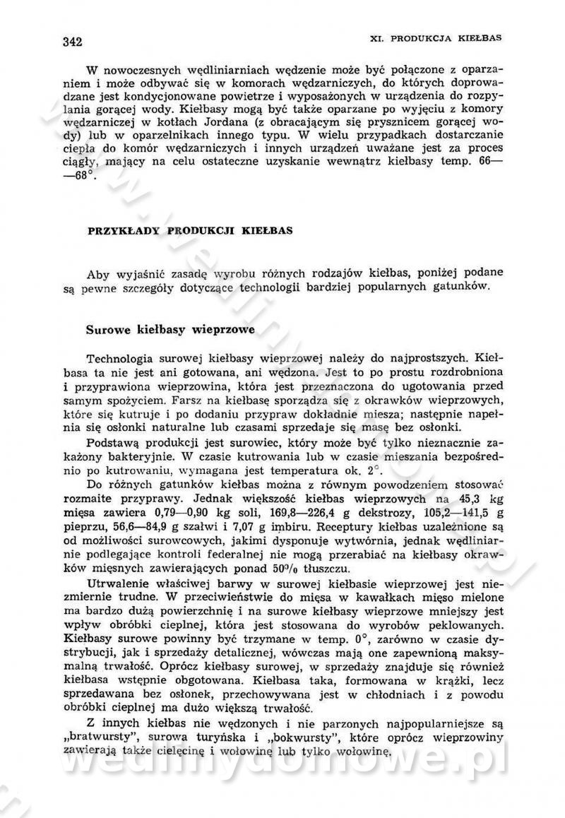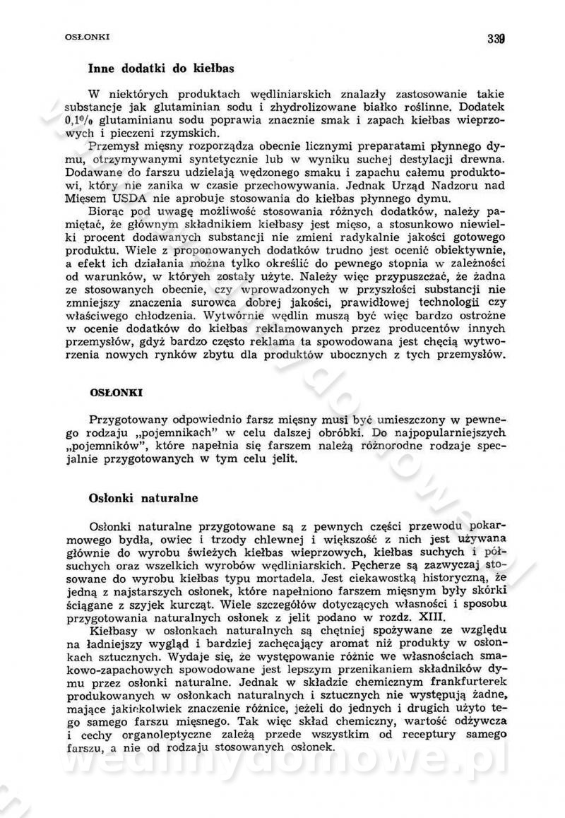 Urządzenia do wędzenia płynnymi preparatami dymu wędzarniczego Omówione wcześniej metody wytwarzania dymu wędzarniczego: tradycyjne, żarowe, cierne czy też parowe oraz sposoby doprowadzenia do komory czy rozprowadzenia dymu w komorze nie pozwalają na dokładną ocenę, jakie lotne produkty termicznego rozkładu materiału dymotwórczego i w jakich ilościach przedyfundują do produktu wędzonego. Możliwość taką daje zastosowanie preparatów dymu wędzarniczego o dokładnie określonym składzie chemicznym i stałym dla konkretnego preparatu. Preparat wędzący starannie dobiera się w zależności od tego, jakie cechy sensoryczne chcemy nadać wędzonej żywności. Podobnie jak dym wędzarniczy wytwarzany metodami tradycyjnymi, preparaty dymu wędzarniczego wykazują podobne właściwości barwiące, aromatyzujące, bakteriobójcze i antyoksydacyjne (Borys, 2005a). Sposób wytwarzania preparatów dymu wędzarniczego umożliwia uzyskanie preparatów niezawierających substancji smolistych, mutagennych i kancerogennych węglowodorów policyklicznych (Borys i Piotrowski, 1997; Pijanowski i in., 1996; Sikorski, 1980). Stwarza też możliwość nadawania im różnych aromatów dymnych o różnym stopniu kondensacji oraz wzbogacania o składniki mineralne, takie jak wapń, magnez, sód czy potas. Podstawowy skład chemiczny płynnego preparatu dymu wędzarniczego stanowią: woda 40-70%, kwas octowy 4-12%, kwas mrówkowy 0,5-3,5%, aldehyd glikolowy 1,7-5%, formaldehyd 0,5-12%, glioksal do 1,2%, acetol 2-5% i smoły do 12% (Borys, 2005, 2005a). Płynne preparaty dymu są w praktyce stosowane poprzez: rozpylanie w komorze wędzarniczej (tzw. atomizacja),natryskiwanie,zanurzanie,dodanie do mieszanki peklującej,bezpośrednie dodanie do farszu,odparowanie płynnego dymu na gorących powierzchniach komory wędzarniczej,powlekanie preparatem wędzarniczym wewnętrznych powierzchni sztucznych osłonek przetworów mięsnych.W przypadku rozpylania płynnego dymu ważne jest utrzymanie takich parametrów procesu, jak: odpowiednia koncentracja preparatu dymu,temperatura roztworu preparatu dymu,czas jego kontaktu z wędzonym produktem.Proces atomizacji polega na jednoczesnym podawaniu pod ciśnieniem 0,4 do 0,6 MPa do komory wędzarniczej mieszaniny płynnego dymu i powietrza. W komorze wędzarniczej tworzy się chmura aerozolu, którego cząstki fazy rozproszonej o średnicy 0,1-0,5 µm osiadają na powierzchni produktu i łatwiej dyfundują do jego wewnętrznych warstw. Proces atomizacji prowadzi się w szczelnych komorach wędzarniczych przy wyłączonej cyrkulacji powietrza. W trakcie pełnego cyklu wędzenia natrysk aerozolem następuje tuż po procesie podsuszania, czyli w momencie, gdy podczas tradycyjnego procesu wędzenia doprowadzany jest do komory świeży dym z generatora. Jest to etap procesu wędzenia w nowoczesnych komorach wędzarniczych i jako takim z łatwością steruje się automatycznie. O skuteczności procesu osiadania i dyfuzji preparatu decyduje wielkość cząstek fazy rozproszonej. Zaletami rozpylania płynnego dymu w urządzeniu wędzarniczym są: powtarzalność jakości wędzonego produktu,równomiernie rozłożony kolor oraz smak produktu po wędzeniu,zmniejszenie ubytku wagi produktu wędzonego o około 1-2%,obniżenie emisji dymu do środowiska,skrócenie czasu czyszczenia komór wędzarniczych, a w konsekwencji obniżenie kosztów procesu,wzrost wydajności urządzeń wędzarniczych,poprawa warunków higienicznych w wędzarni,mały koszt urządzeń do atomizacji i natrysku,zmniejszenie ryzyka powstania pożaru i wybuchu.Oprócz wymienionych już zalet zastosowania płynnego dymu przy rozpylaniu, procesy natryskiwania i zanurzania mają tę zaletę, że czas produkcji wędzonych wyrobów może zostać znacznie skrócony. Czas wędzenia skraca się o 1-2 min w stosunku do metod wędzenia dymem otrzymanym metodą termicznego rozkładu drewna. Metoda natryskowa polega na naniesieniu płynnego dymu, stosując dysze; w przypadku skraplania stosuje się sufitowy natrysk poprzez perforowane blachy. W małych zakładach proces natryskiwania prowadzi się ręcznie za pomocą pistoletu natryskowego. Po procesie natryskiwania nadmiar dymu odpływa z powrotem do zbiornika i jest ponownie wykorzystywany. Metoda immersyjna polega na zanurzaniu wędzonego produktu w roztworze wodnym preparatu dymu wędzarniczego. Kolejną metodą wytwarzania aerozolu jest odparowanie nakrapianego płynnego dymu na gorących powierzchniach komory wędzarniczej. Metodę tę cechuje równomierne rozprzestrzenianie dymu w komorze wędzarniczej. Współczesne metody nastrzykiwania surowców mięsnych solankami peklującymi umożliwiają dodanie preparatu dymu do roztworu wodnego mieszanki peklującej i wraz z nim wprowadzenie aromatu wędzarniczego do produktu. W celu uniknięcia reakcji ubocznych ze składnikami solanki peklującej stosuje się tylko takie produkty aromatów dymnych, które mają obojętne pH. Zastosowanie preparatów dymu w solance peklującej umożliwia równomierne aromatyzowanie wyrobów peklowanych na surowo. Przy produkcji wędlin preparaty dymu na bazie wody, oleju lub na nośnikach stałych (sól kuchenna) mogą być dodawane bezpośrednio do farszu. Jedną z nowszych metod jest stosowanie sztucznych osłonek do przetworów mięsnych z wewnętrzną warstwą powlekaną preparatem wędzarniczym. Z ekologicznego punktu widzenia metoda ta jest najbardziej przyjazna środowisku ze względu na brak zanieczyszczenia składnikami dymu powietrza oraz ścieków. Czas wędzenia decyduje o przejściu czynnika wędzarniczego z atmosfery wędzenia do wędzonego produktu i tym samym odgrywa ważną rolę przy przenikaniu dymu. Nowoczesne komory wędzarnicze można łatwo przestawić na proces wędzenia z zastosowaniem płynnego dymu. Warunkiem decydującym o skuteczności zastosowania płynnego dymu jest możliwość całkowitego zamknięcia urządzenia wędzarniczego. Tak samo jak w p