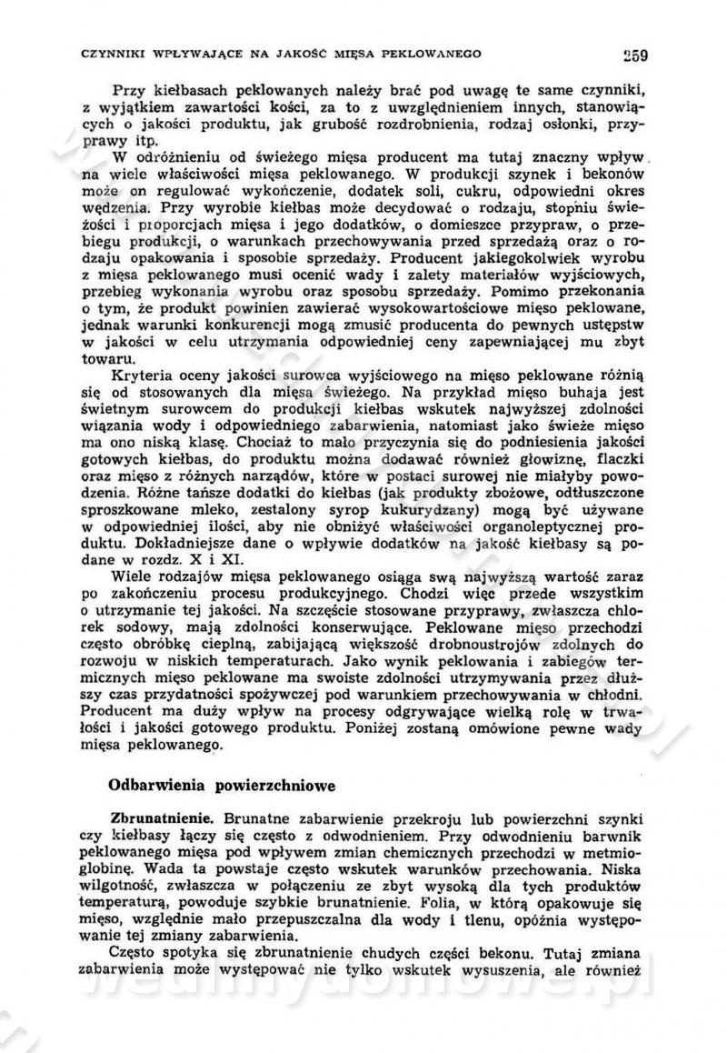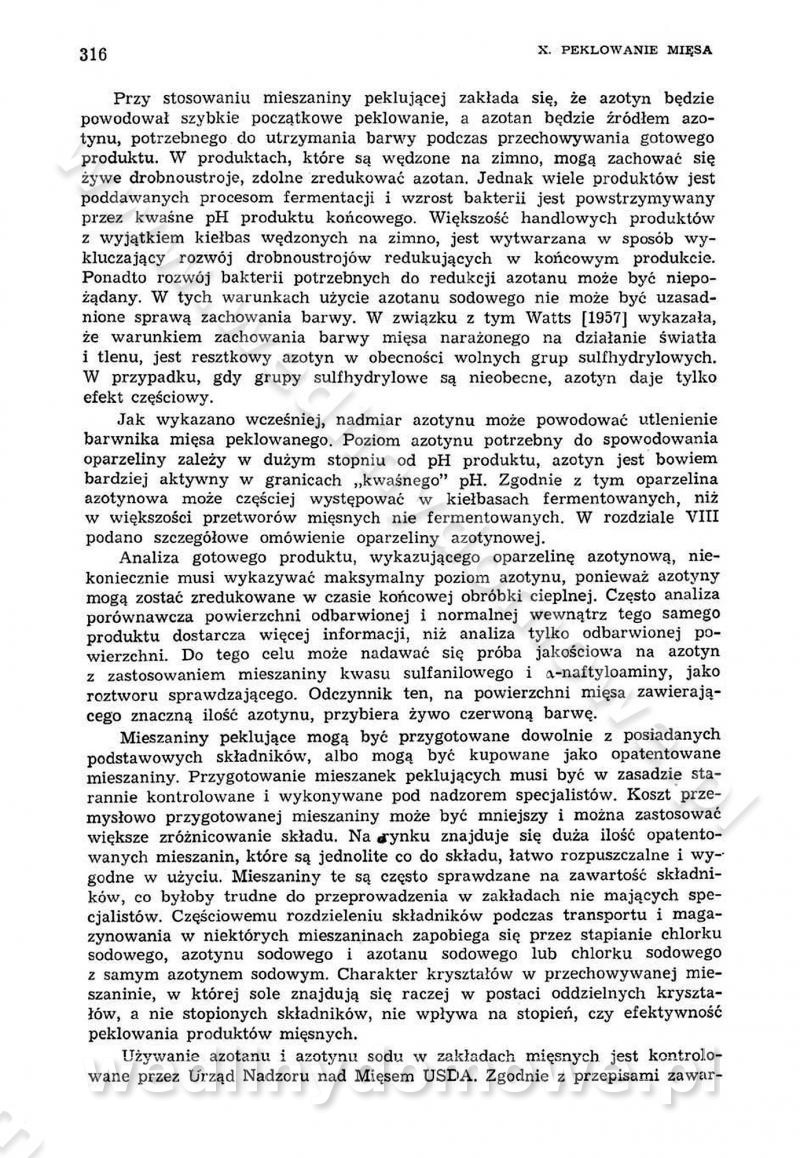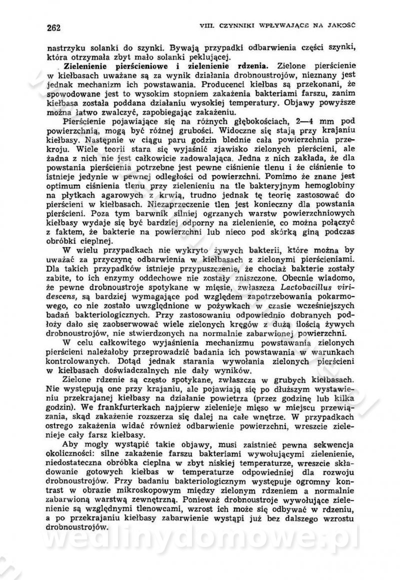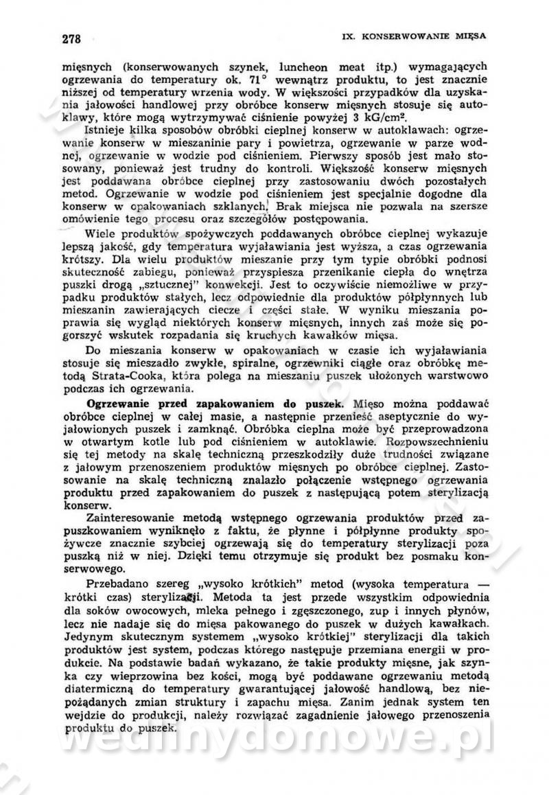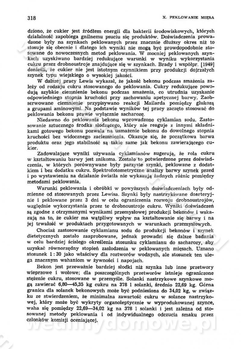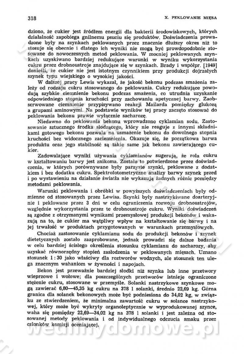 Urządzenia do wędzenia płynnymi preparatami dymu wędzarniczego Omówione wcześniej metody wytwarzania dymu wędzarniczego: tradycyjne, żarowe, cierne czy też parowe oraz sposoby doprowadzenia do komory czy rozprowadzenia dymu w komorze nie pozwalają na dokładną ocenę, jakie lotne produkty termicznego rozkładu materiału dymotwórczego i w jakich ilościach przedyfundują do produktu wędzonego. Możliwość taką daje zastosowanie preparatów dymu wędzarniczego o dokładnie określonym składzie chemicznym i stałym dla konkretnego preparatu. Preparat wędzący starannie dobiera się w zależności od tego, jakie cechy sensoryczne chcemy nadać wędzonej żywności. Podobnie jak dym wędzarniczy wytwarzany metodami tradycyjnymi, preparaty dymu wędzarniczego wykazują podobne właściwości barwiące, aromatyzujące, bakteriobójcze i antyoksydacyjne (Borys, 2005a). Sposób wytwarzania preparatów dymu wędzarniczego umożliwia uzyskanie preparatów niezawierających substancji smolistych, mutagennych i kancerogennych węglowodorów policyklicznych (Borys i Piotrowski, 1997; Pijanowski i in., 1996; Sikorski, 1980). Stwarza też możliwość nadawania im różnych aromatów dymnych o różnym stopniu kondensacji oraz wzbogacania o składniki mineralne, takie jak wapń, magnez, sód czy potas. Podstawowy skład chemiczny płynnego preparatu dymu wędzarniczego stanowią: woda 40-70%, kwas octowy 4-12%, kwas mrówkowy 0,5-3,5%, aldehyd glikolowy 1,7-5%, formaldehyd 0,5-12%, glioksal do 1,2%, acetol 2-5% i smoły do 12% (Borys, 2005, 2005a). Płynne preparaty dymu są w praktyce stosowane poprzez: rozpylanie w komorze wędzarniczej (tzw. atomizacja),natryskiwanie,zanurzanie,dodanie do mieszanki peklującej,bezpośrednie dodanie do farszu,odparowanie płynnego dymu na gorących powierzchniach komory wędzarniczej,powlekanie preparatem wędzarniczym wewnętrznych powierzchni sztucznych osłonek przetworów mięsnych.W przypadku rozpylania płynnego dymu ważne jest utrzymanie takich parametrów procesu, jak: odpowiednia koncentracja preparatu dymu,temperatura roztworu preparatu dymu,czas jego kontaktu z wędzonym produktem.Proces atomizacji polega na jednoczesnym podawaniu pod ciśnieniem 0,4 do 0,6 MPa do komory wędzarniczej mieszaniny płynnego dymu i powietrza. W komorze wędzarniczej tworzy się chmura aerozolu, którego cząstki fazy rozproszonej o średnicy 0,1-0,5 µm osiadają na powierzchni produktu i łatwiej dyfundują do jego wewnętrznych warstw. Proces atomizacji prowadzi się w szczelnych komorach wędzarniczych przy wyłączonej cyrkulacji powietrza. W trakcie pełnego cyklu wędzenia natrysk aerozolem następuje tuż po procesie podsuszania, czyli w momencie, gdy podczas tradycyjnego procesu wędzenia doprowadzany jest do komory świeży dym z generatora. Jest to etap procesu wędzenia w nowoczesnych komorach wędzarniczych i jako takim z łatwością steruje się automatycznie. O skuteczności procesu osiadania i dyfuzji preparatu decyduje wielkość cząstek fazy rozproszonej. Zaletami rozpylania płynnego dymu w urządzeniu wędzarniczym są: powtarzalność jakości wędzonego produktu,równomiernie rozłożony kolor oraz smak produktu po wędzeniu,zmniejszenie ubytku wagi produktu wędzonego o około 1-2%,obniżenie emisji dymu do środowiska,skrócenie czasu czyszczenia komór wędzarniczych, a w konsekwencji obniżenie kosztów procesu,wzrost wydajności urządzeń wędzarniczych,poprawa warunków higienicznych w wędzarni,mały koszt urządzeń do atomizacji i natrysku,zmniejszenie ryzyka powstania pożaru i wybuchu.Oprócz wymienionych już zalet zastosowania płynnego dymu przy rozpylaniu, procesy natryskiwania i zanurzania mają tę zaletę, że czas produkcji wędzonych wyrobów może zostać znacznie skrócony. Czas wędzenia skraca się o 1-2 min w stosunku do metod wędzenia dymem otrzymanym metodą termicznego rozkładu drewna. Metoda natryskowa polega na naniesieniu płynnego dymu, stosując dysze; w przypadku skraplania stosuje się sufitowy natrysk poprzez perforowane blachy. W małych zakładach proces natryskiwania prowadzi się ręcznie za pomocą pistoletu natryskowego. Po procesie natryskiwania nadmiar dymu odpływa z powrotem do zbiornika i jest ponownie wykorzystywany. Metoda immersyjna polega na zanurzaniu wędzonego produktu w roztworze wodnym preparatu dymu wędzarniczego. Kolejną metodą wytwarzania aerozolu jest odparowanie nakrapianego płynnego dymu na gorących powierzchniach komory wędzarniczej. Metodę tę cechuje równomierne rozprzestrzenianie dymu w komorze wędzarniczej. Współczesne metody nastrzykiwania surowców mięsnych solankami peklującymi umożliwiają dodanie preparatu dymu do roztworu wodnego mieszanki peklującej i wraz z nim wprowadzenie aromatu wędzarniczego do produktu. W celu uniknięcia reakcji ubocznych ze składnikami solanki peklującej stosuje się tylko takie produkty aromatów dymnych, które mają obojętne pH. Zastosowanie preparatów dymu w solance peklującej umożliwia równomierne aromatyzowanie wyrobów peklowanych na surowo. Przy produkcji wędlin preparaty dymu na bazie wody, oleju lub na nośnikach stałych (sól kuchenna) mogą być dodawane bezpośrednio do farszu. Jedną z nowszych metod jest stosowanie sztucznych osłonek do przetworów mięsnych z wewnętrzną warstwą powlekaną preparatem wędzarniczym. Z ekologicznego punktu widzenia metoda ta jest najbardziej przyjazna środowisku ze względu na brak zanieczyszczenia składnikami dymu powietrza oraz ścieków. Czas wędzenia decyduje o przejściu czynnika wędzarniczego z atmosfery wędzenia do wędzonego produktu i tym samym odgrywa ważną rolę przy przenikaniu dymu. Nowoczesne komory wędzarnicze można łatwo przestawić na proces wędzenia z zastosowaniem płynnego dymu. Warunkiem decydującym o skuteczności zastosowania płynnego dymu jest możliwość całkowitego zamknięcia urządzenia wędzarniczego. Tak samo jak w p