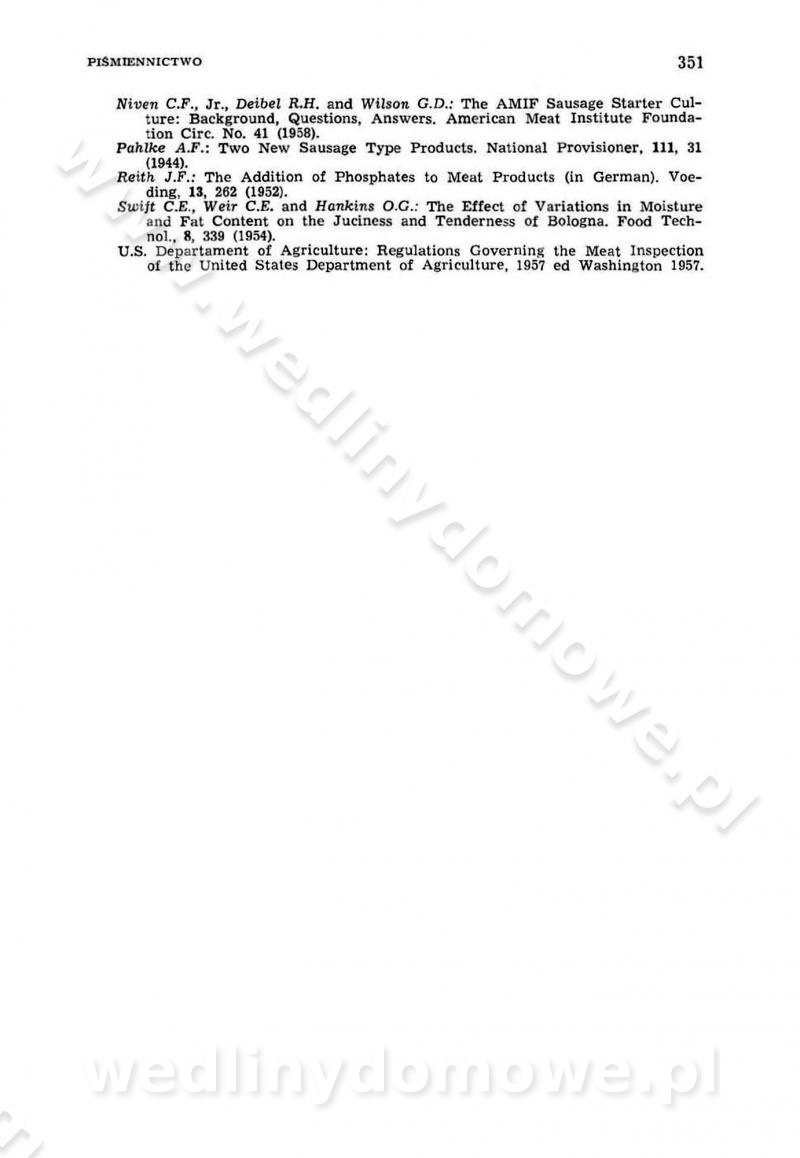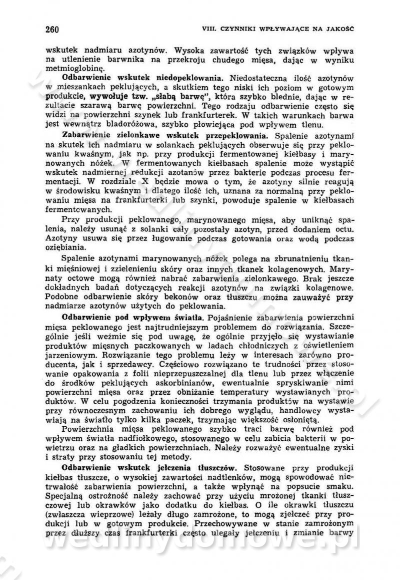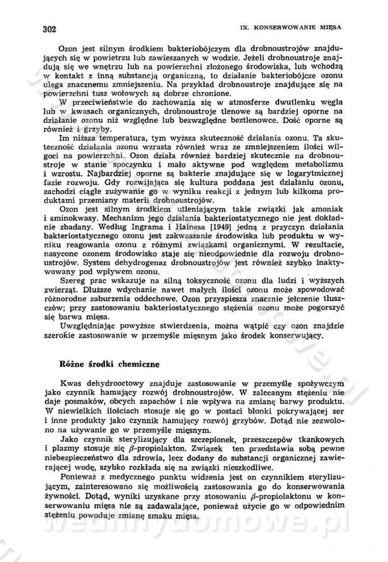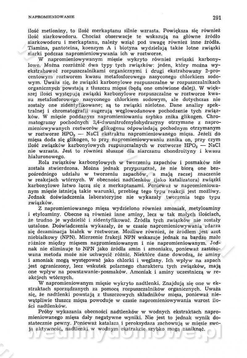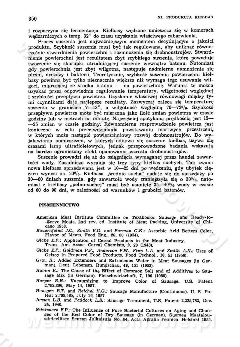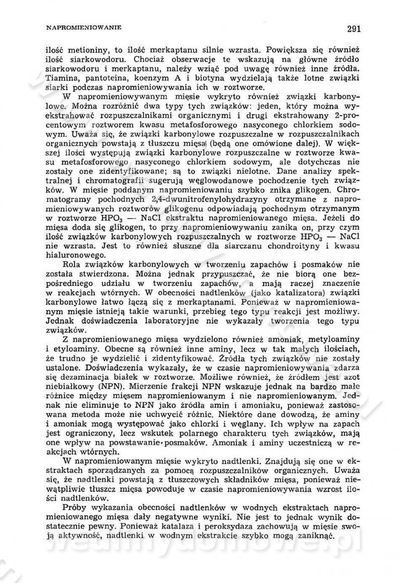 Urządzenia do wędzenia płynnymi preparatami dymu wędzarniczego Omówione wcześniej metody wytwarzania dymu wędzarniczego: tradycyjne, żarowe, cierne czy też parowe oraz sposoby doprowadzenia do komory czy rozprowadzenia dymu w komorze nie pozwalają na dokładną ocenę, jakie lotne produkty termicznego rozkładu materiału dymotwórczego i w jakich ilościach przedyfundują do produktu wędzonego. Możliwość taką daje zastosowanie preparatów dymu wędzarniczego o dokładnie określonym składzie chemicznym i stałym dla konkretnego preparatu. Preparat wędzący starannie dobiera się w zależności od tego, jakie cechy sensoryczne chcemy nadać wędzonej żywności. Podobnie jak dym wędzarniczy wytwarzany metodami tradycyjnymi, preparaty dymu wędzarniczego wykazują podobne właściwości barwiące, aromatyzujące, bakteriobójcze i antyoksydacyjne (Borys, 2005a). Sposób wytwarzania preparatów dymu wędzarniczego umożliwia uzyskanie preparatów niezawierających substancji smolistych, mutagennych i kancerogennych węglowodorów policyklicznych (Borys i Piotrowski, 1997; Pijanowski i in., 1996; Sikorski, 1980). Stwarza też możliwość nadawania im różnych aromatów dymnych o różnym stopniu kondensacji oraz wzbogacania o składniki mineralne, takie jak wapń, magnez, sód czy potas. Podstawowy skład chemiczny płynnego preparatu dymu wędzarniczego stanowią: woda 40-70%, kwas octowy 4-12%, kwas mrówkowy 0,5-3,5%, aldehyd glikolowy 1,7-5%, formaldehyd 0,5-12%, glioksal do 1,2%, acetol 2-5% i smoły do 12% (Borys, 2005, 2005a). Płynne preparaty dymu są w praktyce stosowane poprzez: rozpylanie w komorze wędzarniczej (tzw. atomizacja),natryskiwanie,zanurzanie,dodanie do mieszanki peklującej,bezpośrednie dodanie do farszu,odparowanie płynnego dymu na gorących powierzchniach komory wędzarniczej,powlekanie preparatem wędzarniczym wewnętrznych powierzchni sztucznych osłonek przetworów mięsnych.W przypadku rozpylania płynnego dymu ważne jest utrzymanie takich parametrów procesu, jak: odpowiednia koncentracja preparatu dymu,temperatura roztworu preparatu dymu,czas jego kontaktu z wędzonym produktem.Proces atomizacji polega na jednoczesnym podawaniu pod ciśnieniem 0,4 do 0,6 MPa do komory wędzarniczej mieszaniny płynnego dymu i powietrza. W komorze wędzarniczej tworzy się chmura aerozolu, którego cząstki fazy rozproszonej o średnicy 0,1-0,5 µm osiadają na powierzchni produktu i łatwiej dyfundują do jego wewnętrznych warstw. Proces atomizacji prowadzi się w szczelnych komorach wędzarniczych przy wyłączonej cyrkulacji powietrza. W trakcie pełnego cyklu wędzenia natrysk aerozolem następuje tuż po procesie podsuszania, czyli w momencie, gdy podczas tradycyjnego procesu wędzenia doprowadzany jest do komory świeży dym z generatora. Jest to etap procesu wędzenia w nowoczesnych komorach wędzarniczych i jako takim z łatwością steruje się automatycznie. O skuteczności procesu osiadania i dyfuzji preparatu decyduje wielkość cząstek fazy rozproszonej. Zaletami rozpylania płynnego dymu w urządzeniu wędzarniczym są: powtarzalność jakości wędzonego produktu,równomiernie rozłożony kolor oraz smak produktu po wędzeniu,zmniejszenie ubytku wagi produktu wędzonego o około 1-2%,obniżenie emisji dymu do środowiska,skrócenie czasu czyszczenia komór wędzarniczych, a w konsekwencji obniżenie kosztów procesu,wzrost wydajności urządzeń wędzarniczych,poprawa warunków higienicznych w wędzarni,mały koszt urządzeń do atomizacji i natrysku,zmniejszenie ryzyka powstania pożaru i wybuchu.Oprócz wymienionych już zalet zastosowania płynnego dymu przy rozpylaniu, procesy natryskiwania i zanurzania mają tę zaletę, że czas produkcji wędzonych wyrobów może zostać znacznie skrócony. Czas wędzenia skraca się o 1-2 min w stosunku do metod wędzenia dymem otrzymanym metodą termicznego rozkładu drewna. Metoda natryskowa polega na naniesieniu płynnego dymu, stosując dysze; w przypadku skraplania stosuje się sufitowy natrysk poprzez perforowane blachy. W małych zakładach proces natryskiwania prowadzi się ręcznie za pomocą pistoletu natryskowego. Po procesie natryskiwania nadmiar dymu odpływa z powrotem do zbiornika i jest ponownie wykorzystywany. Metoda immersyjna polega na zanurzaniu wędzonego produktu w roztworze wodnym preparatu dymu wędzarniczego. Kolejną metodą wytwarzania aerozolu jest odparowanie nakrapianego płynnego dymu na gorących powierzchniach komory wędzarniczej. Metodę tę cechuje równomierne rozprzestrzenianie dymu w komorze wędzarniczej. Współczesne metody nastrzykiwania surowców mięsnych solankami peklującymi umożliwiają dodanie preparatu dymu do roztworu wodnego mieszanki peklującej i wraz z nim wprowadzenie aromatu wędzarniczego do produktu. W celu uniknięcia reakcji ubocznych ze składnikami solanki peklującej stosuje się tylko takie produkty aromatów dymnych, które mają obojętne pH. Zastosowanie preparatów dymu w solance peklującej umożliwia równomierne aromatyzowanie wyrobów peklowanych na surowo. Przy produkcji wędlin preparaty dymu na bazie wody, oleju lub na nośnikach stałych (sól kuchenna) mogą być dodawane bezpośrednio do farszu. Jedną z nowszych metod jest stosowanie sztucznych osłonek do przetworów mięsnych z wewnętrzną warstwą powlekaną preparatem wędzarniczym. Z ekologicznego punktu widzenia metoda ta jest najbardziej przyjazna środowisku ze względu na brak zanieczyszczenia składnikami dymu powietrza oraz ścieków. Czas wędzenia decyduje o przejściu czynnika wędzarniczego z atmosfery wędzenia do wędzonego produktu i tym samym odgrywa ważną rolę przy przenikaniu dymu. Nowoczesne komory wędzarnicze można łatwo przestawić na proces wędzenia z zastosowaniem płynnego dymu. Warunkiem decydującym o skuteczności zastosowania płynnego dymu jest możliwość całkowitego zamknięcia urządzenia wędzarniczego. Tak samo jak w p