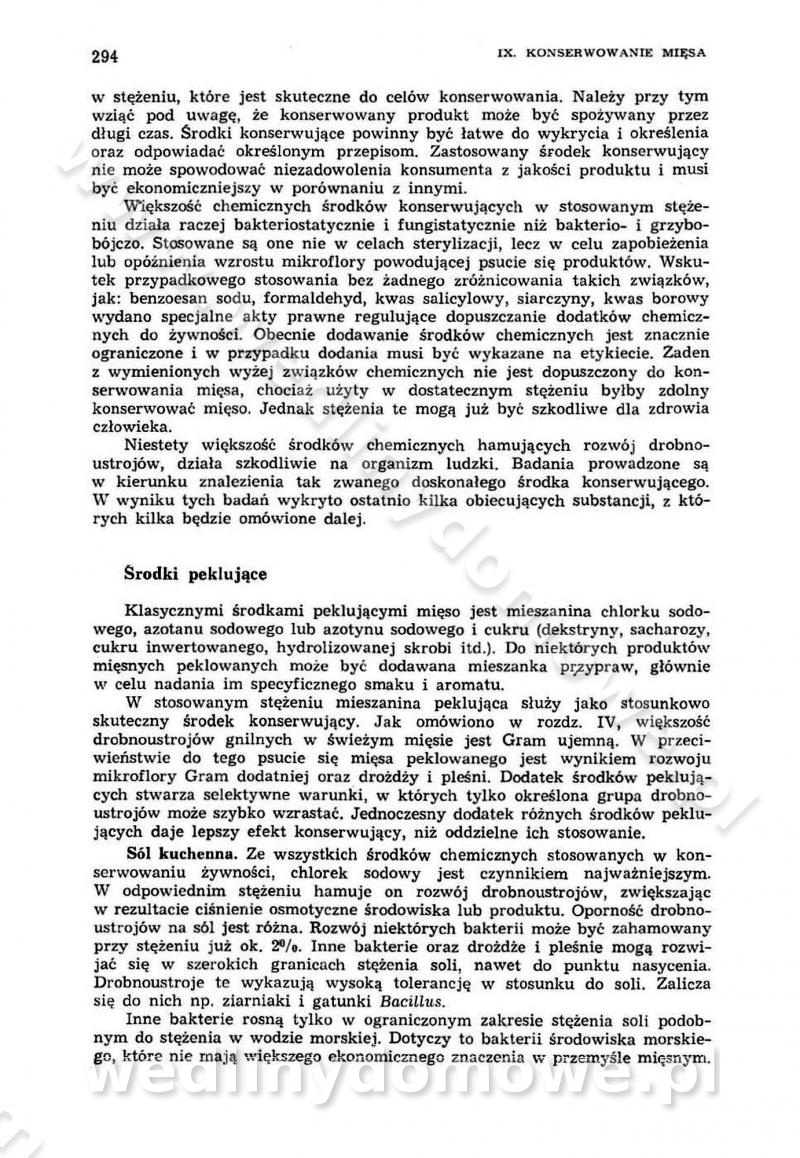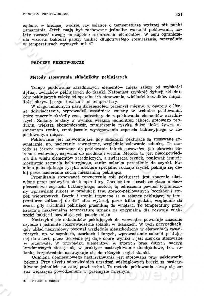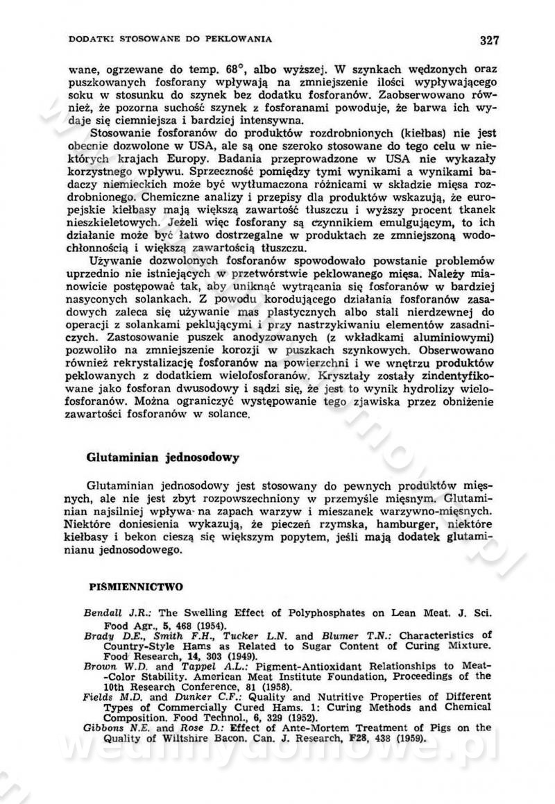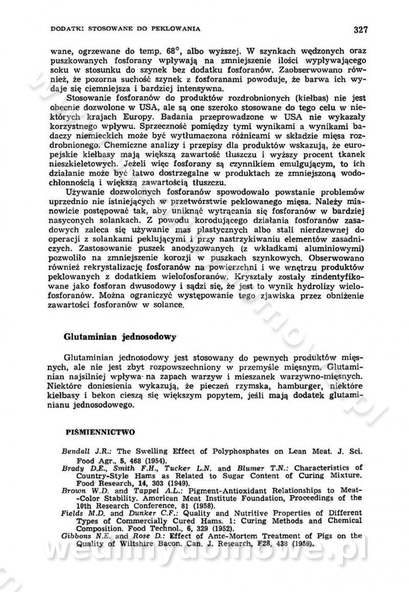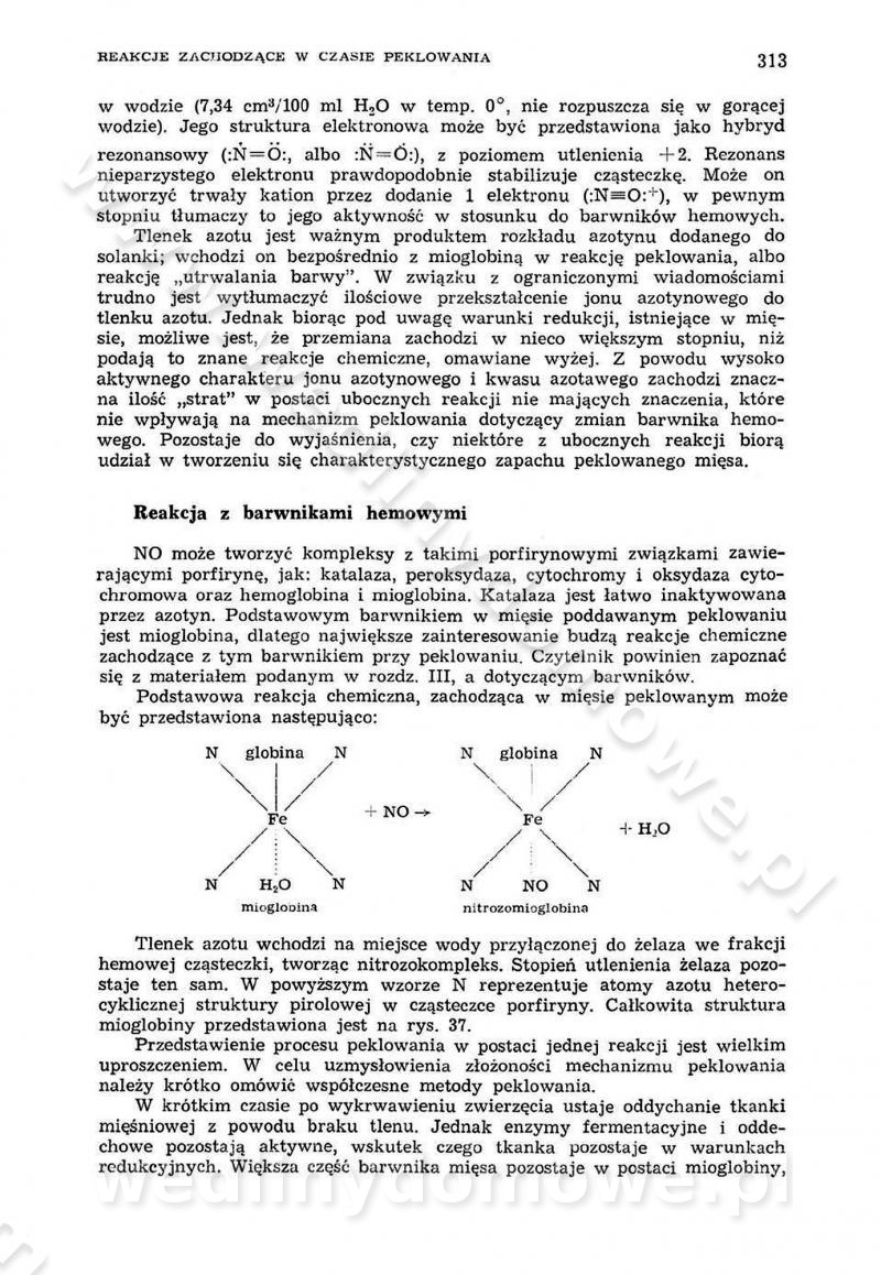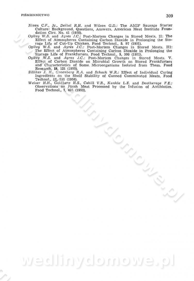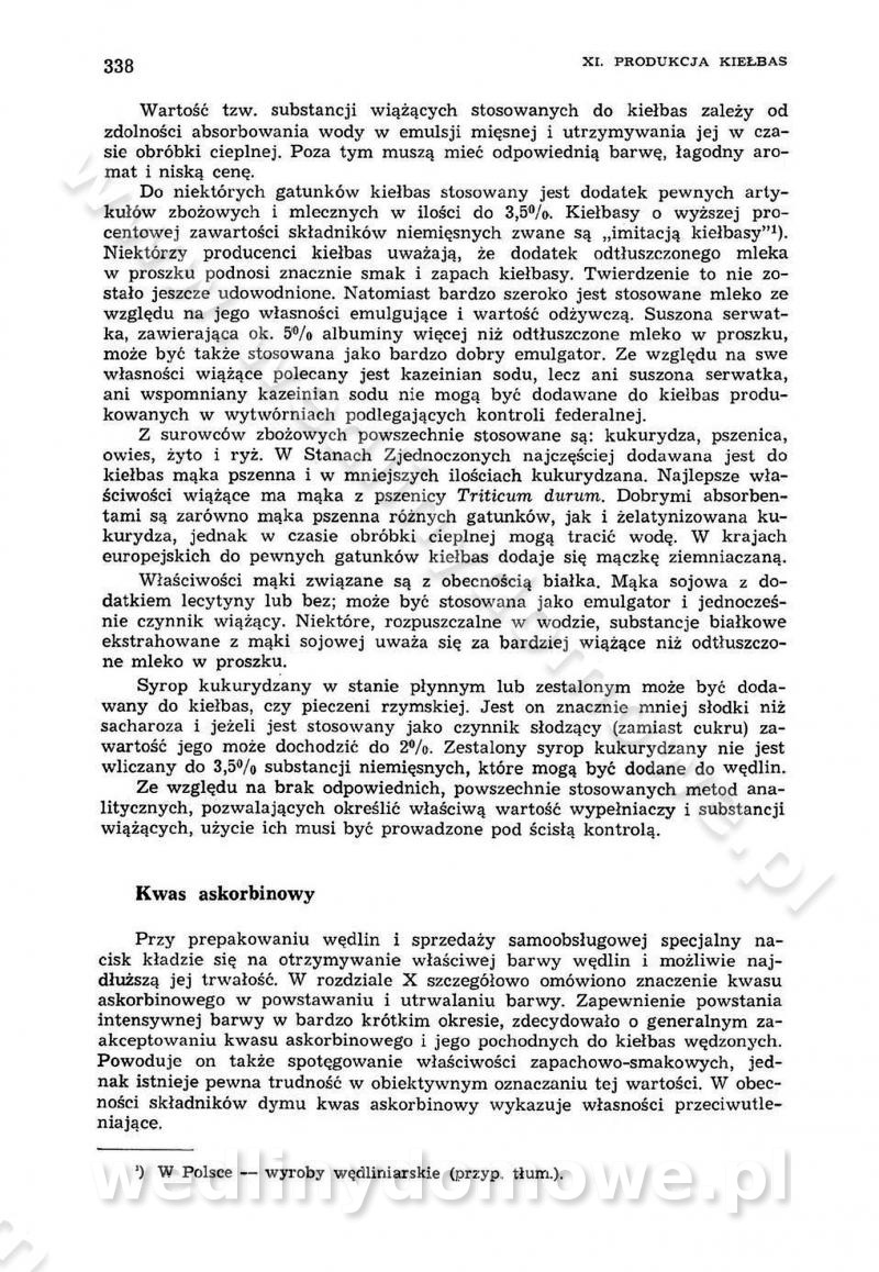 Urządzenia do wędzenia płynnymi preparatami dymu wędzarniczego Omówione wcześniej metody wytwarzania dymu wędzarniczego: tradycyjne, żarowe, cierne czy też parowe oraz sposoby doprowadzenia do komory czy rozprowadzenia dymu w komorze nie pozwalają na dokładną ocenę, jakie lotne produkty termicznego rozkładu materiału dymotwórczego i w jakich ilościach przedyfundują do produktu wędzonego. Możliwość taką daje zastosowanie preparatów dymu wędzarniczego o dokładnie określonym składzie chemicznym i stałym dla konkretnego preparatu. Preparat wędzący starannie dobiera się w zależności od tego, jakie cechy sensoryczne chcemy nadać wędzonej żywności. Podobnie jak dym wędzarniczy wytwarzany metodami tradycyjnymi, preparaty dymu wędzarniczego wykazują podobne właściwości barwiące, aromatyzujące, bakteriobójcze i antyoksydacyjne (Borys, 2005a). Sposób wytwarzania preparatów dymu wędzarniczego umożliwia uzyskanie preparatów niezawierających substancji smolistych, mutagennych i kancerogennych węglowodorów policyklicznych (Borys i Piotrowski, 1997; Pijanowski i in., 1996; Sikorski, 1980). Stwarza też możliwość nadawania im różnych aromatów dymnych o różnym stopniu kondensacji oraz wzbogacania o składniki mineralne, takie jak wapń, magnez, sód czy potas. Podstawowy skład chemiczny płynnego preparatu dymu wędzarniczego stanowią: woda 40-70%, kwas octowy 4-12%, kwas mrówkowy 0,5-3,5%, aldehyd glikolowy 1,7-5%, formaldehyd 0,5-12%, glioksal do 1,2%, acetol 2-5% i smoły do 12% (Borys, 2005, 2005a). Płynne preparaty dymu są w praktyce stosowane poprzez: rozpylanie w komorze wędzarniczej (tzw. atomizacja),natryskiwanie,zanurzanie,dodanie do mieszanki peklującej,bezpośrednie dodanie do farszu,odparowanie płynnego dymu na gorących powierzchniach komory wędzarniczej,powlekanie preparatem wędzarniczym wewnętrznych powierzchni sztucznych osłonek przetworów mięsnych.W przypadku rozpylania płynnego dymu ważne jest utrzymanie takich parametrów procesu, jak: odpowiednia koncentracja preparatu dymu,temperatura roztworu preparatu dymu,czas jego kontaktu z wędzonym produktem.Proces atomizacji polega na jednoczesnym podawaniu pod ciśnieniem 0,4 do 0,6 MPa do komory wędzarniczej mieszaniny płynnego dymu i powietrza. W komorze wędzarniczej tworzy się chmura aerozolu, którego cząstki fazy rozproszonej o średnicy 0,1-0,5 µm osiadają na powierzchni produktu i łatwiej dyfundują do jego wewnętrznych warstw. Proces atomizacji prowadzi się w szczelnych komorach wędzarniczych przy wyłączonej cyrkulacji powietrza. W trakcie pełnego cyklu wędzenia natrysk aerozolem następuje tuż po procesie podsuszania, czyli w momencie, gdy podczas tradycyjnego procesu wędzenia doprowadzany jest do komory świeży dym z generatora. Jest to etap procesu wędzenia w nowoczesnych komorach wędzarniczych i jako takim z łatwością steruje się automatycznie. O skuteczności procesu osiadania i dyfuzji preparatu decyduje wielkość cząstek fazy rozproszonej. Zaletami rozpylania płynnego dymu w urządzeniu wędzarniczym są: powtarzalność jakości wędzonego produktu,równomiernie rozłożony kolor oraz smak produktu po wędzeniu,zmniejszenie ubytku wagi produktu wędzonego o około 1-2%,obniżenie emisji dymu do środowiska,skrócenie czasu czyszczenia komór wędzarniczych, a w konsekwencji obniżenie kosztów procesu,wzrost wydajności urządzeń wędzarniczych,poprawa warunków higienicznych w wędzarni,mały koszt urządzeń do atomizacji i natrysku,zmniejszenie ryzyka powstania pożaru i wybuchu.Oprócz wymienionych już zalet zastosowania płynnego dymu przy rozpylaniu, procesy natryskiwania i zanurzania mają tę zaletę, że czas produkcji wędzonych wyrobów może zostać znacznie skrócony. Czas wędzenia skraca się o 1-2 min w stosunku do metod wędzenia dymem otrzymanym metodą termicznego rozkładu drewna. Metoda natryskowa polega na naniesieniu płynnego dymu, stosując dysze; w przypadku skraplania stosuje się sufitowy natrysk poprzez perforowane blachy. W małych zakładach proces natryskiwania prowadzi się ręcznie za pomocą pistoletu natryskowego. Po procesie natryskiwania nadmiar dymu odpływa z powrotem do zbiornika i jest ponownie wykorzystywany. Metoda immersyjna polega na zanurzaniu wędzonego produktu w roztworze wodnym preparatu dymu wędzarniczego. Kolejną metodą wytwarzania aerozolu jest odparowanie nakrapianego płynnego dymu na gorących powierzchniach komory wędzarniczej. Metodę tę cechuje równomierne rozprzestrzenianie dymu w komorze wędzarniczej. Współczesne metody nastrzykiwania surowców mięsnych solankami peklującymi umożliwiają dodanie preparatu dymu do roztworu wodnego mieszanki peklującej i wraz z nim wprowadzenie aromatu wędzarniczego do produktu. W celu uniknięcia reakcji ubocznych ze składnikami solanki peklującej stosuje się tylko takie produkty aromatów dymnych, które mają obojętne pH. Zastosowanie preparatów dymu w solance peklującej umożliwia równomierne aromatyzowanie wyrobów peklowanych na surowo. Przy produkcji wędlin preparaty dymu na bazie wody, oleju lub na nośnikach stałych (sól kuchenna) mogą być dodawane bezpośrednio do farszu. Jedną z nowszych metod jest stosowanie sztucznych osłonek do przetworów mięsnych z wewnętrzną warstwą powlekaną preparatem wędzarniczym. Z ekologicznego punktu widzenia metoda ta jest najbardziej przyjazna środowisku ze względu na brak zanieczyszczenia składnikami dymu powietrza oraz ścieków. Czas wędzenia decyduje o przejściu czynnika wędzarniczego z atmosfery wędzenia do wędzonego produktu i tym samym odgrywa ważną rolę przy przenikaniu dymu. Nowoczesne komory wędzarnicze można łatwo przestawić na proces wędzenia z zastosowaniem płynnego dymu. Warunkiem decydującym o skuteczności zastosowania płynnego dymu jest możliwość całkowitego zamknięcia urządzenia wędzarniczego. Tak samo jak w p