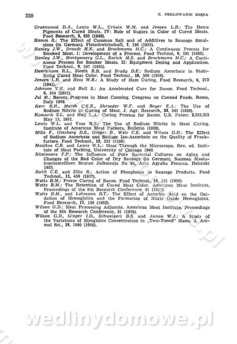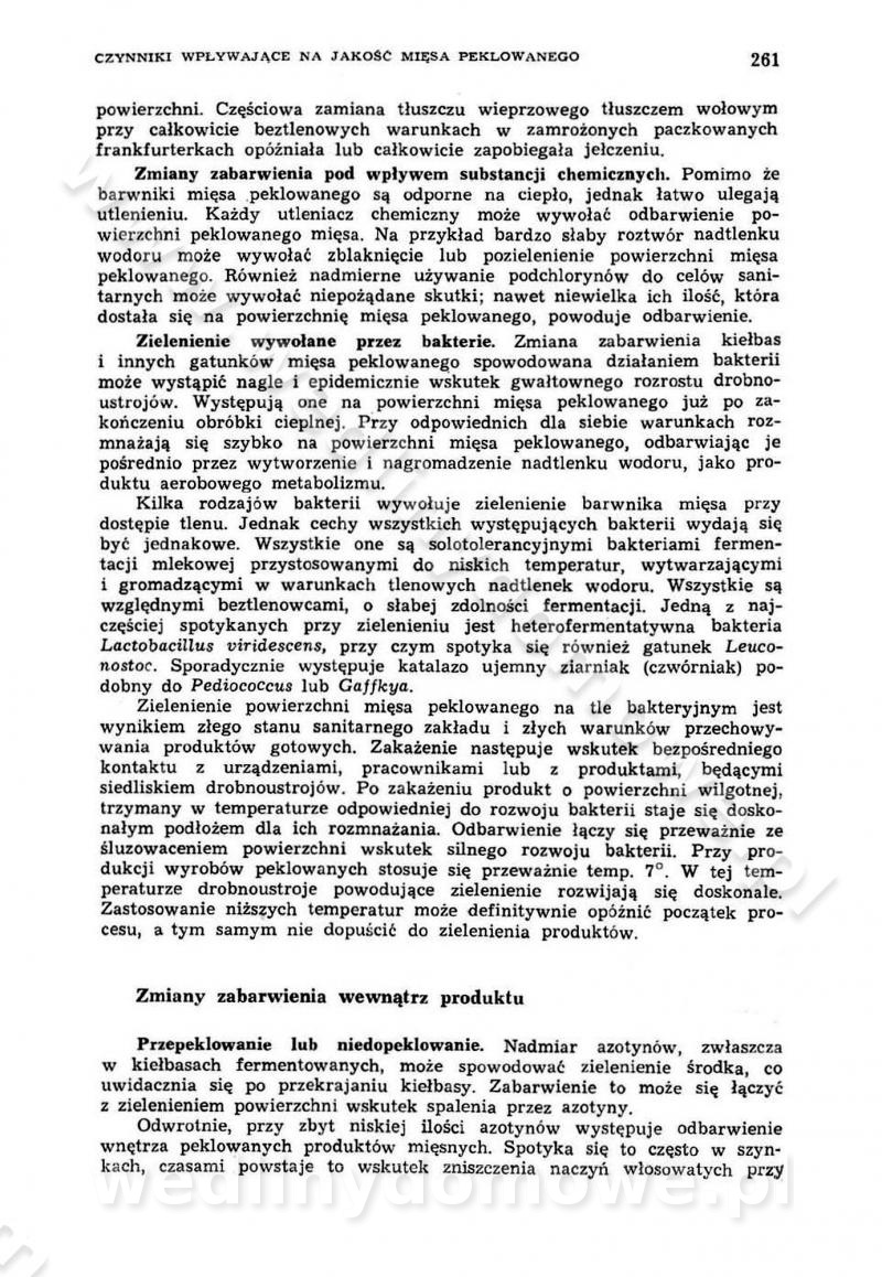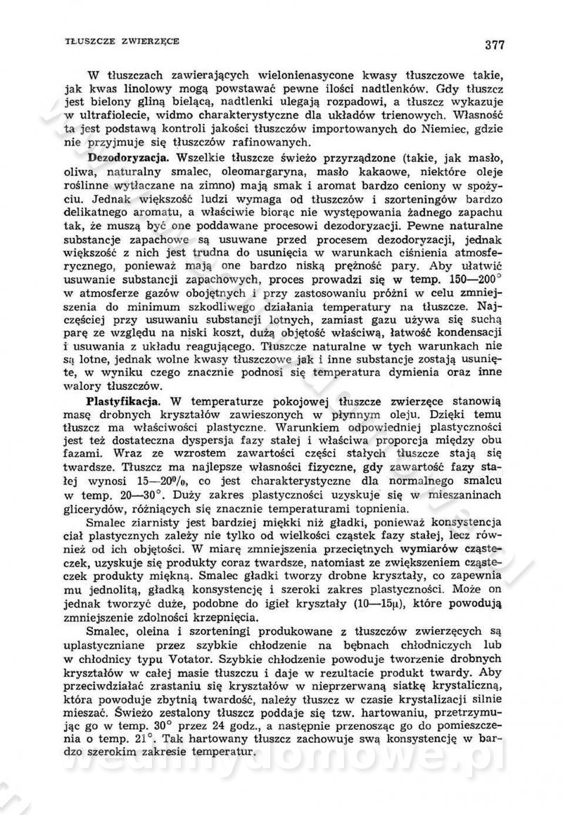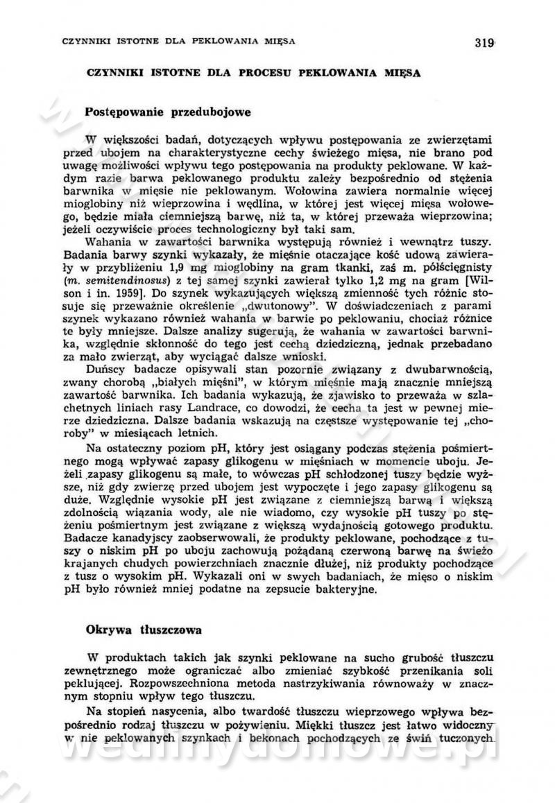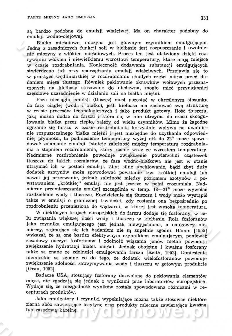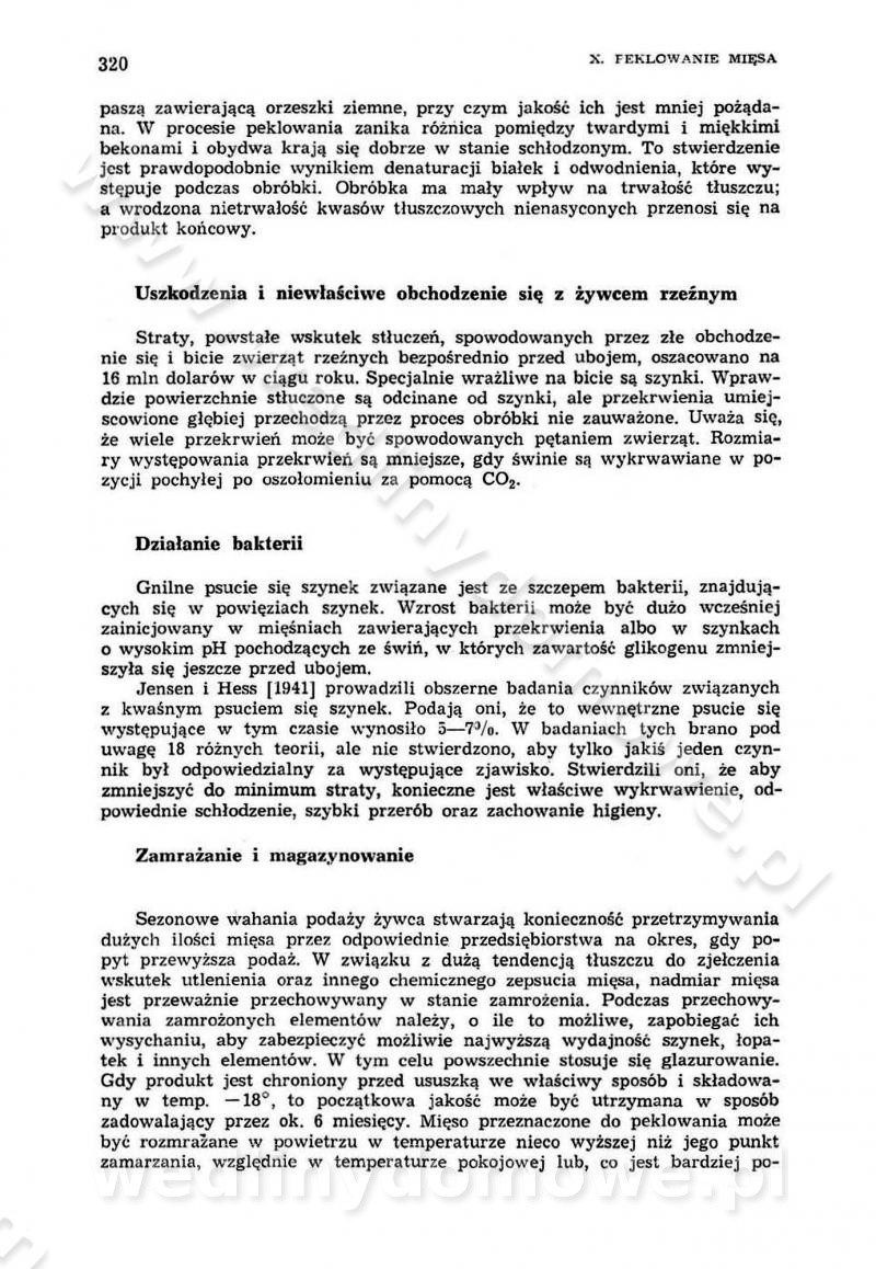 Urządzenia do wędzenia płynnymi preparatami dymu wędzarniczego Omówione wcześniej metody wytwarzania dymu wędzarniczego: tradycyjne, żarowe, cierne czy też parowe oraz sposoby doprowadzenia do komory czy rozprowadzenia dymu w komorze nie pozwalają na dokładną ocenę, jakie lotne produkty termicznego rozkładu materiału dymotwórczego i w jakich ilościach przedyfundują do produktu wędzonego. Możliwość taką daje zastosowanie preparatów dymu wędzarniczego o dokładnie określonym składzie chemicznym i stałym dla konkretnego preparatu. Preparat wędzący starannie dobiera się w zależności od tego, jakie cechy sensoryczne chcemy nadać wędzonej żywności. Podobnie jak dym wędzarniczy wytwarzany metodami tradycyjnymi, preparaty dymu wędzarniczego wykazują podobne właściwości barwiące, aromatyzujące, bakteriobójcze i antyoksydacyjne (Borys, 2005a). Sposób wytwarzania preparatów dymu wędzarniczego umożliwia uzyskanie preparatów niezawierających substancji smolistych, mutagennych i kancerogennych węglowodorów policyklicznych (Borys i Piotrowski, 1997; Pijanowski i in., 1996; Sikorski, 1980). Stwarza też możliwość nadawania im różnych aromatów dymnych o różnym stopniu kondensacji oraz wzbogacania o składniki mineralne, takie jak wapń, magnez, sód czy potas. Podstawowy skład chemiczny płynnego preparatu dymu wędzarniczego stanowią: woda 40-70%, kwas octowy 4-12%, kwas mrówkowy 0,5-3,5%, aldehyd glikolowy 1,7-5%, formaldehyd 0,5-12%, glioksal do 1,2%, acetol 2-5% i smoły do 12% (Borys, 2005, 2005a). Płynne preparaty dymu są w praktyce stosowane poprzez: rozpylanie w komorze wędzarniczej (tzw. atomizacja),natryskiwanie,zanurzanie,dodanie do mieszanki peklującej,bezpośrednie dodanie do farszu,odparowanie płynnego dymu na gorących powierzchniach komory wędzarniczej,powlekanie preparatem wędzarniczym wewnętrznych powierzchni sztucznych osłonek przetworów mięsnych.W przypadku rozpylania płynnego dymu ważne jest utrzymanie takich parametrów procesu, jak: odpowiednia koncentracja preparatu dymu,temperatura roztworu preparatu dymu,czas jego kontaktu z wędzonym produktem.Proces atomizacji polega na jednoczesnym podawaniu pod ciśnieniem 0,4 do 0,6 MPa do komory wędzarniczej mieszaniny płynnego dymu i powietrza. W komorze wędzarniczej tworzy się chmura aerozolu, którego cząstki fazy rozproszonej o średnicy 0,1-0,5 µm osiadają na powierzchni produktu i łatwiej dyfundują do jego wewnętrznych warstw. Proces atomizacji prowadzi się w szczelnych komorach wędzarniczych przy wyłączonej cyrkulacji powietrza. W trakcie pełnego cyklu wędzenia natrysk aerozolem następuje tuż po procesie podsuszania, czyli w momencie, gdy podczas tradycyjnego procesu wędzenia doprowadzany jest do komory świeży dym z generatora. Jest to etap procesu wędzenia w nowoczesnych komorach wędzarniczych i jako takim z łatwością steruje się automatycznie. O skuteczności procesu osiadania i dyfuzji preparatu decyduje wielkość cząstek fazy rozproszonej. Zaletami rozpylania płynnego dymu w urządzeniu wędzarniczym są: powtarzalność jakości wędzonego produktu,równomiernie rozłożony kolor oraz smak produktu po wędzeniu,zmniejszenie ubytku wagi produktu wędzonego o około 1-2%,obniżenie emisji dymu do środowiska,skrócenie czasu czyszczenia komór wędzarniczych, a w konsekwencji obniżenie kosztów procesu,wzrost wydajności urządzeń wędzarniczych,poprawa warunków higienicznych w wędzarni,mały koszt urządzeń do atomizacji i natrysku,zmniejszenie ryzyka powstania pożaru i wybuchu.Oprócz wymienionych już zalet zastosowania płynnego dymu przy rozpylaniu, procesy natryskiwania i zanurzania mają tę zaletę, że czas produkcji wędzonych wyrobów może zostać znacznie skrócony. Czas wędzenia skraca się o 1-2 min w stosunku do metod wędzenia dymem otrzymanym metodą termicznego rozkładu drewna. Metoda natryskowa polega na naniesieniu płynnego dymu, stosując dysze; w przypadku skraplania stosuje się sufitowy natrysk poprzez perforowane blachy. W małych zakładach proces natryskiwania prowadzi się ręcznie za pomocą pistoletu natryskowego. Po procesie natryskiwania nadmiar dymu odpływa z powrotem do zbiornika i jest ponownie wykorzystywany. Metoda immersyjna polega na zanurzaniu wędzonego produktu w roztworze wodnym preparatu dymu wędzarniczego. Kolejną metodą wytwarzania aerozolu jest odparowanie nakrapianego płynnego dymu na gorących powierzchniach komory wędzarniczej. Metodę tę cechuje równomierne rozprzestrzenianie dymu w komorze wędzarniczej. Współczesne metody nastrzykiwania surowców mięsnych solankami peklującymi umożliwiają dodanie preparatu dymu do roztworu wodnego mieszanki peklującej i wraz z nim wprowadzenie aromatu wędzarniczego do produktu. W celu uniknięcia reakcji ubocznych ze składnikami solanki peklującej stosuje się tylko takie produkty aromatów dymnych, które mają obojętne pH. Zastosowanie preparatów dymu w solance peklującej umożliwia równomierne aromatyzowanie wyrobów peklowanych na surowo. Przy produkcji wędlin preparaty dymu na bazie wody, oleju lub na nośnikach stałych (sól kuchenna) mogą być dodawane bezpośrednio do farszu. Jedną z nowszych metod jest stosowanie sztucznych osłonek do przetworów mięsnych z wewnętrzną warstwą powlekaną preparatem wędzarniczym. Z ekologicznego punktu widzenia metoda ta jest najbardziej przyjazna środowisku ze względu na brak zanieczyszczenia składnikami dymu powietrza oraz ścieków. Czas wędzenia decyduje o przejściu czynnika wędzarniczego z atmosfery wędzenia do wędzonego produktu i tym samym odgrywa ważną rolę przy przenikaniu dymu. Nowoczesne komory wędzarnicze można łatwo przestawić na proces wędzenia z zastosowaniem płynnego dymu. Warunkiem decydującym o skuteczności zastosowania płynnego dymu jest możliwość całkowitego zamknięcia urządzenia wędzarniczego. Tak samo jak w p