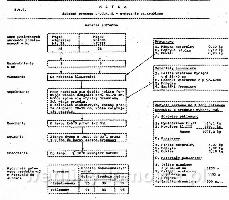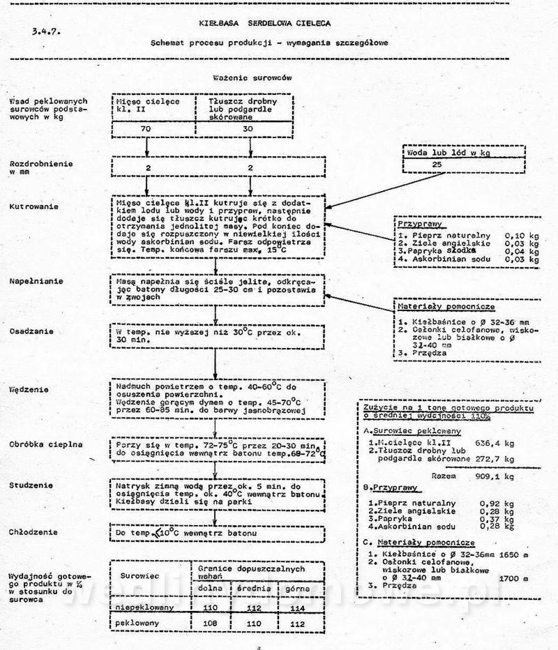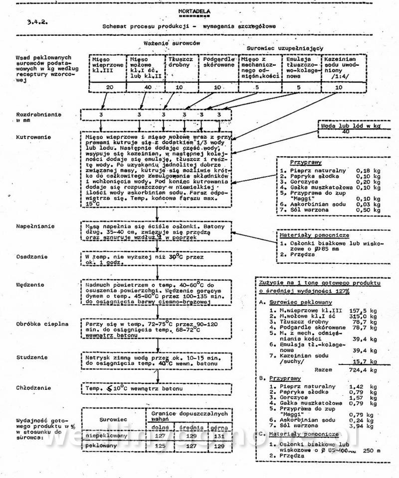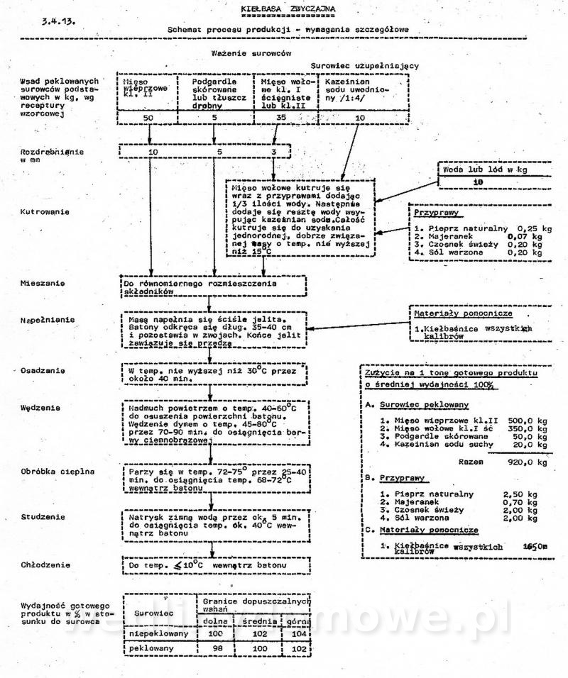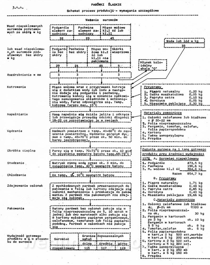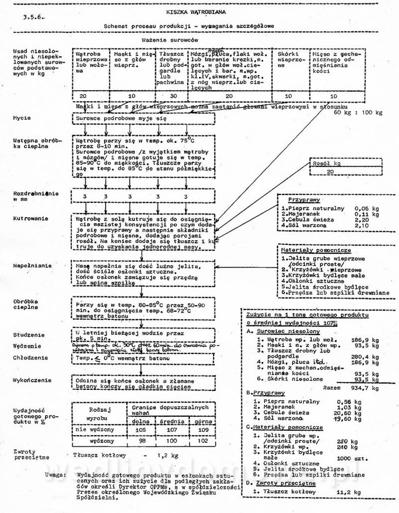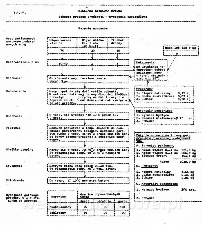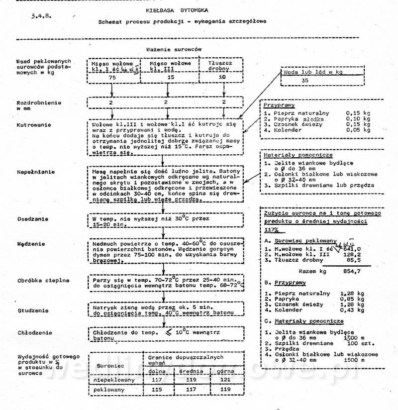 5. Dzisiaj rozpoczynam umieszczanie na forum unikalnego i bardzo dobrego materiału z zakresu technologii mięsa. Moim zdaniem jest to jeden z najwcześniejszych (młodszy jeszcze od 16-tki - z treści widać iż to ona była na nim wzorowana) zbiorów receptur opracowanych przez "SPOŁEM", poparty szerokim, specjalistycznym komentarzem. Zachęcam wszystkich do dokładnego zapoznania się z tym opracowaniem. SPIS TREŚCI (dla potrzeb wyszukiwarek) Antrykot – 123 Baleron gotowany – 171 Baleron wędzony – 174 Baleron wędzony (środkowy) – 176 Boczek gotowany – 178 Boczek wędzony – 180 Baranina w tuszach – norma jakościowa – 126 Biodrówka – 114 Boczek – 120 Cielęcina w tuszach – norma jakościowa – 126 Comber – 126 Części zasadnicze mięsa baraniego – 126 Części zasadnicze mięsa cielęcego – 124 Części zasadnicze mięsa wołowego – 121 Czynności przedubojowe – 96 Dopuszczanie do produkcji i obrotu nowych artykułów – 29 Dychawica – 12 Dychawica świszcząca – 12 Dyscyplina wykonawstwa rozdzielników – 11 Elementy kulinarne mięsa baraniego – 128 Elementy kulinarne mięsa cielęcego – 126 Elementy kulinarne mięsa wieprzowego – 114 Flaki baranie – 160 Flaki bydlęce – 155 Głowa barania – 160 Głowa bydlęca – 154 Głowa cielęca – 158 Głowa wieprzowa – 157 Goleń – 123 Goleń barania – 126 Goleń cielęca – 124 Goleń cielęca przednia – 124 Golonka przednia, tylna – 119 Golonka wędzona – 183 Górka barania – 128 Górka właściwa – 126 Gruźlica – 12 Instrukcja Nr 7 w sprawie organizacji i techniki zaopatrzenia w artykuły mięsno-tłuszczowe sklepów MHM – 70 Instrukcja w sprawie trwałego oznaczania towarów – 15 Instrukcja w sprawie transportu mięsa i przetworów mięsnych – 80 Jakościowy odbiór – instrukcja Nr 3 – 15 Jakościowy odbiór – instrukcja Nr 17 – 22 Jelita baranie cienkie – 476 Jelita bydlęce cienkie – 465 Jelita bydlęce środkowe – 466 Jelita cielęce cienkie – 487 Jelita grube wieprzowe – 459 Jelita końskie cienkie – 481 Jelita wiankowe – 465 Jelita wieprzowe cienkie – 455 Kabanosy – 185 Kabanosy pieczone końskie – 421 Karkówka wieprzowa – 114 Karkówka barania – 128 Karkówka cielęca – 126 Karkówka wołowa – 123 Kątnice baranie – 478 Kątnice bydlęce – 469 Kątnice cielęce – 485 Kiełbasa belgijska końska – 415 Kiełbasa biała surowa – 187 Kiełbasa bydgoska parzona – 189 Kiełbasa cytrynowa parzona – 192 Kiełbasa czosnkowa parzona – 195 Kiełbasa gnieźnieńska parzona – 199 Kiełbasa gorzowska końska – 420 Kiełbasa górska końska – 419 Kiełbasa jałowcowa pieczona podsuszana – 201 Kiełbasa kminkowa parzona – 204 Kiełbasa krakowska parzona – 207 Kiełbasa krakowska parzona sucha – 211 Kiełbasa kujawska parzona podsuszana – 214 Kiełbasa limanowska pieczona podsuszana – 216 Kiełbasa litewska pieczona podsuszana – 219 Kiełbasa myśliwska pieczona sucha – 223 Kiełbasa parówkowa parzona – 225 Kiełbasa piwna parzona podsuszana – 228 Kiełbasa podhalańska parzona podsuszana – 231 Kiełbasa polska wędzona – 234 Kiełbasa popularna końska – 426 Kiełbasa rzeszowska pieczona – 236 Kiełbasa serdelowa cielęca parzona – 239 Kiełbasa serdelowa końska – 427 Kiełbasa serdelowa parzona – 241 Kiełbasa śląska parzona – 245 Kiełbasa szynkowa parzona – 247 Kiełbasa tatarska końska – 415 Kiełbasa tuchowska pieczona podsuszana – 250 Kiełbasa turystyczna końska – 420 Kiełbasa ukraińska parzona podsuszana – 252 Kiełbasa węgierska wędzona – 255 Kiełbasa zwyczajna parzona – 257 Kiełbasa zwyczajna końska – 426 Kiełbasa żywiecka parzona podsuszana – 261 Kiełbasy nietrwałe końskie – 428 Kiełbasy półtrwałe końskie – 422 Kiełbasy trwałe z mięsa końskiego – 417 Kiełbaśnice – 455 Kiszka bułczana krwista – 334 Kiszka kaszana – gryczana popularna – 336 Kiszka kaszana jęczmienna końska – 432 Kiszka kaszana jęczmienna popularna – 339 Kiszka kaszana wyborowa gryczana – 342 Kiszka kaszana wyborowa jęczmienna – 345 Kiszka krwista – 348 Kiszka krwista zwyczajna – 351 Kiszka łódzka – 353 Kiszka pasztetowa – 356 Kiszka pasztetowa z manną – 359 Kiszka podgardlana – 361 Kiszka wątrobiana – 364 Kiszka wątrobiana końska – 432 Kiszka wątrobiana obornicka – 367 Klasy żywca w skupie – 107 Klasy ubojowe – 107 Konina w ćwierciach – norma jakościowa – 112 Konserwacja skór – 439 Kopyta końskie – 502 Kości spożywcze – 161 Kości techniczne – 506 Kotlet barani – 128 Krew spożywcza – 492 Krew techniczna – 493 Krezka – 158 Krupon świński – 442 Krzyżówki baranie – 480 Krzyżówki bydlęce – 471 Lico – 442 Łata – 126 Łopatka – 119 Łopatka cielęca – 121 Łój bydlęcy topiony jadalny – 406 Łykowatość – 12 Metka końska – 422 Metka wędzona – 264 Metody wędzenia – 164 Mięso bez kości na przetwory z mięsa rozdrobnionego – 150 Mięso bez kości z łopatki – 123 Mięso bez kości z udźca – 121 Mięso bez kości z udźca (cielęce) – 124 Mięso w obrocie hurtowym – 108 Mizdra – 442 Mniej wartościowe mięso, podroby i tłuszcze – 34 Mortadela cielęca parzona – 268 Mortadela parzona – 270 Mostek – 123 Mostek barani – 128 Mostek cielęcy – 126 Mózg barani – 160 Mózg bydlęcy – 155 Mózg cielęcy – 158 Mózg wieprzowy – 157 Nerki baranie – 160 Nerki bydlęce – 155 Nerki wieprzowe – 157 Nerkówka właściwa – 124 Nogi bydlęce – 155 Nogi cielęce – 158 Nogi wieprzowe – 157 Norma resortowa – pobieranie prób dla oceny organoleptycznej wędlin nietrwałych – 89 Norma resortowa – tymczasowe normy warunków transportu mięsa surowego i podrobów – 85 Norma resortowa – tymczasowe normy warunków transportu wędlin i wyrobów wędliniarskich – 83 Nosacizna – 12 Nóżki wędzone wieprzow