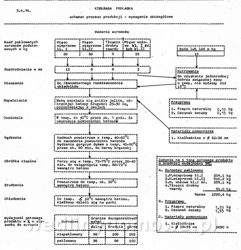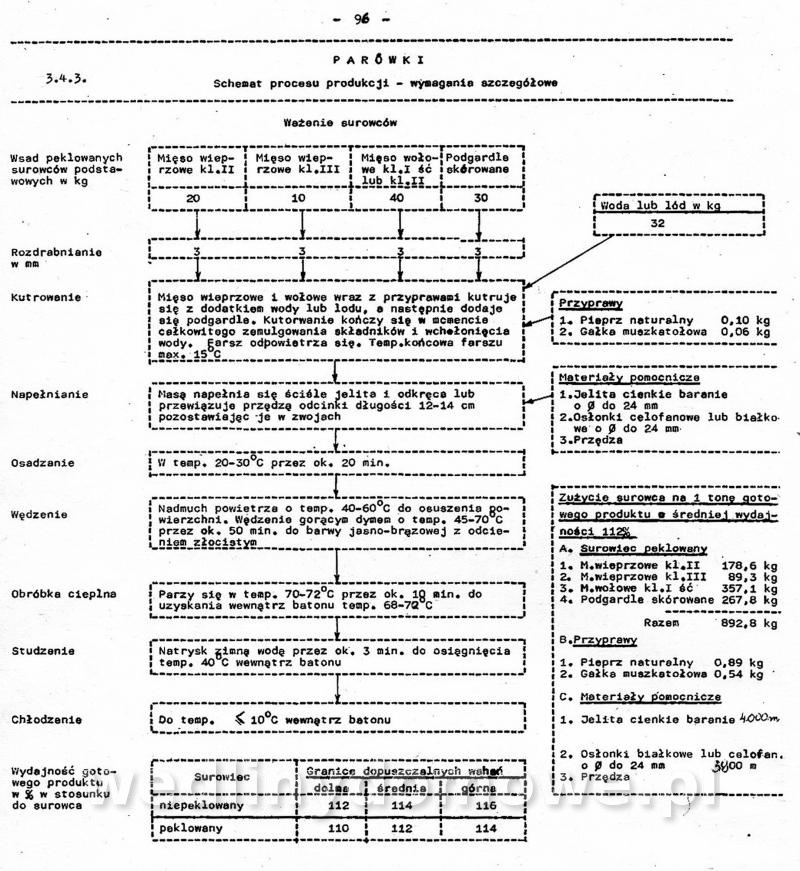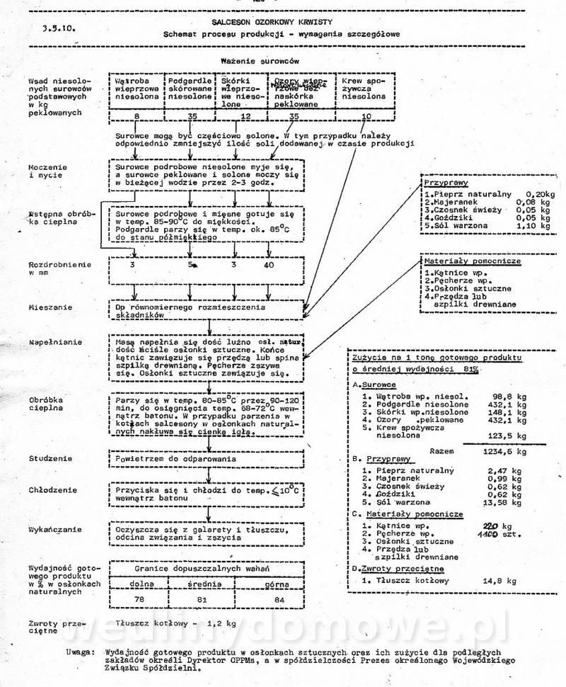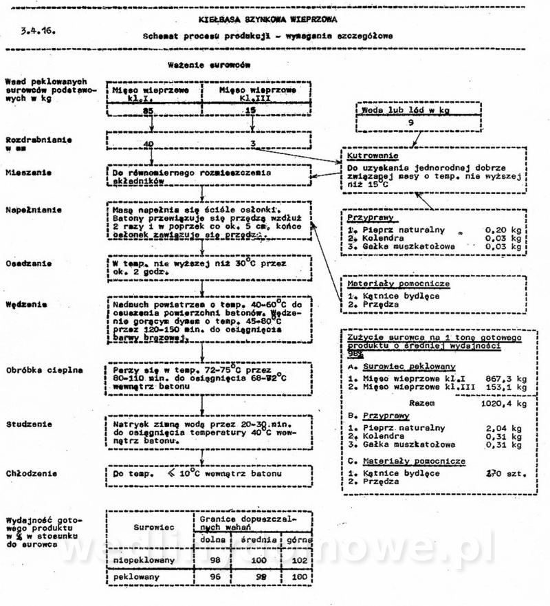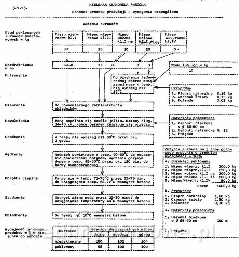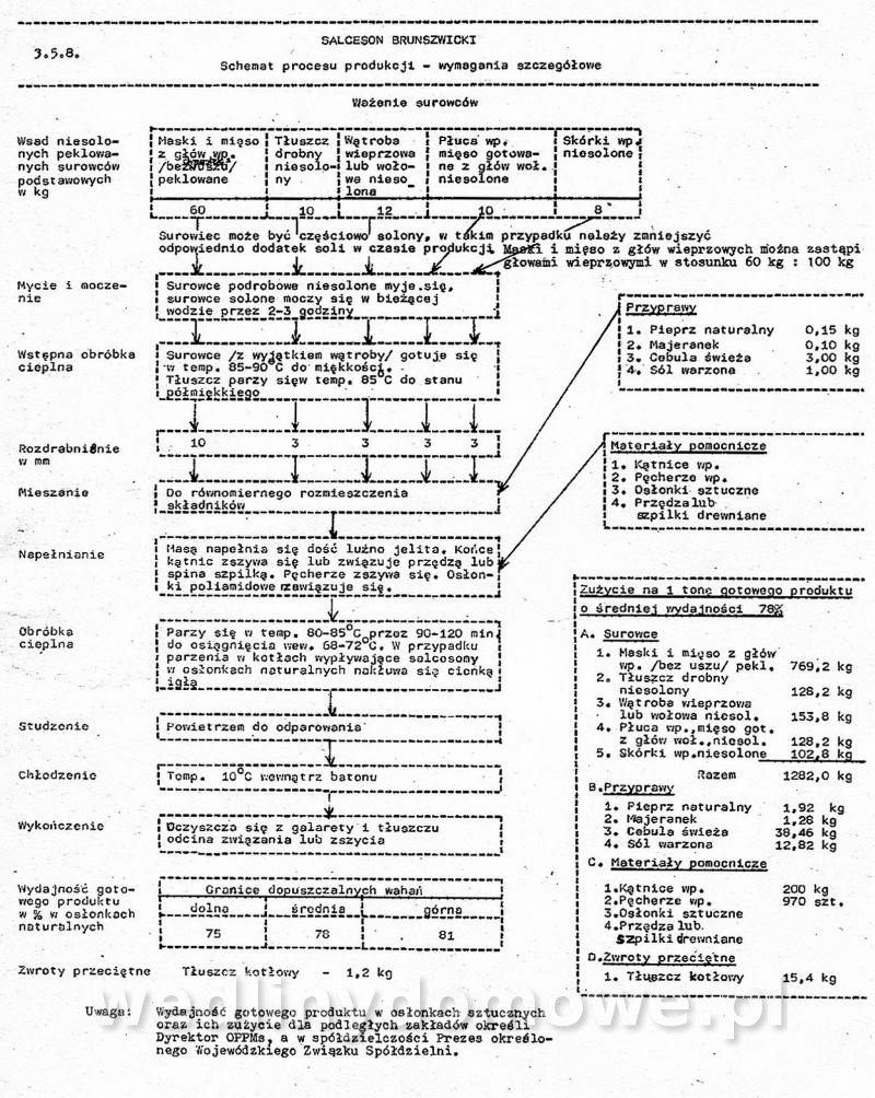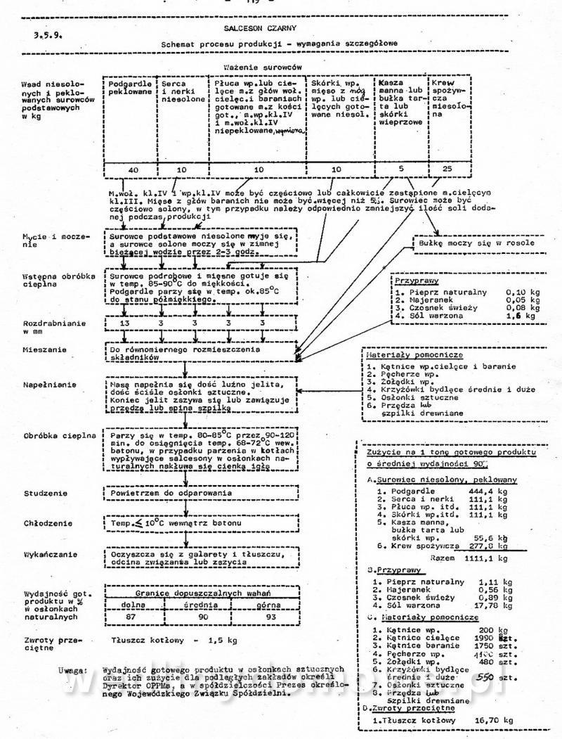 5. Dzisiaj rozpoczynam umieszczanie na forum unikalnego i bardzo dobrego materiału z zakresu technologii mięsa. Moim zdaniem jest to jeden z najwcześniejszych (młodszy jeszcze od 16-tki - z treści widać iż to ona była na nim wzorowana) zbiorów receptur opracowanych przez "SPOŁEM", poparty szerokim, specjalistycznym komentarzem. Zachęcam wszystkich do dokładnego zapoznania się z tym opracowaniem. SPIS TREŚCI (dla potrzeb wyszukiwarek) Antrykot – 123 Baleron gotowany – 171 Baleron wędzony – 174 Baleron wędzony (środkowy) – 176 Boczek gotowany – 178 Boczek wędzony – 180 Baranina w tuszach – norma jakościowa – 126 Biodrówka – 114 Boczek – 120 Cielęcina w tuszach – norma jakościowa – 126 Comber – 126 Części zasadnicze mięsa baraniego – 126 Części zasadnicze mięsa cielęcego – 124 Części zasadnicze mięsa wołowego – 121 Czynności przedubojowe – 96 Dopuszczanie do produkcji i obrotu nowych artykułów – 29 Dychawica – 12 Dychawica świszcząca – 12 Dyscyplina wykonawstwa rozdzielników – 11 Elementy kulinarne mięsa baraniego – 128 Elementy kulinarne mięsa cielęcego – 126 Elementy kulinarne mięsa wieprzowego – 114 Flaki baranie – 160 Flaki bydlęce – 155 Głowa barania – 160 Głowa bydlęca – 154 Głowa cielęca – 158 Głowa wieprzowa – 157 Goleń – 123 Goleń barania – 126 Goleń cielęca – 124 Goleń cielęca przednia – 124 Golonka przednia, tylna – 119 Golonka wędzona – 183 Górka barania – 128 Górka właściwa – 126 Gruźlica – 12 Instrukcja Nr 7 w sprawie organizacji i techniki zaopatrzenia w artykuły mięsno-tłuszczowe sklepów MHM – 70 Instrukcja w sprawie trwałego oznaczania towarów – 15 Instrukcja w sprawie transportu mięsa i przetworów mięsnych – 80 Jakościowy odbiór – instrukcja Nr 3 – 15 Jakościowy odbiór – instrukcja Nr 17 – 22 Jelita baranie cienkie – 476 Jelita bydlęce cienkie – 465 Jelita bydlęce środkowe – 466 Jelita cielęce cienkie – 487 Jelita grube wieprzowe – 459 Jelita końskie cienkie – 481 Jelita wiankowe – 465 Jelita wieprzowe cienkie – 455 Kabanosy – 185 Kabanosy pieczone końskie – 421 Karkówka wieprzowa – 114 Karkówka barania – 128 Karkówka cielęca – 126 Karkówka wołowa – 123 Kątnice baranie – 478 Kątnice bydlęce – 469 Kątnice cielęce – 485 Kiełbasa belgijska końska – 415 Kiełbasa biała surowa – 187 Kiełbasa bydgoska parzona – 189 Kiełbasa cytrynowa parzona – 192 Kiełbasa czosnkowa parzona – 195 Kiełbasa gnieźnieńska parzona – 199 Kiełbasa gorzowska końska – 420 Kiełbasa górska końska – 419 Kiełbasa jałowcowa pieczona podsuszana – 201 Kiełbasa kminkowa parzona – 204 Kiełbasa krakowska parzona – 207 Kiełbasa krakowska parzona sucha – 211 Kiełbasa kujawska parzona podsuszana – 214 Kiełbasa limanowska pieczona podsuszana – 216 Kiełbasa litewska pieczona podsuszana – 219 Kiełbasa myśliwska pieczona sucha – 223 Kiełbasa parówkowa parzona – 225 Kiełbasa piwna parzona podsuszana – 228 Kiełbasa podhalańska parzona podsuszana – 231 Kiełbasa polska wędzona – 234 Kiełbasa popularna końska – 426 Kiełbasa rzeszowska pieczona – 236 Kiełbasa serdelowa cielęca parzona – 239 Kiełbasa serdelowa końska – 427 Kiełbasa serdelowa parzona – 241 Kiełbasa śląska parzona – 245 Kiełbasa szynkowa parzona – 247 Kiełbasa tatarska końska – 415 Kiełbasa tuchowska pieczona podsuszana – 250 Kiełbasa turystyczna końska – 420 Kiełbasa ukraińska parzona podsuszana – 252 Kiełbasa węgierska wędzona – 255 Kiełbasa zwyczajna parzona – 257 Kiełbasa zwyczajna końska – 426 Kiełbasa żywiecka parzona podsuszana – 261 Kiełbasy nietrwałe końskie – 428 Kiełbasy półtrwałe końskie – 422 Kiełbasy trwałe z mięsa końskiego – 417 Kiełbaśnice – 455 Kiszka bułczana krwista – 334 Kiszka kaszana – gryczana popularna – 336 Kiszka kaszana jęczmienna końska – 432 Kiszka kaszana jęczmienna popularna – 339 Kiszka kaszana wyborowa gryczana – 342 Kiszka kaszana wyborowa jęczmienna – 345 Kiszka krwista – 348 Kiszka krwista zwyczajna – 351 Kiszka łódzka – 353 Kiszka pasztetowa – 356 Kiszka pasztetowa z manną – 359 Kiszka podgardlana – 361 Kiszka wątrobiana – 364 Kiszka wątrobiana końska – 432 Kiszka wątrobiana obornicka – 367 Klasy żywca w skupie – 107 Klasy ubojowe – 107 Konina w ćwierciach – norma jakościowa – 112 Konserwacja skór – 439 Kopyta końskie – 502 Kości spożywcze – 161 Kości techniczne – 506 Kotlet barani – 128 Krew spożywcza – 492 Krew techniczna – 493 Krezka – 158 Krupon świński – 442 Krzyżówki baranie – 480 Krzyżówki bydlęce – 471 Lico – 442 Łata – 126 Łopatka – 119 Łopatka cielęca – 121 Łój bydlęcy topiony jadalny – 406 Łykowatość – 12 Metka końska – 422 Metka wędzona – 264 Metody wędzenia – 164 Mięso bez kości na przetwory z mięsa rozdrobnionego – 150 Mięso bez kości z łopatki – 123 Mięso bez kości z udźca – 121 Mięso bez kości z udźca (cielęce) – 124 Mięso w obrocie hurtowym – 108 Mizdra – 442 Mniej wartościowe mięso, podroby i tłuszcze – 34 Mortadela cielęca parzona – 268 Mortadela parzona – 270 Mostek – 123 Mostek barani – 128 Mostek cielęcy – 126 Mózg barani – 160 Mózg bydlęcy – 155 Mózg cielęcy – 158 Mózg wieprzowy – 157 Nerki baranie – 160 Nerki bydlęce – 155 Nerki wieprzowe – 157 Nerkówka właściwa – 124 Nogi bydlęce – 155 Nogi cielęce – 158 Nogi wieprzowe – 157 Norma resortowa – pobieranie prób dla oceny organoleptycznej wędlin nietrwałych – 89 Norma resortowa – tymczasowe normy warunków transportu mięsa surowego i podrobów – 85 Norma resortowa – tymczasowe normy warunków transportu wędlin i wyrobów wędliniarskich – 83 Nosacizna – 12 Nóżki wędzone wieprzow