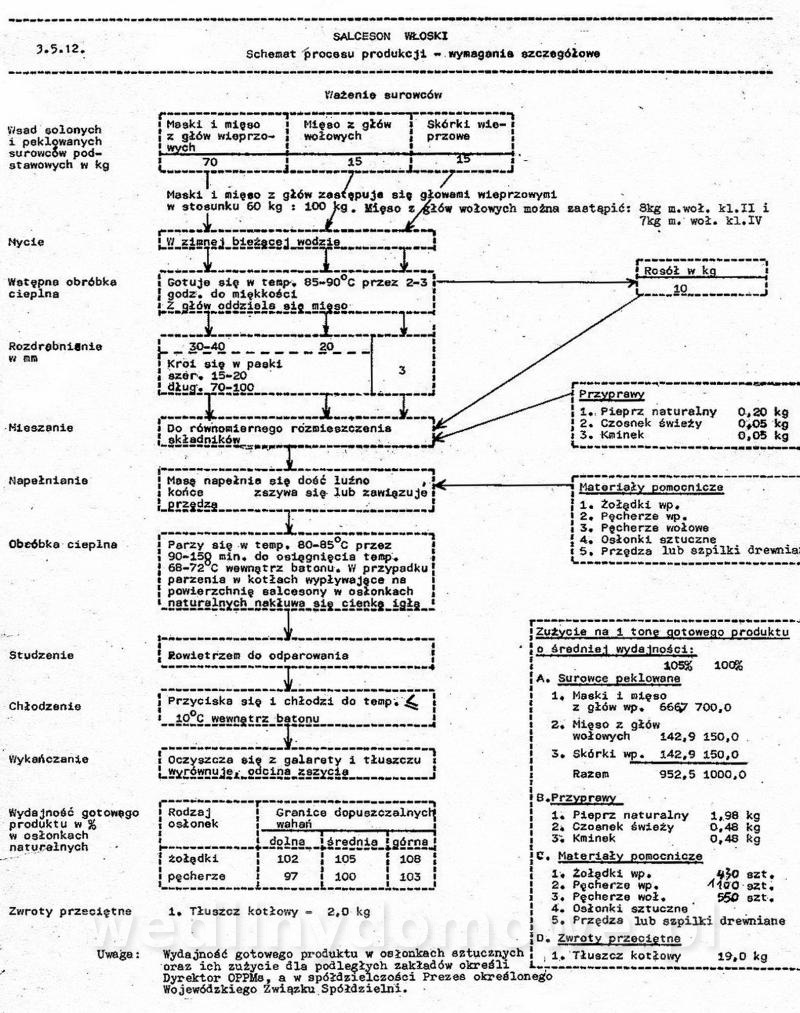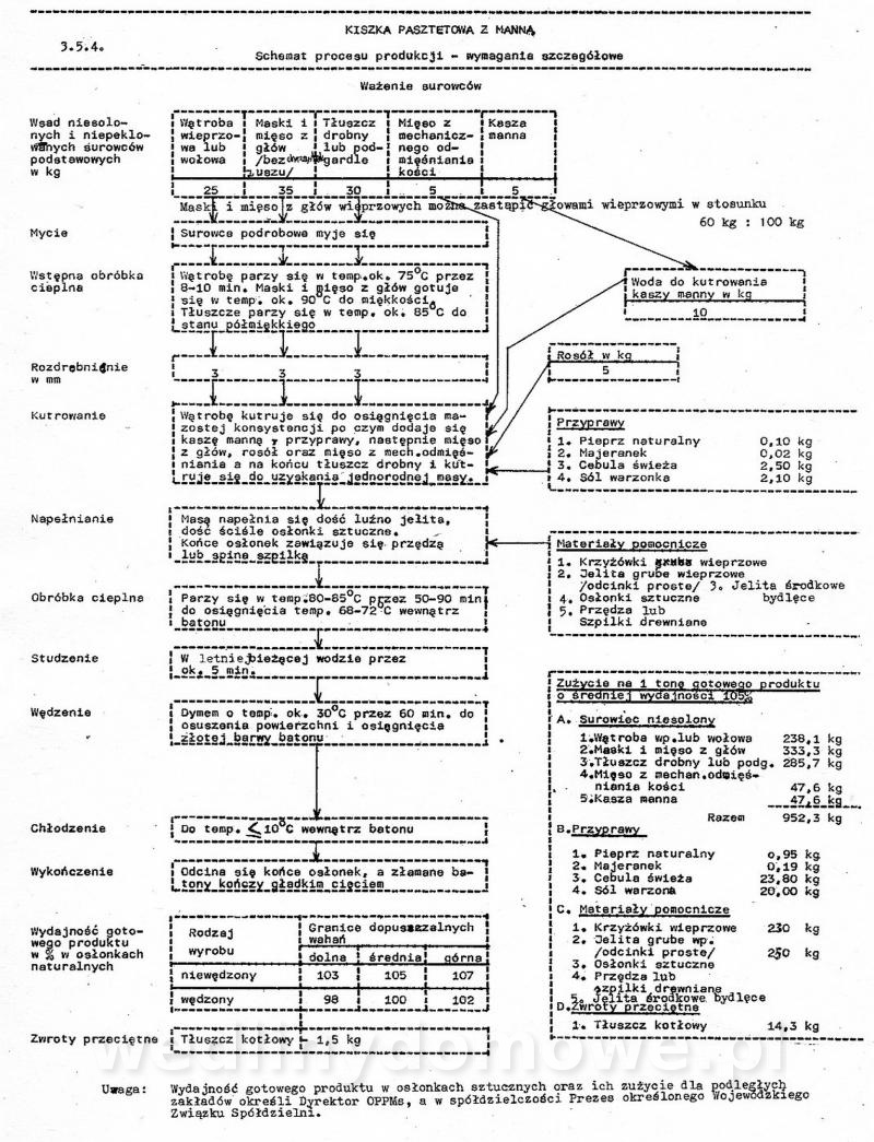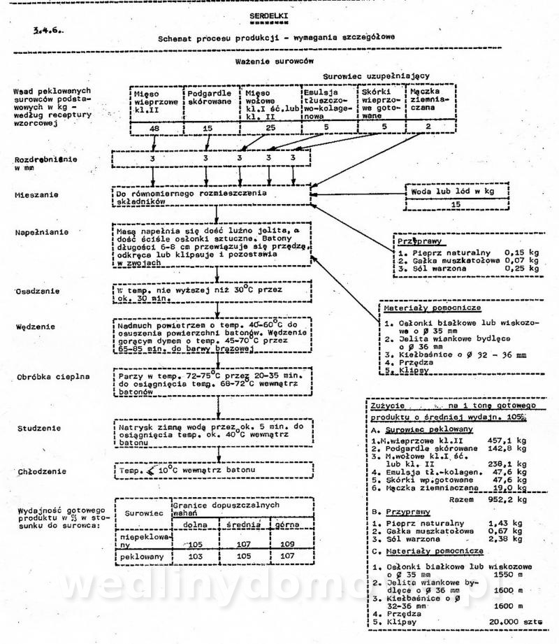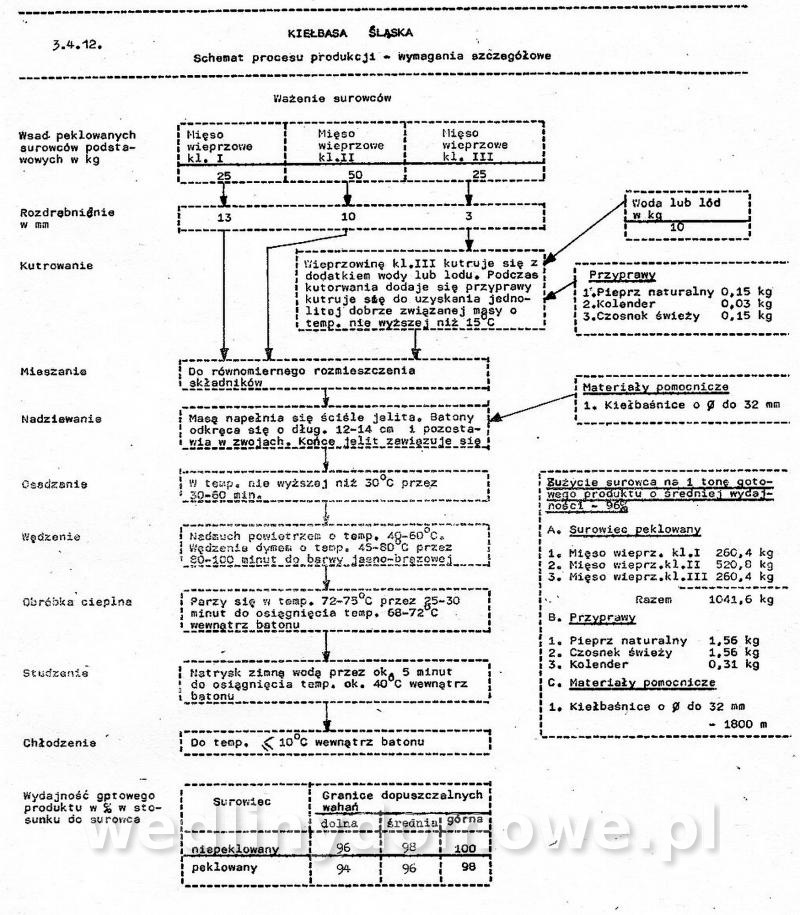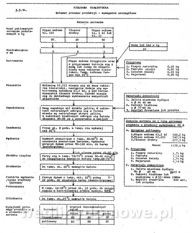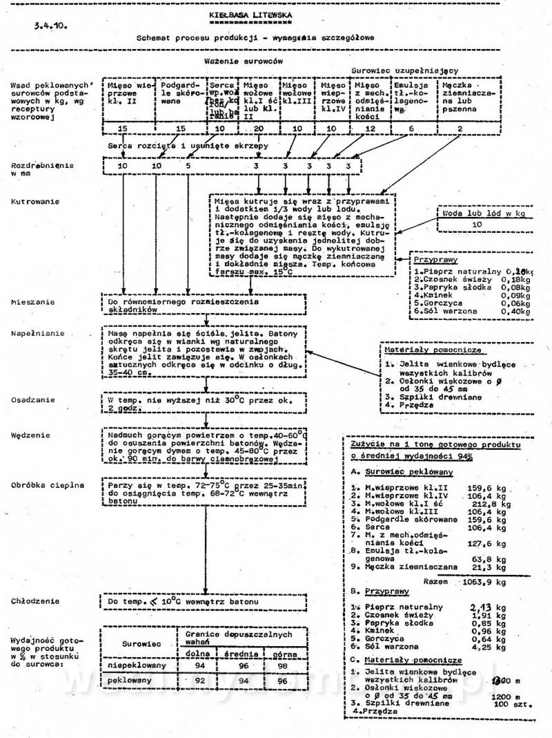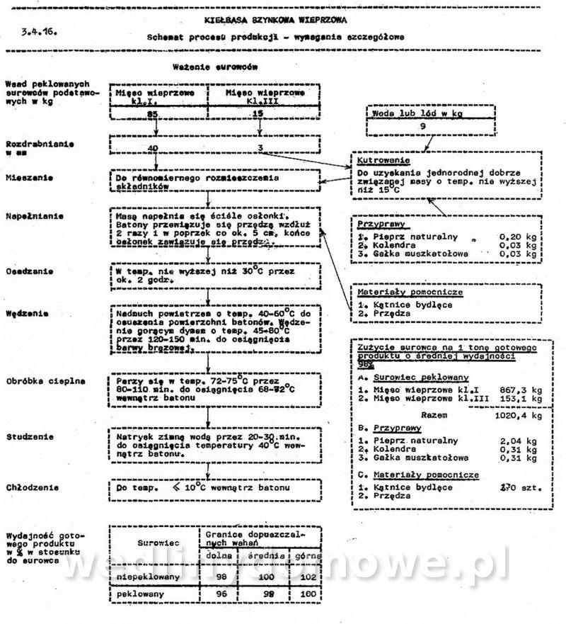 5. Dzisiaj rozpoczynam umieszczanie na forum unikalnego i bardzo dobrego materiału z zakresu technologii mięsa. Moim zdaniem jest to jeden z najwcześniejszych (młodszy jeszcze od 16-tki - z treści widać iż to ona była na nim wzorowana) zbiorów receptur opracowanych przez "SPOŁEM", poparty szerokim, specjalistycznym komentarzem. Zachęcam wszystkich do dokładnego zapoznania się z tym opracowaniem. SPIS TREŚCI (dla potrzeb wyszukiwarek) Antrykot – 123 Baleron gotowany – 171 Baleron wędzony – 174 Baleron wędzony (środkowy) – 176 Boczek gotowany – 178 Boczek wędzony – 180 Baranina w tuszach – norma jakościowa – 126 Biodrówka – 114 Boczek – 120 Cielęcina w tuszach – norma jakościowa – 126 Comber – 126 Części zasadnicze mięsa baraniego – 126 Części zasadnicze mięsa cielęcego – 124 Części zasadnicze mięsa wołowego – 121 Czynności przedubojowe – 96 Dopuszczanie do produkcji i obrotu nowych artykułów – 29 Dychawica – 12 Dychawica świszcząca – 12 Dyscyplina wykonawstwa rozdzielników – 11 Elementy kulinarne mięsa baraniego – 128 Elementy kulinarne mięsa cielęcego – 126 Elementy kulinarne mięsa wieprzowego – 114 Flaki baranie – 160 Flaki bydlęce – 155 Głowa barania – 160 Głowa bydlęca – 154 Głowa cielęca – 158 Głowa wieprzowa – 157 Goleń – 123 Goleń barania – 126 Goleń cielęca – 124 Goleń cielęca przednia – 124 Golonka przednia, tylna – 119 Golonka wędzona – 183 Górka barania – 128 Górka właściwa – 126 Gruźlica – 12 Instrukcja Nr 7 w sprawie organizacji i techniki zaopatrzenia w artykuły mięsno-tłuszczowe sklepów MHM – 70 Instrukcja w sprawie trwałego oznaczania towarów – 15 Instrukcja w sprawie transportu mięsa i przetworów mięsnych – 80 Jakościowy odbiór – instrukcja Nr 3 – 15 Jakościowy odbiór – instrukcja Nr 17 – 22 Jelita baranie cienkie – 476 Jelita bydlęce cienkie – 465 Jelita bydlęce środkowe – 466 Jelita cielęce cienkie – 487 Jelita grube wieprzowe – 459 Jelita końskie cienkie – 481 Jelita wiankowe – 465 Jelita wieprzowe cienkie – 455 Kabanosy – 185 Kabanosy pieczone końskie – 421 Karkówka wieprzowa – 114 Karkówka barania – 128 Karkówka cielęca – 126 Karkówka wołowa – 123 Kątnice baranie – 478 Kątnice bydlęce – 469 Kątnice cielęce – 485 Kiełbasa belgijska końska – 415 Kiełbasa biała surowa – 187 Kiełbasa bydgoska parzona – 189 Kiełbasa cytrynowa parzona – 192 Kiełbasa czosnkowa parzona – 195 Kiełbasa gnieźnieńska parzona – 199 Kiełbasa gorzowska końska – 420 Kiełbasa górska końska – 419 Kiełbasa jałowcowa pieczona podsuszana – 201 Kiełbasa kminkowa parzona – 204 Kiełbasa krakowska parzona – 207 Kiełbasa krakowska parzona sucha – 211 Kiełbasa kujawska parzona podsuszana – 214 Kiełbasa limanowska pieczona podsuszana – 216 Kiełbasa litewska pieczona podsuszana – 219 Kiełbasa myśliwska pieczona sucha – 223 Kiełbasa parówkowa parzona – 225 Kiełbasa piwna parzona podsuszana – 228 Kiełbasa podhalańska parzona podsuszana – 231 Kiełbasa polska wędzona – 234 Kiełbasa popularna końska – 426 Kiełbasa rzeszowska pieczona – 236 Kiełbasa serdelowa cielęca parzona – 239 Kiełbasa serdelowa końska – 427 Kiełbasa serdelowa parzona – 241 Kiełbasa śląska parzona – 245 Kiełbasa szynkowa parzona – 247 Kiełbasa tatarska końska – 415 Kiełbasa tuchowska pieczona podsuszana – 250 Kiełbasa turystyczna końska – 420 Kiełbasa ukraińska parzona podsuszana – 252 Kiełbasa węgierska wędzona – 255 Kiełbasa zwyczajna parzona – 257 Kiełbasa zwyczajna końska – 426 Kiełbasa żywiecka parzona podsuszana – 261 Kiełbasy nietrwałe końskie – 428 Kiełbasy półtrwałe końskie – 422 Kiełbasy trwałe z mięsa końskiego – 417 Kiełbaśnice – 455 Kiszka bułczana krwista – 334 Kiszka kaszana – gryczana popularna – 336 Kiszka kaszana jęczmienna końska – 432 Kiszka kaszana jęczmienna popularna – 339 Kiszka kaszana wyborowa gryczana – 342 Kiszka kaszana wyborowa jęczmienna – 345 Kiszka krwista – 348 Kiszka krwista zwyczajna – 351 Kiszka łódzka – 353 Kiszka pasztetowa – 356 Kiszka pasztetowa z manną – 359 Kiszka podgardlana – 361 Kiszka wątrobiana – 364 Kiszka wątrobiana końska – 432 Kiszka wątrobiana obornicka – 367 Klasy żywca w skupie – 107 Klasy ubojowe – 107 Konina w ćwierciach – norma jakościowa – 112 Konserwacja skór – 439 Kopyta końskie – 502 Kości spożywcze – 161 Kości techniczne – 506 Kotlet barani – 128 Krew spożywcza – 492 Krew techniczna – 493 Krezka – 158 Krupon świński – 442 Krzyżówki baranie – 480 Krzyżówki bydlęce – 471 Lico – 442 Łata – 126 Łopatka – 119 Łopatka cielęca – 121 Łój bydlęcy topiony jadalny – 406 Łykowatość – 12 Metka końska – 422 Metka wędzona – 264 Metody wędzenia – 164 Mięso bez kości na przetwory z mięsa rozdrobnionego – 150 Mięso bez kości z łopatki – 123 Mięso bez kości z udźca – 121 Mięso bez kości z udźca (cielęce) – 124 Mięso w obrocie hurtowym – 108 Mizdra – 442 Mniej wartościowe mięso, podroby i tłuszcze – 34 Mortadela cielęca parzona – 268 Mortadela parzona – 270 Mostek – 123 Mostek barani – 128 Mostek cielęcy – 126 Mózg barani – 160 Mózg bydlęcy – 155 Mózg cielęcy – 158 Mózg wieprzowy – 157 Nerki baranie – 160 Nerki bydlęce – 155 Nerki wieprzowe – 157 Nerkówka właściwa – 124 Nogi bydlęce – 155 Nogi cielęce – 158 Nogi wieprzowe – 157 Norma resortowa – pobieranie prób dla oceny organoleptycznej wędlin nietrwałych – 89 Norma resortowa – tymczasowe normy warunków transportu mięsa surowego i podrobów – 85 Norma resortowa – tymczasowe normy warunków transportu wędlin i wyrobów wędliniarskich – 83 Nosacizna – 12 Nóżki wędzone wieprzow