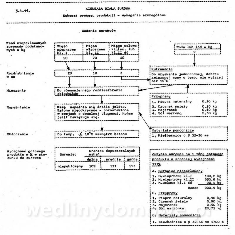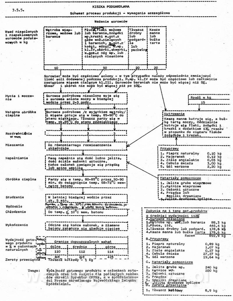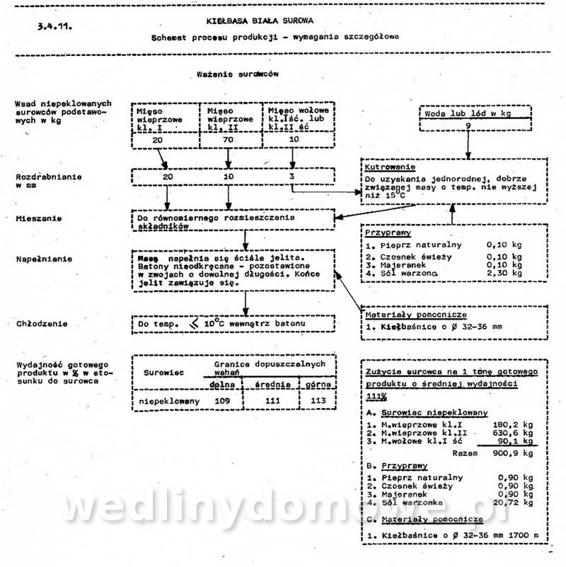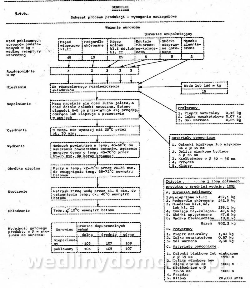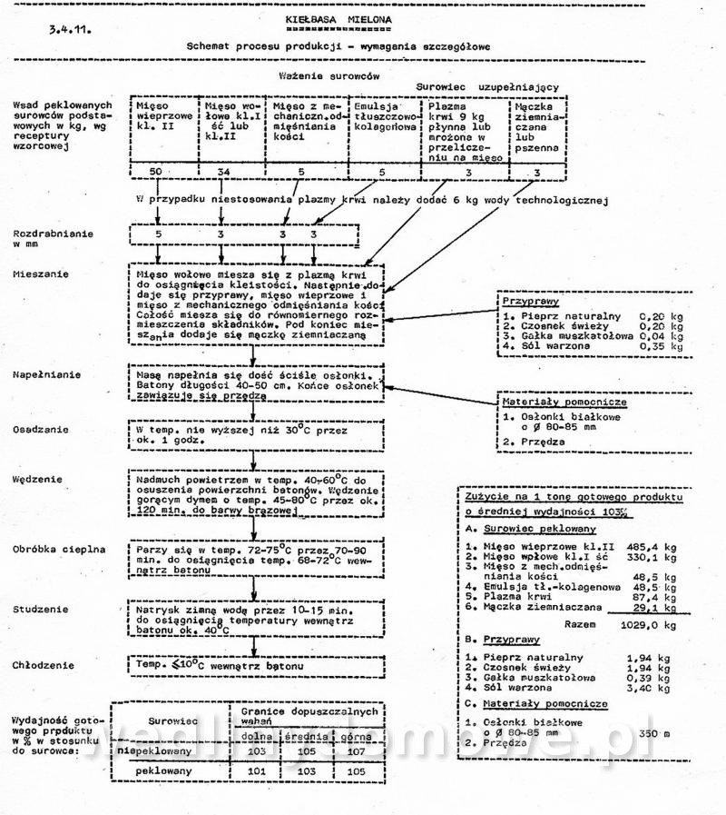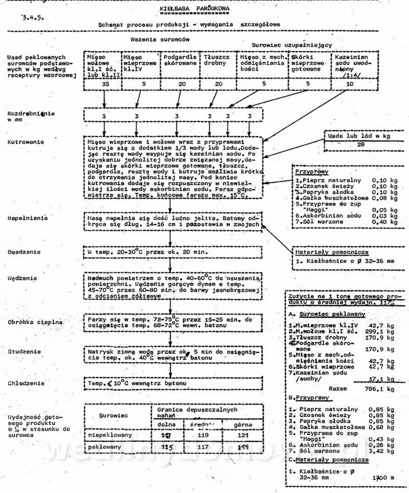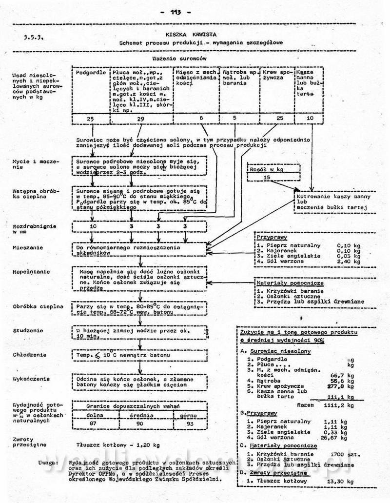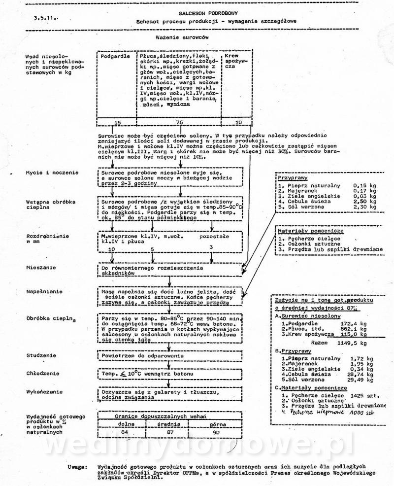 5. Dzisiaj rozpoczynam umieszczanie na forum unikalnego i bardzo dobrego materiału z zakresu technologii mięsa. Moim zdaniem jest to jeden z najwcześniejszych (młodszy jeszcze od 16-tki - z treści widać iż to ona była na nim wzorowana) zbiorów receptur opracowanych przez "SPOŁEM", poparty szerokim, specjalistycznym komentarzem. Zachęcam wszystkich do dokładnego zapoznania się z tym opracowaniem. SPIS TREŚCI (dla potrzeb wyszukiwarek) Antrykot – 123 Baleron gotowany – 171 Baleron wędzony – 174 Baleron wędzony (środkowy) – 176 Boczek gotowany – 178 Boczek wędzony – 180 Baranina w tuszach – norma jakościowa – 126 Biodrówka – 114 Boczek – 120 Cielęcina w tuszach – norma jakościowa – 126 Comber – 126 Części zasadnicze mięsa baraniego – 126 Części zasadnicze mięsa cielęcego – 124 Części zasadnicze mięsa wołowego – 121 Czynności przedubojowe – 96 Dopuszczanie do produkcji i obrotu nowych artykułów – 29 Dychawica – 12 Dychawica świszcząca – 12 Dyscyplina wykonawstwa rozdzielników – 11 Elementy kulinarne mięsa baraniego – 128 Elementy kulinarne mięsa cielęcego – 126 Elementy kulinarne mięsa wieprzowego – 114 Flaki baranie – 160 Flaki bydlęce – 155 Głowa barania – 160 Głowa bydlęca – 154 Głowa cielęca – 158 Głowa wieprzowa – 157 Goleń – 123 Goleń barania – 126 Goleń cielęca – 124 Goleń cielęca przednia – 124 Golonka przednia, tylna – 119 Golonka wędzona – 183 Górka barania – 128 Górka właściwa – 126 Gruźlica – 12 Instrukcja Nr 7 w sprawie organizacji i techniki zaopatrzenia w artykuły mięsno-tłuszczowe sklepów MHM – 70 Instrukcja w sprawie trwałego oznaczania towarów – 15 Instrukcja w sprawie transportu mięsa i przetworów mięsnych – 80 Jakościowy odbiór – instrukcja Nr 3 – 15 Jakościowy odbiór – instrukcja Nr 17 – 22 Jelita baranie cienkie – 476 Jelita bydlęce cienkie – 465 Jelita bydlęce środkowe – 466 Jelita cielęce cienkie – 487 Jelita grube wieprzowe – 459 Jelita końskie cienkie – 481 Jelita wiankowe – 465 Jelita wieprzowe cienkie – 455 Kabanosy – 185 Kabanosy pieczone końskie – 421 Karkówka wieprzowa – 114 Karkówka barania – 128 Karkówka cielęca – 126 Karkówka wołowa – 123 Kątnice baranie – 478 Kątnice bydlęce – 469 Kątnice cielęce – 485 Kiełbasa belgijska końska – 415 Kiełbasa biała surowa – 187 Kiełbasa bydgoska parzona – 189 Kiełbasa cytrynowa parzona – 192 Kiełbasa czosnkowa parzona – 195 Kiełbasa gnieźnieńska parzona – 199 Kiełbasa gorzowska końska – 420 Kiełbasa górska końska – 419 Kiełbasa jałowcowa pieczona podsuszana – 201 Kiełbasa kminkowa parzona – 204 Kiełbasa krakowska parzona – 207 Kiełbasa krakowska parzona sucha – 211 Kiełbasa kujawska parzona podsuszana – 214 Kiełbasa limanowska pieczona podsuszana – 216 Kiełbasa litewska pieczona podsuszana – 219 Kiełbasa myśliwska pieczona sucha – 223 Kiełbasa parówkowa parzona – 225 Kiełbasa piwna parzona podsuszana – 228 Kiełbasa podhalańska parzona podsuszana – 231 Kiełbasa polska wędzona – 234 Kiełbasa popularna końska – 426 Kiełbasa rzeszowska pieczona – 236 Kiełbasa serdelowa cielęca parzona – 239 Kiełbasa serdelowa końska – 427 Kiełbasa serdelowa parzona – 241 Kiełbasa śląska parzona – 245 Kiełbasa szynkowa parzona – 247 Kiełbasa tatarska końska – 415 Kiełbasa tuchowska pieczona podsuszana – 250 Kiełbasa turystyczna końska – 420 Kiełbasa ukraińska parzona podsuszana – 252 Kiełbasa węgierska wędzona – 255 Kiełbasa zwyczajna parzona – 257 Kiełbasa zwyczajna końska – 426 Kiełbasa żywiecka parzona podsuszana – 261 Kiełbasy nietrwałe końskie – 428 Kiełbasy półtrwałe końskie – 422 Kiełbasy trwałe z mięsa końskiego – 417 Kiełbaśnice – 455 Kiszka bułczana krwista – 334 Kiszka kaszana – gryczana popularna – 336 Kiszka kaszana jęczmienna końska – 432 Kiszka kaszana jęczmienna popularna – 339 Kiszka kaszana wyborowa gryczana – 342 Kiszka kaszana wyborowa jęczmienna – 345 Kiszka krwista – 348 Kiszka krwista zwyczajna – 351 Kiszka łódzka – 353 Kiszka pasztetowa – 356 Kiszka pasztetowa z manną – 359 Kiszka podgardlana – 361 Kiszka wątrobiana – 364 Kiszka wątrobiana końska – 432 Kiszka wątrobiana obornicka – 367 Klasy żywca w skupie – 107 Klasy ubojowe – 107 Konina w ćwierciach – norma jakościowa – 112 Konserwacja skór – 439 Kopyta końskie – 502 Kości spożywcze – 161 Kości techniczne – 506 Kotlet barani – 128 Krew spożywcza – 492 Krew techniczna – 493 Krezka – 158 Krupon świński – 442 Krzyżówki baranie – 480 Krzyżówki bydlęce – 471 Lico – 442 Łata – 126 Łopatka – 119 Łopatka cielęca – 121 Łój bydlęcy topiony jadalny – 406 Łykowatość – 12 Metka końska – 422 Metka wędzona – 264 Metody wędzenia – 164 Mięso bez kości na przetwory z mięsa rozdrobnionego – 150 Mięso bez kości z łopatki – 123 Mięso bez kości z udźca – 121 Mięso bez kości z udźca (cielęce) – 124 Mięso w obrocie hurtowym – 108 Mizdra – 442 Mniej wartościowe mięso, podroby i tłuszcze – 34 Mortadela cielęca parzona – 268 Mortadela parzona – 270 Mostek – 123 Mostek barani – 128 Mostek cielęcy – 126 Mózg barani – 160 Mózg bydlęcy – 155 Mózg cielęcy – 158 Mózg wieprzowy – 157 Nerki baranie – 160 Nerki bydlęce – 155 Nerki wieprzowe – 157 Nerkówka właściwa – 124 Nogi bydlęce – 155 Nogi cielęce – 158 Nogi wieprzowe – 157 Norma resortowa – pobieranie prób dla oceny organoleptycznej wędlin nietrwałych – 89 Norma resortowa – tymczasowe normy warunków transportu mięsa surowego i podrobów – 85 Norma resortowa – tymczasowe normy warunków transportu wędlin i wyrobów wędliniarskich – 83 Nosacizna – 12 Nóżki wędzone wieprzow