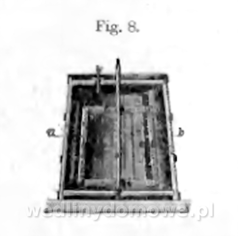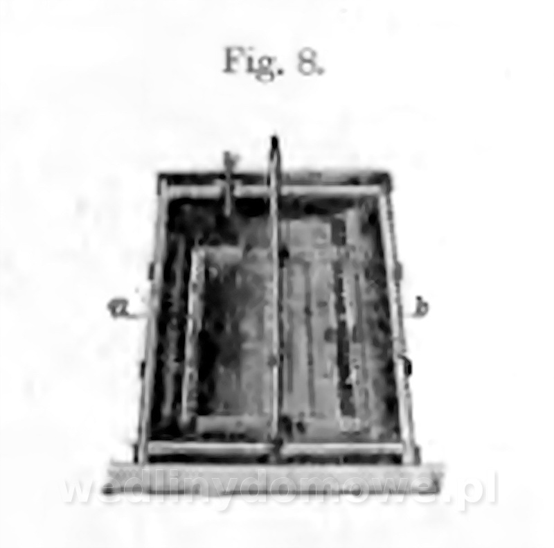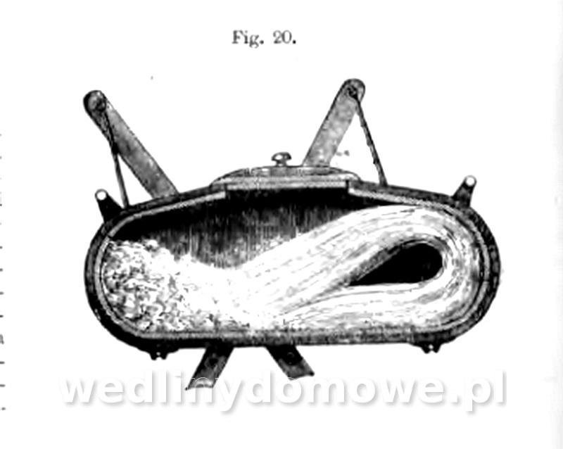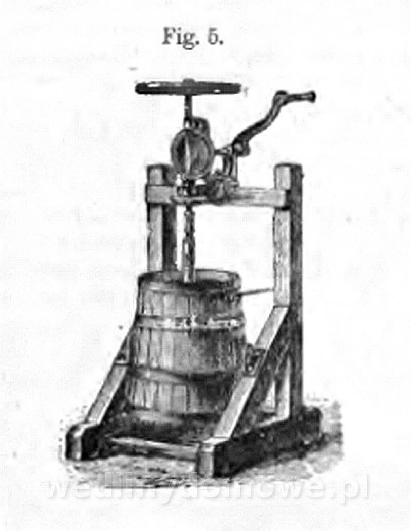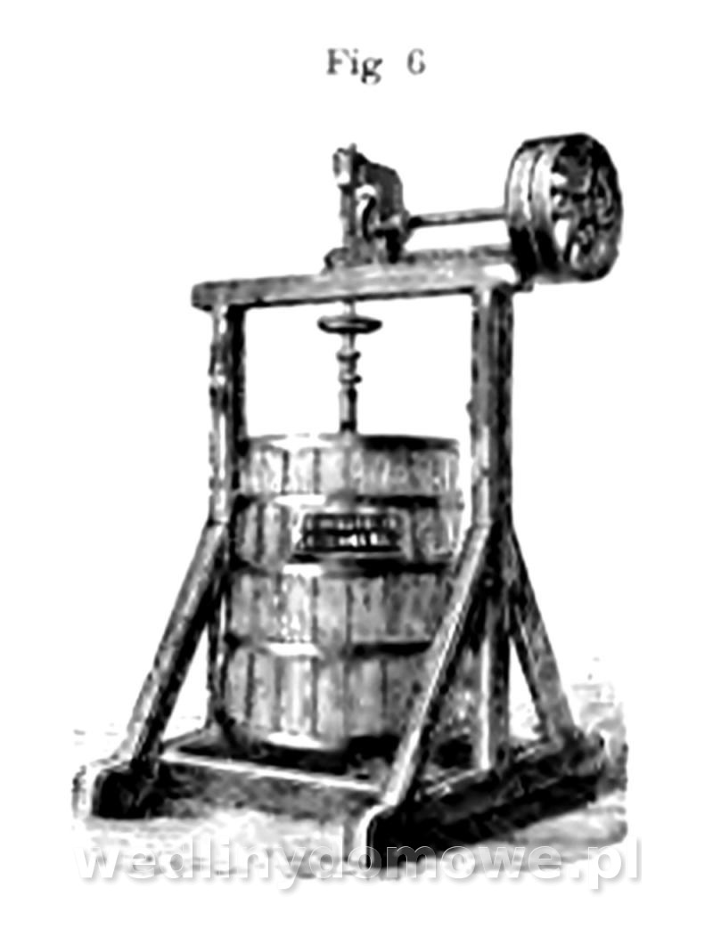 dolny o szerokości 60 mm i głębokości 30 mm w odległości 100 mm od obwodu dolnego kadzi. Tuż ponad dnem kadzi znajduje się otwór czopowy o średnicy 50 mm, zamykany drewnianym czopem. Dno kadzi wykonane jest z klepek o grubości 80 mm, szerokości 140—200 mm, łączonych kołkami w ilości 2—3 na każde połączenie. Średnica dna wynosi 1970 mm. Prócz tego dno musi być wzmocnione dwoma ryglami dębowymi, ściętymi na końcach stożkowo. Rygle są umieszczone pod dnem w poprzek klepek w odległości jeden od drugiego o 1/3% średnicy dna. Wymiary rygla: długość 1835 mm, szerokość 100 mm i grubość 100 mm. Rygle przymocowane są do klepek dna klinami i kołkami. Kadź ma 4 obręcze górne i 4 obręcze dolne, wykonane z żelaznych płaskowników lub z okrągłych prętów ze stali pospolitej o średnicy 20 mm. Obręcze muszą być zaopatrzone w ściągacze śrubowe. Szerokość płaskowników wynosi 80 mm, grubość (szczególnie obręczy wątorowej) — 5 mm. Pozostałe obręcze mogą mieć grubość 4,5 mm. Wymiary tej kadzi wynoszą: zewnętrzne — wysokość 2300 mm średnica podstawy 1970 mm średnica szczytu 2190 mm wewnętrzne — wysokość 2040 mm średnica podstawy 1830 mm średnica szczytu 2040 mm Beczki. Beczki o pojemności od 100 do 200 l służą w przemyśle kiszarniczym przeważnie do wysyłki gotowej kiszonki. Przed wysyłką odbywa się w nich dofermentowywanie kapusty. Czasem jeszcze w małych kiszarniach kisi się kapustę w beczkach, lecz powoduje to bardzo duże ubytki. Beczki są zamykane denkiem (deklem). Beczki powinny być wykonane z drewna twardego, a klepki powinny być wzmocnione obręczami, aby przy przenoszeniu i transporcie nie ulegały szybkiemu zniszczeniu. Najlepsze są beczki i kadzie dębowe, dobre są modrzewiowe i bukowe, a więc z drewna twardego lub grabowe, olchowe, kasztanowe i lipowe. Drewno świerkowe jest słabe i porowate. Beczki z drewna świerkowego są nietrwałe, są one jednak spotykane dość często. W celu usunięcia porowatości drewna należy beczki świerkowe wewnątrz dobrze wyparafinować. Parafina musi być wtopiona w drewno tak, aby klepki wewnątrz były gładkie jak dobrze wyfroterowana posadzka. Należy podkreślić, że parafinowanie beczek i kadzi jest u nas na ogół wykonywane niewłaściwie, gdyż parafinę nakłada się zwykle grubą warstwą wskutek czego przy lekkim nawet wstrząsaniu beczką odpada ona kawałami. Kadzie i beczki wysyłkowe należy przed sezonem sprawdzić na szczelność, wyremontować, wymoczyć przez kilka dni, wyszorować i dokładnie wymyć, a następnie wydezynfekować. W kiszarniach lepiej jest jednak przejść z systemu kiszenia kadziowo-beczkowego na system silosowy. Pamiętać należy, że od czystości i stopnia odkażenia naczyń, urządzeń i zbiorników zależy dobra jakość kiszonki. Kapusta po poszatkowaniu musi być natychmiast ładowana do zbiornika, gdyż wskutek działania tlenu powietrza następuje rozkład cennych związków chemicznych zawartych w kapuście. Pamiętać trzeba o tym, aby ładować do zbiorników kapustę według odmian. Mieszanie odmian w jednym zbiorniku jest niewskazane z uwagi na to, że otrzymuje się wtedy kiszonkę niejednolitej jakości. Poszatkowaną kapustę soli się solą kuchenną w ilości 2—2,5%. Jednocześnie dodaje się do niej odpowiednio przygotowane przyprawy. Przyprawy i sól powinny być dozowane równomiernie. Czynność tę wykonuje się ręcznie lub za pomocą automatycznej dozownicy w czasie przesuwania się krajanki z taśmą przenośnika łączącego szatkownicę ze zbiornikiem. Czystość przenośników służących do przesyłania krajanki do zbiorników nie może wzbudzać zastrzeżeń. Jeśli szatkownicę znajdują się na piętrze, a zbiorniki na dole, to ładowanie krajanki odbywa się za pomocą podnośników lub grawitacyjnie, tzn. że kapusta własnym ciężarem spada z krajalnicy ustawionej nad otworem w podłodze do znajdującego się na dole zbiornika. Przed ładowaniem krajanki dno zbiorników należy pokryć warstwą białych zdrowych liści kapusty. Liście te należy także wymyć i odkazić. Grubość warstwy liści powinna wynosić 5 cm. Do obsługi każdego zbiornika służy brygada pracowników. Muszą oni uprzednio wykąpać się lub dokładnie wymyć w łaźni i przebrać w czyste kombinezony i berety oraz odkażone buty gumowe. W butach gumowych nie wolno pracownikom chodzić na zewnątrz zbiornika, a po opuszczeniu zbiornika buty po uprzednim ich spłukaniu i odkażeniu środkiem dezynfekcyjnym należy ustawić na czystym podeście w pobliżu zbiornika. Palenie papierosów i spożywanie posiłków w basenie jest wzbronione. Nadsyłaną krajankę rozgarnia się równomiernie po powierzchni zbiornika za pomocą grabi drewnianych, które powinny być także uprzednio wyszorowane i odkażone, przy czym starannie ubija się ją w celu odpowietrzenia. Częściowe odpowietrzenie kapusty następuje już w czasie jej szatkowania. Im kapusta jest szatkowana drobniej, tym mniejsza jest w niej zawartość powietrza i tym wyższy jest jej ciężar właściwy. Gdy szerokość skrawków wynosi 25 mm, to ciężar właściwy wynosi 0,868, a zawartość powietrza 16,3% objętościowych. Gdy szerokość skrawków wynosi 15 mm, to ciężar właściwy wynosi 0,898, a zawartość powietrza wynosi 13,3% objętościowych. Gdy szerokość skrawków wynosi 5 mm, to ciężar właściwy = 0,942, a zawartość powietrza wynosi 8,9% objętościowych. Tłumaczy się to tym, że przy szatkowaniu kapusty następuje rozerwanie i zmiażdżenie jej tkanek, co pozwala na usunięcie powietrza z przestrzeni międzykomórkowych tkanki liściowej. Poza tym w krajance znajduje się powietrze, które dostało się między wiórki kapusty przy ładowaniu jej do zbiornika. Przez stopniowe dokładne ubijanie krajanki następuje dalsze jej odpowietrzanie i przyspieszanie wydobywania się soku komórkowego z kapusty. Ubijanie powinno