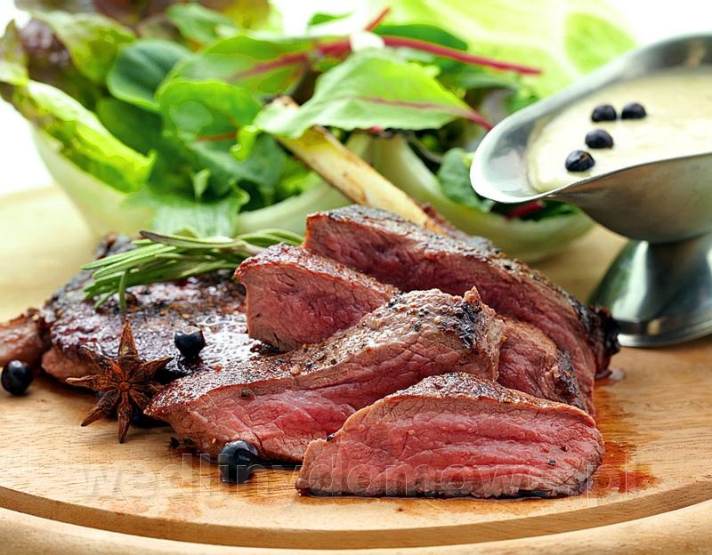 PRZEPISY NA POTRAWY Z MIĘSA KOŃSKIEGO Steki z mięsa końskiego przygotowane do smażenia/dreamstime.com a. Potrawy gotowane Na rosół i sztukę mięsa nadaje się bardzo dobrze część krzyżowa udźca. I w tym jednak przypadku chcąc otrzymać smaczną potrawę należy zastosować specjalny sposób gotowania, różniący się nieco od gotowania mięsa wołowego. Kawałek mięsa przeznaczonego na rosół obgotowuje się najpierw w małej ilości wody (zalewa się zimną wodą). Po lekkim obgotowaniu wodę zlewa się, a mięso wkłada do czystej zimnej wody, soli i gotuje bez żadnych innych przypraw na wolnym ogniu w ciągu 3 godz. Następnie dodaje się przyprawy i włoszczyznę i gotuje do miękkości. Gotowanie musi odbywać się przez cały czas w naczyniu bez przykrycia. Rosół w ten sposób przyrządzony odznacza się dobrym smakiem (w smaku przypomina rosół z gęsiny), a sztuka mięsa bardzo mało różni się od wołowiny. Dobre w smaku jest gotowane serce zwłaszcza, jeżeli po ugotowaniu podda się je dalszej obróbce - smażeniu po pokrajaniu w płaty i opanierowaniu. Niżej są podane przepisy na najbardziej popularne potrawy z koniny przyrządzone zgodnie ze zbiorem przepisów zatwierdzonych przez Ministerstwo Handlu Wewnętrznego do użytku zakładów gastronomicznych. W praktyce gospodarstw domowych najczęściej jest stosowane przyrządzanie potraw z mięsa końskiego wg przepisów Zofii Czerny. Niektóre z tych przepisów są podane obok przepisów stosowanych przez zakłady gastronomiczne. Sztuka mięsa (nr mk II-1). Ciężar porcji - 100 g. 1. Mięso b.k. (krzyżowa, plecowa, może być antrykot b.k. w ilości ok. 2,14 kg lub "łata” w ilości ok. 1,55 kg) 1,65 kg 2. Marchew 0,10 kg 3. Pietruszka 0,15 kg 4. Seler 0,15 kg 5. Cebula 0,06 kg 6. Liście bobkowe 0,001 kg 7. Ziele angielskie 0,001 kg 8. Sól 0,02 kg Sztuka mięsa z rosołu. Produkty: 1,50 kg dojrzałego mięsa z k. (mostek, krzyżowa), 25 dkg włoszczyzny, 5 dkg cebuli, sól, liście bobkowe, ziele angielskie. Przyrządzanie: 1. Kości opłukać, porąbać, zalać wodą, podgotować; 2. Mięso z wrośniętymi kośćmi opłukać, wrzucić do wywaru zagotować na silnym ogniu, odsunąć, po czym gotować powoli pod przykryciem ok. 4 godz. 3. Włoszczyznę oczyścić, opłukać; 4. Cebulę opłukać, przepołowić wraz z łuskami, położyć przekrojem na płycie, zrumienić; 5. Gdy mięso jest na dogotowaniu, wrzucić do wywaru włoszczyznę, cebulę i przyprawy; rosół posolić do smaku; 6. Gdy mięso jest miękkie, wyjąć je, przestudzić, podzielić na porcje - kroić skośnie cienkie płaty w poprzek włókien; 7. Włoszczyznę pokroić; 8. Wydawać porcje suto garnirowane jarzyną z rosołu i z wody oraz z ziemniakami posypanymi zieleniną. Jarzyny lekko krasi się masłem lub pozłotą z rosołu. Podaje się z ostrymi sosami: chrzanowym, musztardowym, korniszonowym, cebulowym, pomidorowym, koperkowym lub ogórkowym, albo też z ćwikłą, mizerią; rosół — z ciastem gotowanym osobno. Serce z rosołu (nr mk II-2). Ciężar porcji - 100 g. 1. Serce średniotłuste 2,00 kg 2. Marchew 0,10 kg 3. Pietruszka 0,15 kg 4. Seler 0,15 kg 5. Cebula 0,06 kg 6. Ziele angielskie 0,001 kg 7. Liście bobkowe 0,002 kg 8. Sól 0,02 kg b. Potrawy smażone Do sporządzenia potraw smażonych powinny być przeznaczone części najdelikatniejsze - polędwica i rostbef. Potrawy z tych części tuszy odznaczają się bardzo dobrym smakiem, a należycie przyrządzone - przewyższają potrawy z polędwicy i rostbefu wołowego. Mięso na potrawy smażone powinno być dobrze skruszałe i pochodzić z koni młodych. Potraw smażonych - befsztyku po angielsku, brizolu z polędwicy, rozbratla, kotletów mielonych oraz befsztyku po tatarsku - nie należy przetrzymywać po sporządzeniu, ponieważ szybko stają się ciemne (czernieją), tracą bardzo na smaku, mają wygląd nieapetyczny. Podawać należy te potrawy zaraz po usmażeniu lub zmieleniu (befsztyk po tatarsku). Dobry befsztyk po tatarsku przyrządza się z tzw. głowy (przednia część polędwicy) i z warkocza (tylna część polędwicy). Befsztyk po angielsku (nr mk II-3). Ciężar porcji - 117g. 1. Polędwica 2,00 kg 2. Tłuszcz (smalec) 0,10 kg 3. Masło 0,05 kg 4. Szczypiorek 0,02 kg 5. Sól 0,01 kg Befsztyk po angielsku. Produkty: 1,25 kg skruszałej polędwicy, sól, 5 dkg tłuszczu do smażenia, 3 dkg masła, 10 dkg cebuli. Przyrządzanie: 1. Mięso opłukać, odsączyć z wody, obrać ze ścięgien i błon; 2. Polędwicę pokrajać na równe porcje, każdy befsztyk położyć przekrojem na stolnicę, zbić ręką, ukształtować nożem; 3. Bezpośrednio przed smażeniem posypać solą i mąką; 4. Rozgrzać tłuszcz, befsztyki obsmażyć z obydwu stron na silnym ogniu tak, aby wewnątrz pozostały różowe 5. Do tłuszczu dodać masło i zrumienić, sos podlać odrobiną wody, zagotować, polać nim mięso. Befsztyk po angielsku można podać z masłem szczypiorkowym wyrobionym w talarki i ułożonym tuż przed wydaniem na każdym befsztyku. Podaje się ze wszystkimi odmianami ziemniaków, sezonową surówką ostrą i sezonowymi jarzynami z wody. Brizol z polędwicy (nr mk II-4). Ciężar porcji - 130 g. 1. Polędwica 2,00 kg 2. Sól 0,01 kg 3. Smalec 0,12 kg 4. Masło 0,05 kg Brizol z polędwicy. Produkty: 1 kg skruszałej polędwicy, sól, 5 dkg tłuszczu, 3 dkg masła, 5 dkg cebuli. Przyrządzanie: 1. Mięso opłukać, odsączyć z wody, odjąć od polędwicy warkocz, mięso wyżyłować, pokrajać na 10 porcji; 2. Każdy kawałek mięsa zbić na płaski, duży płat, posolić tuż przed smażeniem; 3. Rozgrzać tłuszcz, na tłuszczu obrumienić mięso z obydwu stron i smażyć; 4. Przy dosmażaniu wrzucić do tłuszczu masło, zrumienić. Można podawać z cebulą zrumienioną osobno na tłuszczu. Rozbratel (nr mk II-7) Ciężar porcji - 124 g 1.Rostbef b.k. - 2,00 kg 2. Smalec - 0,12 kg 3. Cebula - 0,25 kg 4. Masło - 0,05 kg 5. Sól - 0,01 kg Kot