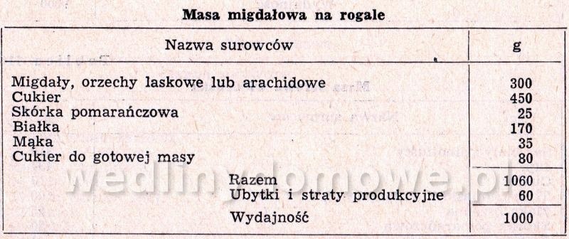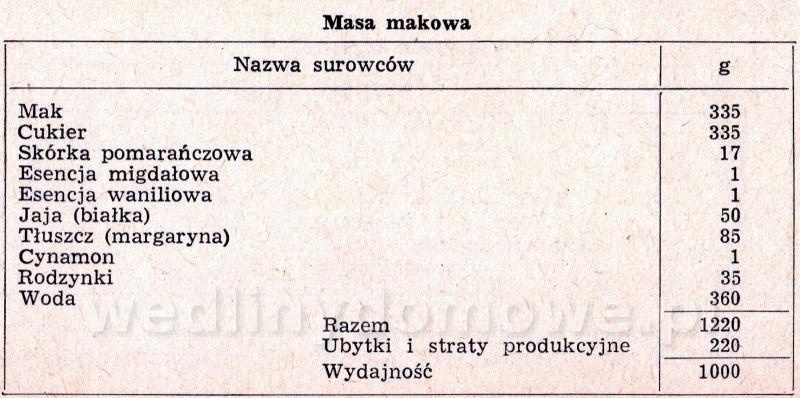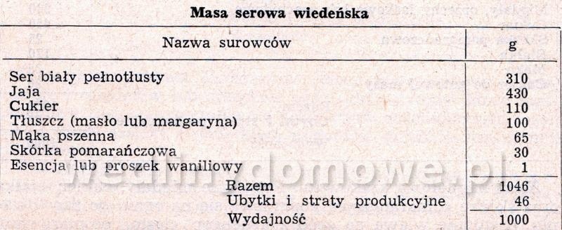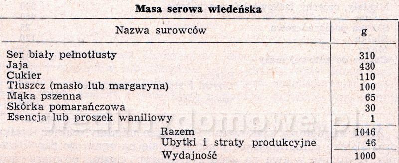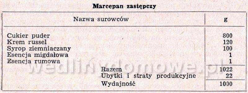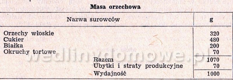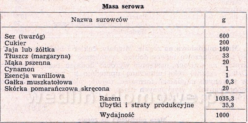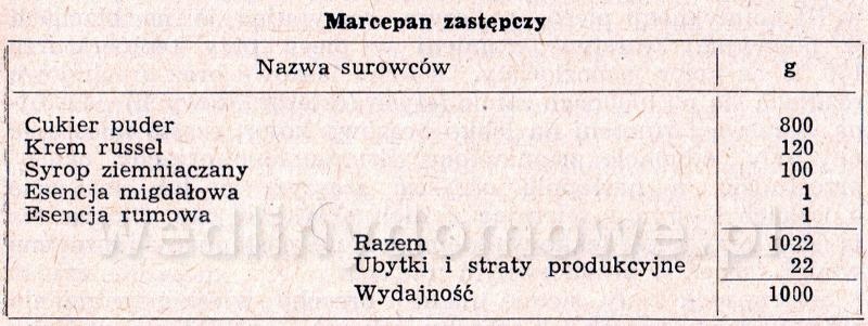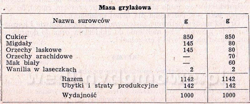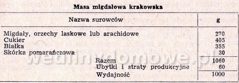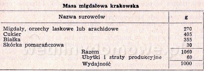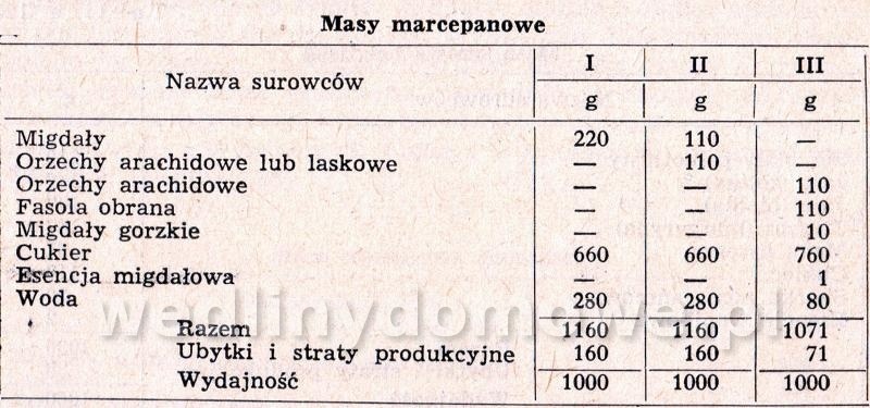 PÓŁPRODUKTY CUKIERNICZE Do półproduktów cukierniczych, oprócz ciast podstawowych omówionych w poprzednim rozdziale, zalicza się wszystkie produkty otrzymane z surowców cukierniczych nie stanowiące gotowych wyrobów, a używane do nadziewania, przekładania i wykańczania ciast i tortów. Do podstawowych półproduktów cukierniczych należą: masy, kremy, pomady, konserwy, glazury itp. MASY Masy używane w cukiernictwie do przekładania, napełniania i ozdabiania ciast i tortów wyrabiane są ze zmiażdżonych lub utartych surowców cukierniczych z cukrem i odpowiednimi smakami. Ich cechą charakterystyczną jest jednolita konsystencja. Do podstawowych surowców, z których sporządza się masy należą: mak, ser, orzechy, migdały i cukier. Masa makowa. Mak zagotowany, wypłukany w zimnej wodzie i oczyszczony z piasku (przez płukanie i zlewanie maku na gęste sito), dobrze odsączony z wody, następnie zmielony na walcach lub maszynce (w maszynce ręcznej należy mak przekręcić 3 razy) doprawia się dodając rozpuszczony tłuszcz, cukier, białka, migdały gorzkie lub esencję migdałową, wanilię w proszku (cukier waniliowy) lub esencję waniliową, cynamon, skórkę pomarańczową oraz rodzynki. Dla otrzymania dobrej masy nie należy dodawać jaj całych lub żółtek, gdyż wystarczają białka, które pozostają przy produkcji ciasta drożdżowego. Zamiast cukru można używać częściowo również syropu po owocach. Masa serowa. Do zgniecionego sera dodaje się cukier, jaja całe lub żółtka w zależności od jakości masy, jaką chcemy osiągnąć, skórkę pomarańczową, wanilię, gałkę lub kwiat muszkatołowy, tłuszcz (masło lub margarynę). Wszystkie te składniki należy dobrze wymieszać dodając na końcu mąkę pszenną. Masa serowa wiedeńska. Ser zgnieciony na walcach lub w maszynce należy rozrobić żółtkami, następnie dodać tłuszcz wolnej konsystencji, skórkę pomarańczową, esencję lub proszek waniliowy. Oddzielnie należy ubić białka z cukrem i wymieszać z utartą masą serową dodając odsianą mąkę. Masa orzechowa. Orzechy, cukier i białka należy zmiażdżyć na walcach, następnie dodać odsiane przez sito okruchy tortowe. Masy tej można używać do strucli oraz jako nadzienia do ciastek półfrancuskich, drożdżowych, rogali itp. Masa migdałowa na rogale. Migdały, cukier i białka oraz skórkę pomarańczową należy dobrze wymieszać i zmiażdżyć dwukrotnie na walcach, następnie wyrobić dodając mąkę i cukier. Dzielić ręcznie ręką umaczaną uprzednio w wodzie, obtaczać w siekanych migdałach formując rogale, układać na blachach smarowanych i wysypanych mąką i wypiekać w temperaturze 190—200°C. Masa migdałowa krakowska. Posiekane migdały, cukier, białka oraz skórkę pomarańczową podgrzewa się na ogniu do zagotowania, następnie wlewa na spód z kruchego ciasta, posmarowany marmoladą, a po zastygnięciu (6—12 godzin) kroi i układa na blachach w odstępach 3 cm. Wypiekać w temperaturze 180°C. Masa serowa belgijska. Skręcony na walcach ser należy rozrobić żółtkami i mlekiem, dodać skórkę pomarańczową i esencją waniliową, a następnie wymieszać lekko z białkami ubitymi z cukrem. W czasie łączenia masy serowej z białkami dodaje się przesianą mąkę, z którą należy całość dobrze i lekko wymieszać. Masa marcepanowa. Podstawowe masy marcepanowe sporządza się z migdałów lub orzechów oraz cukru i wody. Masy marcepanowe zastępcze wyrabia się z orzechów arachidowych, fasoli białej (duży Jasiek) z dodatkiem migdałów gorzkich lub esencji migdałowej. Jest również kilka sposobów sporządzania masy marcepanowej zastępczej bez dodatku migdałów, orzechów lub fasoli. Wytwarzanie takiego marcepanu polega na połączeniu kremu russel, syropu ziemniaczanego i esencji zapachowych lub ciasta parzonego jak na ptysie, bez rozrobienia jajami, z dodatkiem cukru pudru i esencji zapachowych. Masy marcepanowe mają zastosowanie przede wszystkim przy wyrobie drobnych marcepaników, owijaniu (obciąganiu) krajanek, ciastek korpusowych, dekorowaniu ciastek i tortów oraz rozrobione z kremem russel do przekładania tortów, herbatników, ciastek tortowych, korpusowych itp. Masy marcepanowe można sporządzać dwoma sposobami. Pierwszy sposób: do cukru ugotowanego do próby gałki (115 - 118°C) wsypuje się migdały, orzechy lub orzechy arachidowe uprzednio obrane z łuski. Podczas stygnięcia należy kilka razy masę przemieszać, a gdy całość ostygnie do temperatury 30° C i skrystalizuje się, przepuścić przez walce, pierwszy raz przez walce rozszerzone, drugi raz przez skręcone. Drugi sposób wyrobu masy marcepanowej na zimno polega na dwukrotnym przekręceniu na walcach mieszaniny migdałów, cukru i wody. Po skręceniu należy masę dobrze wyrobić i przykryć ściereczką, aby nie obsychała. Masa po skręceniu powinna być lekko sztywna, konsystencji zbliżonej do kruchego ciasta. Masę marcepanową z migdałów, orzechów arachidowych lub fasoli doprawia się spirytusem, rumem, esencją zapachową i barwnikami. Jako barwnika używa się kakao lub cukru palonego. Do marcepanu białego dodaje się esencję maraschino, do różowego — rum, do zielonego — esencję kwiatu pomarańczy, do czekoladowego — przeważnie kakao. Masy marcepanowe do przekładania tortów i ciastek sporządza się w ten sposób, że na 1 kg kremu russel dodaje się 0,40 kg masy marcepanowej i rozrabia stopniowo kremem, aby nie utworzyły się grudki, a następnie doprawia spirytusem i esencjami. Masa marcepanowa z kremu, syropu ziemniaczanego, cukru pudru i esencji zapachowych jest masą o konsystencji sztywnej, lekko ciągliwej, a jej barwa uzależniona od potrzeby. Krem, syrop ziemniaczany, esencję migdałową i rumową należy dobrze wymieszać, następnie wgnieść tyle odsianego cukru pudru, aby powstała masa o konsystencji sztywnej, lekko ciągliwej. Masę taką po oziębieniu do 