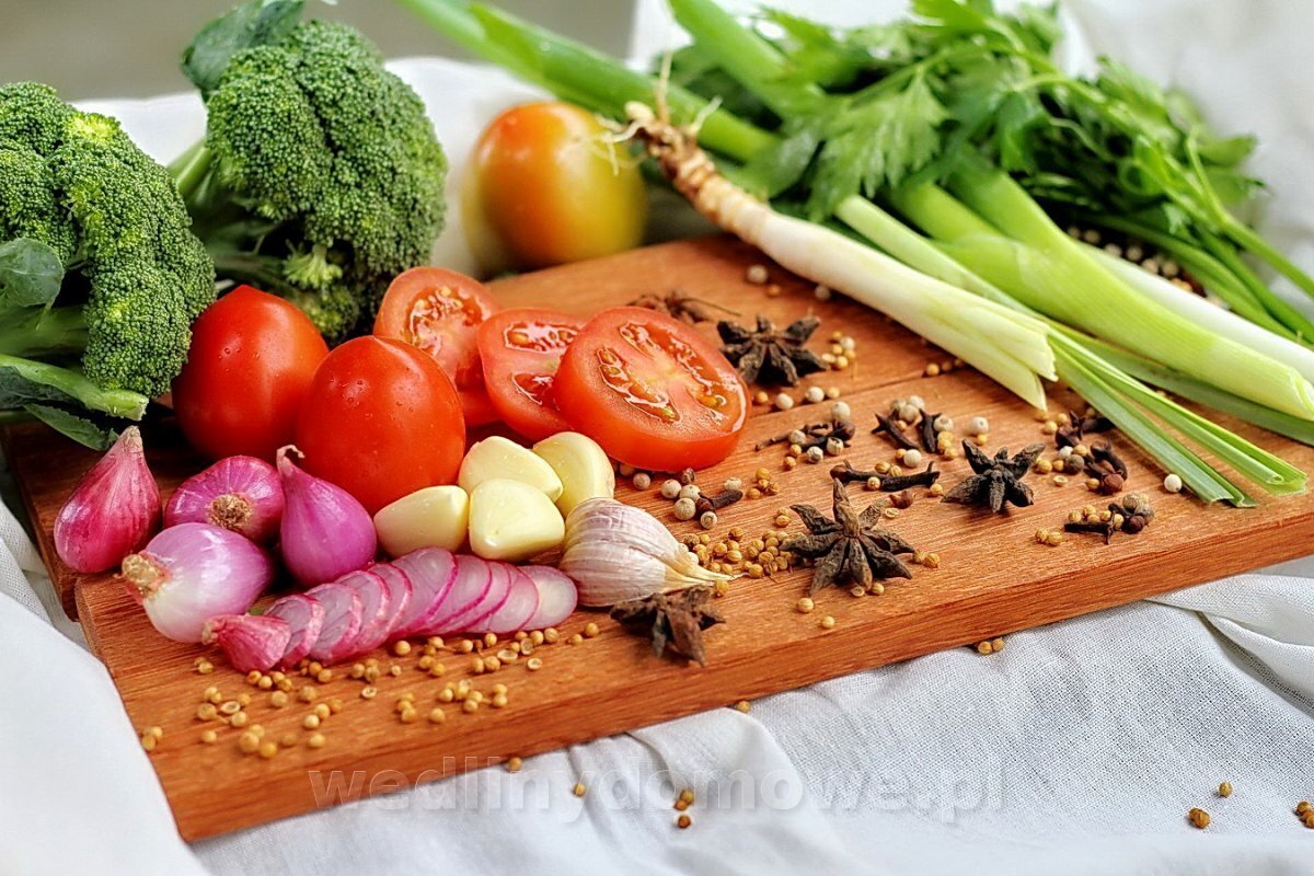 Przyprawy warzywne W kształtowaniu smakowitości przetworów mięsnych istotną rolę odgrywają przyprawy naturalne, które charakteryzują się specyficznym smakiem i aromatem. Dodatki te w praktyce są najczęściej stosowane jako wysuszone rośliny przyprawowe i ich użytkowe części. Oprócz tego, że urozmaicają przetwory i poprawiają ich smak, to również często wykazują pożądane technologicznie właściwości barwiące oraz antyutleniające i przeciwdrobnoustrojowe. Wszystkie stosowane rośliny przyprawowe można podzielić na przyprawy ziołowe, przyprawy korzenne i przyprawy warzywne. Tę ostatnią grupę reprezentują popularne warzywa, które charakteryzują się naturalnym bogactwem smaku i aromatu oraz odgrywają dużą przydatność w przyprawianiu wielu przetworów mięsnych i wyrobów podrobowych. Przyprawy, którymi są głównie części roślin przyprawowych (korzenie, bulwy, kwiatostany, kłącza, cebule, kora, owoce, nasiona, liście), ze względu na swoje właściwości są szeroko wykorzystywane w produkcji wyrobów mięsnych. Istotną grupę wśród nich stanowią przyprawy warzywne. Są nimi warzywa, będące roślinami jednorocznymi, dwuletnimi lub bylinami, które wykorzystuje się z dużym powodzeniem w procesie przyprawiania mięsa i jego przetworów. Znaczenie przypraw warzywnych w przetwórstwie mięsa należy rozpatrywać w kilku aspektach, przy czym głównym celem ich stosowania jest zawsze modyfikacja smaku, zapachu lub wyglądu wyrobu. Niekiedy ich efekt działania przejawia się poprawą strawności i działaniem prozdrowotnym oraz wpływem na trwałość przechowalniczą wyrobów. Jest to wynikiem wykazywania przez te rośliny właściwości przeciwdrobnoustrojowych i przeciwutleniających. Wykorzystywanie w procesie przyprawiania warzyw świeżych nastręcza jednak pewnych problemów natury obiektywnej. Sezonowa dostępność warzyw, a co za tym idzie przypraw warzywnych oraz aspekty ekonomiczne związane z dystrybucją i przechowywaniem stwarzają konieczność ich utrwalenia. Z tego względu zdecydowanie dużą część przypraw warzywnych używa się w stanie po wysuszeniu, w postaci proszków, granulatów, grysów lub płatków. Procesy przetwarzania świeżych warzyw na ich formy suszone muszą eliminować ryzyko występowania w nich niekorzystnych zmian, takich jak: destrukcja cząstek, sklejanie, przypiekanie czy ciemnienie. Jakość wysuszonych przypraw determinowana jest techniką prowadzenia procesu suszenia, który może przebiegać pod normalnym ciśnieniem lub w podciśnieniu, a także może być prowadzony metodą fluidyzacyjną, względnie stosowany jako odwodnienie podczerwienią, odwodnienie za pomocą mikrofal i odwodnienie liofilizacyjne. Niezależnie od stosowanej techniki suszenia przypraw w rożnym stopniu nabierają nowych cech smakowo-zapachowych i następuje w nich spadek w pewnym zakresie wartości odżywczej. Dotyczy to głównie strat witamin, w tym przede wszystkim witaminy C. Korzystnym zabiegiem pozwalającym na utrzymanie wysokiej wartości odżywczej przypraw suszonych jest ich wstępne blanszowanie przed suszeniem i stosowanie sulfitacji (np. zanurzanie w roztworze kwasu siarkawego lub siarczynu). Zabiegi te ograniczają straty witamin oraz hamują niekorzystne procesy utleniania i ciemnienia, co pozwala na korzystne utrzymanie jasnej barwy wysuszonych przypraw. Dobrym rozwiązaniem technologicznym prowadzącym do utrzymania wysokiej jakości i dużej wartości odżywczej suszonych przypraw warzywnych, a zarazem ich dobrej rehydratacji po wysuszeniu, jest stosowanie w procesie utrwalania suszenia sublimacyjnego (liofilizacji). Susze otrzymane tą metodą charakteryzują się bardzo niską zawartością wody (około 2-3%) i zbliżoną po rehydratacji zawartością soli mineralnych oraz witamin w stosunku do ilości tych składników występujących w świeżych, użytych do suszenia przyprawach. Dobre wyniki w zakresie utrwalania przypraw warzywnych gwarantuje także suszenie mikrofalowe, które zapewnia w dużym stopniu sterylność przypraw oraz eliminuje nadmierne kurczenie się cząstek w czasie ich obrabiania utrwalającego. Charakterystyka przypraw warzywnych Przyprawy warzywne należą do przypraw, które poza walorami smakowymi posiadają również wysoką wartość odżywczą. Decyduje o tym dodatkowo fakt, że w ich składzie przeważają pierwiastki zasadotwórcze, co stanowi duży atut żywieniowy. Niektóre z nich spełniają rolę dodatku przedłużającego okres przydatności wyrobów mięsnych do spożycia. Z powyższych względów warzywa, będące przyprawami warzywnymi stają się przydatne w procesie przyprawiania, a zarazem pożądane w żywieniu człowieka. Z grupy przypraw warzywnych stosowanych do przyprawiania wyrobów mięsnych należy wymienić przede wszystkim cebulę, czosnek, paprykę, por, pietruszkę korzeniową, seler korzeniowy i chrzan. Por, pietruszka i seler stanowią składniki kompozycji zestawu warzyw, nazywanego popularnie włoszczyzną. Mieszanki oparte na bazie wymienionych warzyw użytych w postaci suszonej o różnym stopniu modyfikacji składu (poprzez dodatek marchwi, pasternaku, natki pietruszki, lubczyku, cebuli) często uzupełniane są solą, cukrami, ryboflawiną, kurkumą i wzmacniaczami smaku, są powszechnie wykorzystywane w przyprawianiu wszelkich potraw i wyrobów mięsnych. Czosnek pospolity, inaczej czosnek zwyczajny (Allium sativum L), jest byliną należącą do rodziny amarylkowatych (dawniej rodziny liliowatych). Stanowi typową przyprawę warzywną, a zarazem popularne warzywo. Rosnący czosnek tworzy cebulę (tzw. główkę), składającą się z piętki, do której przyrośnięte są liczne, wąskie, trochę kanciaste i nieco skrzywione cebulki, zwane ząbkami. Cała główka jest pokryta listkami okrywowymi, tworzącymi łuskę. Czosnek rośnie jako roślina roczna lub wieloletnia (uprawiany w klimacie chłodniejszym). Występuje w różnych