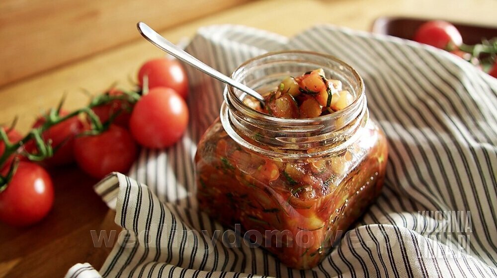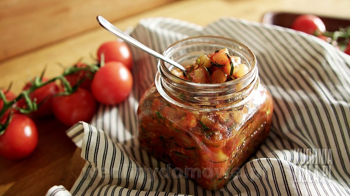 KONFITURA Z CUKINII I POMIDORÓW Składniki • cukinia - 1 szt. • pomidory - 4 szt. • zimna woda - 50 ml • goździki - 3 szt. • miód - 1 łyżka • skórka starta z 1 cytryny • pieprz - 2 szczypty • sól - 1 szczypta Przygotuj • obieraczkę do warzyw • tarkę o drobnych oczkach • słoiczek z zakrętką Sposób przygotowania Krok 1: kroimy i prażymy pomidory Pomidory pozbawiamy szypułek i kroimy na ćwiartki. Miąższ oddzielamy od skórki, a następnie drobno siekamy. Przekładamy na rozgrzaną patelnię. Dolewamy wodę. Dodajemy goździki i miód, a całość doprawiamy pieprzem. Prażymy, by odparować wodę. Krok 2: dodajemy cukinię Cukinię obieramy ze skórki. Skórkę odkładamy, a miąższ kroimy w drobną, równą kostkę i dodajemy do częściowo odparowanych pomidorów. Krok 3: smażymy konfiturę Dodajemy skórkę z cytryny i zmniejszamy ogień. Doprawiamy solą. Dolewamy wodę i smażymy warzywa na wolnym ogniu, aż woda całkowicie odparuje, a konfitura uzyska odpowiednią konsystencję. Krok 4: przekładamy konfiturę do słoiczka Patelnię zdejmujemy z ognia. Do konfitury dodajemy drobno posiekaną skórkę z cukinii. Zagotowujemy na mocnym ogniu. Gorącą konfiturę przekładamy do słoiczka. Mocno zakręcamy i odstawiamy do wystygnięcia do góry dnem.