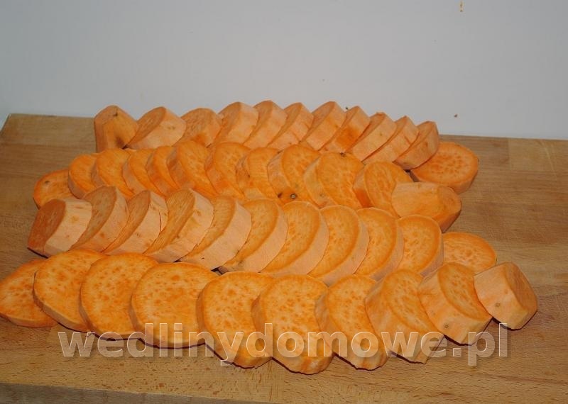 Dziś miałem okazję po raz pierwszy w życiu zasmakować słodkiego ziemniaka czyli Batatów http://slodkokwasny.com/wp-content/uploads/2011/05/batat-slodki-ziemniak.jpg (obraz z internetu) Ponieważ chciałem w pierwszej kolejności poznać smak owej bulwy, została ona pokrojona w plastry i ugotowana w jak najmniejszej ilości lekko osolonej wody... po zapoznaniu się ze smakiem, reszta powędrowała na blachę do piekarnika, osnuta strużką oliwy z oliwek i oprószona ziołami prowansalskimi..... Dla towarzystwa na talerzach zawitała karkówka smażona na patelni "grillowej", w otoczce z sosu wykonanego z tłuszczu po smażeniu karkówki rozrobionego wodą z gotowania batatów i zaciągniętym "na szybko" mąką Jako uzupełnienie zaserwowano do wyboru ogórki małosolne lub kiszone kalafiory polane oliwą z oliwek i posypane siekanym koperkiem (z przepisu Anuś) (Fotki brak )
