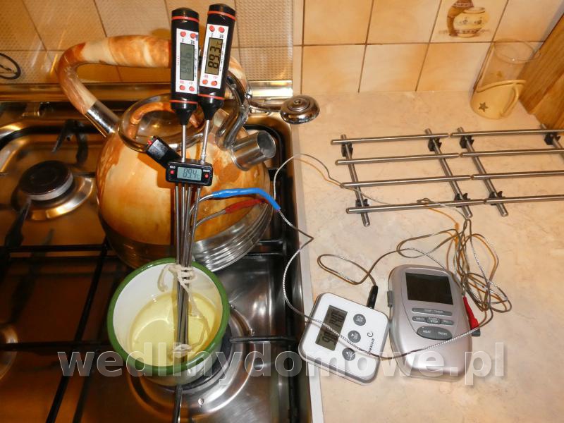 13. Co jakiś czas sprawdzam wskazania moich termometrów. na ostatnim kursie jeden fiksował. Po sprawdzeniu okazało się że bateria w pewnych momentach nie łączyła. Sprawdziłem wszystkie swoje termometry w temperaturach 60-140 st C. Różnica wskazań pomiędzy nimi to +- 0,5 - 0,8 st C. Jak to zrobić zdjęcie pokazuje . Użyjemy oleju jadalnego , podgrzewamy do temperatury ok 140 st C i gasimy gaz. Następnie wkładamy termometry i odczekamy 1- 2 minuty aż termometry osiągną temperaturę oleju - . Termometry różnie reagują i szybkość osiągania wskazań jest różna .Gdy wskazania temperatury już nie wzrastają zaczynamy sprawdzać i porównywać temperatury. W danych technicznych termometrów tolerancja wskazań mieści się przeważnie 1-2 st C zależnie od temperatury mierzonego produktu.