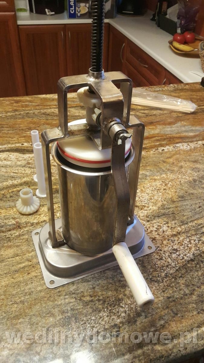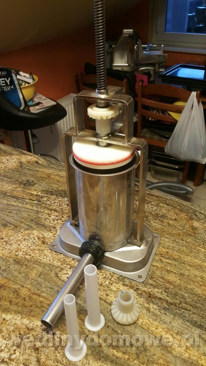I tak idąc za ciosem sprzętów wszelakich których mi w ostatnim czasie całkiem sporo przybyło... kolega zrobił mi dla znajomych bo napierali strasznie kolejną partię prasek do szynek boczków czy innych mielonek Fajne i poręczne na 1,3 kg wsadu. Plus dodatkowo napęd elektryczny do nadziewarki dla kolegi Arka...