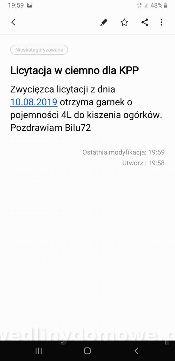 Witam ponownie wszystkich Dzisiaj licytacja w ciemno. Do wylicytowania jest garnek o poj. ??? Licytacja trwa do 15.08.2019r do godz 24.00 czasu polskiego. Wysyłka jak w poprzednich licytacjach na mój koszt na terenie RP.Licytujemy w walucie Pln Wygrywajacy licytację jest zobowiazany do przelania licytowanej przez siebie kwoty na konto /topic/10446-konto-kpp-konto-pomocy-stronie/ screen z notatnika odnośnie pojemności garnka oraz jego przeznaczenia zostanie podany po zakończeniu licytacji. Zaczynamy Bilu72 9.99 zł