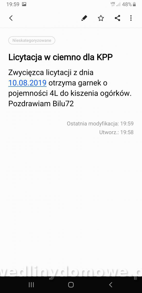 15 min do końca licytacji [Dodano: 16 sie 2019 - 00:11] Zwycięzca licytacji w ciemno zostaje @Papcio Licytowanym garnkiem był 4 l. garnek do ogórków oraz garnek beczułka 7 l. wraz z dwoma osłonkami w ksztalcie prosiaczka.