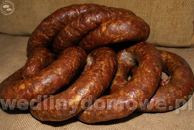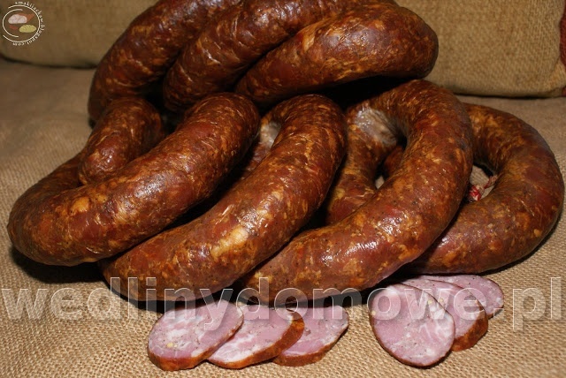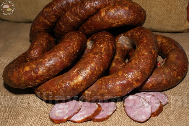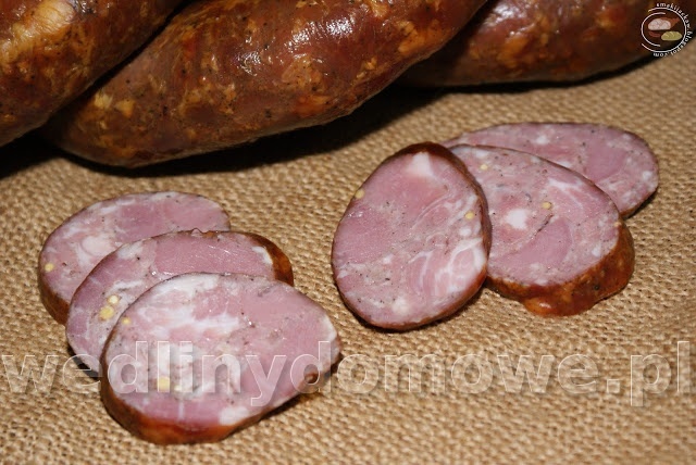 SUROWIEC I ROZDRABNIANIE maszynka nr 8-3,5 kg szynka I kl. (pokrojona w kostkę 2 cm)-2,5 kg boczek chudy (sitko 16 mm)-1 kg podgardle z przyrostem mięsnym (sitko 8 mm)-1,25 kg ścinki z szynki kl.II (sitko 8 mm)-1,25 kg ścinki z łopatki kl.II (sitko 8 mm)-0,5 kg słonina (pokrojona w kostkę max 1 cm) PRZYPRAWY I MATERIAŁY POMOCNICZE-peklo sól 17-18 g/kg-sól morska 20 g/kg do słoniny-pieprz czarny 1 g/kg-pieprz kolorowy 1 g/kg rozdrobniony w moździerzu-gorczyca ziarno 4 g/kg-ziele angielskie 0,5 g/kg-gałka muszkatołowa 0,5 g/kg-czosnek świeży 4 g/kg-suszony chili strąk 1-2 g/kg gnieciony w ręku-woda 250 ml dodana podczas mieszania mięsa razem z przyprawami-woda 100 ml dodana przed napełnieniem w jelita-jelita wp rozmiar 28-32 WYKONANIEKupione mięso tniemy w mniejsze kawałki aby można było je dobrze zapeklować. Peklujemy w osobnych pojemnikach każdy rodzaj mięska. Czas peklowania 48 godz. w temp.4-6 st. Po tym czasie mielimy boczek,podgardle oraz ścinki resztę mamy już pocięte w kostkę. Następnie mięso mieszamy każde osobno do kleistości. Później łączymy całe mięso dodajemy stopniowo przyprawy i 250 ml wody i mieszamy aby rodzaje mięs i przyprawy dobrze się wymieszały. Odstawiamy do lodówki na 10-max 24 godzin w celu wyrównania się smaków. Po tym czasie dolewamy jeszcze 100 ml.wody dokładnie mieszamy i napełniamy jelita dość ściśle. OSADZANIE W pokojowej temp.pod wiatrakiem 2 godz. OSUSZANIE Osuszany w wędzarni przy dużym ruchu powietrza do momentu aż powierzchnia kiełbas będzie sucha i ciepła. Temp.40 WĘDZENIE 3 godz.w temp. 55-60 st. Po wędzeniu podpiekamy lub parzymy PODPIEKANIE W temp. 80-90 st. do uzyskania 70 st. w środku kiełbaski PARZENIE Woda 75 -80 st.do uzyskania 68-70 w środku kiełbaski. SMACZNEGO.