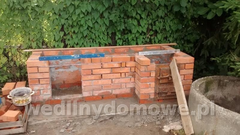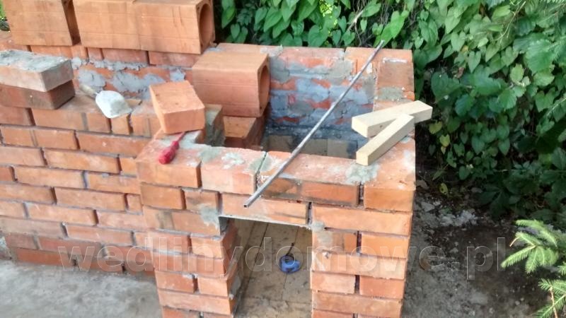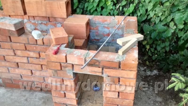 6. Witam, jestem początkujący na forum jak i laikiem w budowie wędzarni więc z góry proszę bez mocnych hejtów Większość już wymurowana, uktwiłem jednak w punkcie kanału dymnego. Planuję użyć (akurat miałem na zbyciu) przewody ceramiczne kominowe fi15. Długość kanału- około 120cm. Wielkość paleniska - głębokość około 65cm, szerokość 55cm. Przewody kominowe chcę zamontować do bocznej ściany oraz do deki któa pójdzie na górę- tak jak pierwszy przewód od paleniska na zdjęciu. Nie chcę na niczym wspierać dalszych przewodów od spodu - chciałbym zostawić tam miejsce na drzewo (będą drzwiczki pod komorą). Moje pytania: Czy niezbędna jest jakaś forma izolacji przewodów jeśli nie planuję zimowych wędzeń? Czy mogę wyprowadzic kanał dymny do komory w jego tylnej części a nie na środku? Rozumiem że aby zapewnić prawidłowy przepływ dymu przez komorę będę musiał wtedy komin umieścić w przedniej części sufitu? Aha, komorą będzie z drzewa. http://i62.tinypic.com/24gn39y.jpg