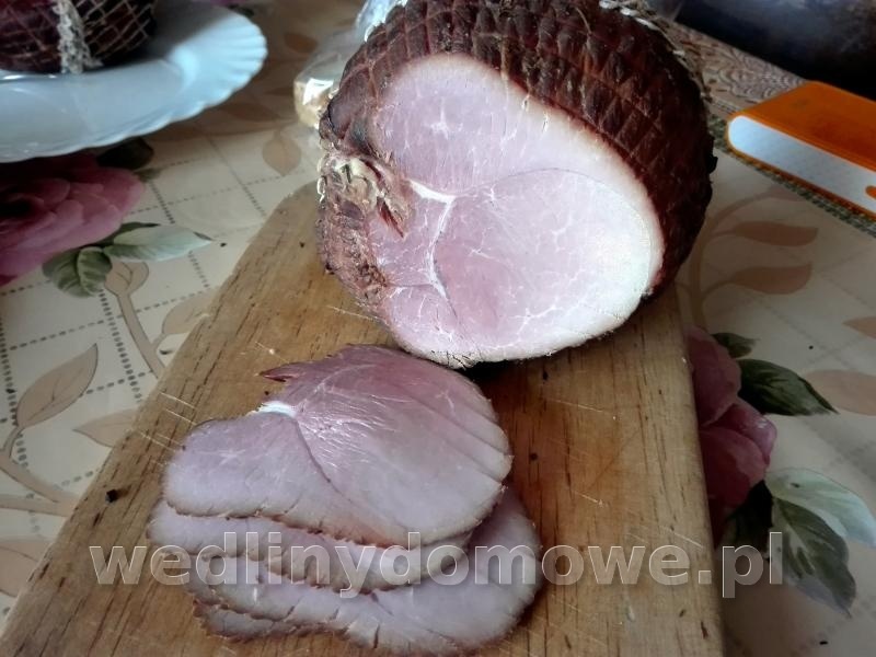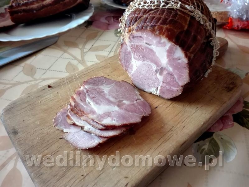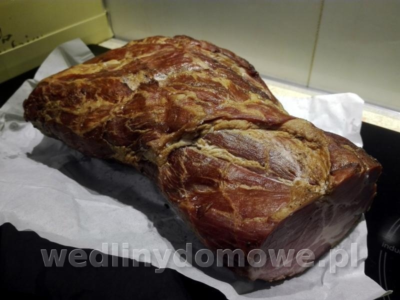 7. Dzień Dobry, Cześć, Witajcie Pora się przywitać, nie wiem czy w dobrym miejscu, jakby co to liczę na wyrozumiałość moderatora:) Chciałem Wam przedstawić moje początki z tą zabawą... Kilka tygodni temu skonstruowałem swoją pierwszą wędzarnię: palenisko z płyt chodnikowych, rura kominkowa 1,2m, skrzynia z desek świerkowych 60x60x140...no jak nie jak tak...pewnie, że z ciastoramy:) (kiedyś wkleję zdjęcie tej konstrukcji, bo jest piękna Po postawieniu pierwsze przepalenie, a w lodówce już w beczce się peklują pierwsze szynki, karkówki i boczusie:). Peklowanie na mokro, 14 dni, stężenie pekli lekko mniejsze od wytycznych z tabeli, woda przegotowana, ostudzona, +przyprawy i czosnek. Sprawdzałem w lodówce co 3-4 dni, wszystko było ok, zapach piękny. Po 14 dniach wyjąłem, opłukałem i karkówkę i szynki zasiatkowałem. Wisiało to sobie przez całą noc u teścia w komórce. Rano rozpalanko, suchym drewnem, dobrą godzinę, aż się deski z ciastoramy uśmiechały:) po wygrzaniu wędzarki, następna godzina na dosuszenie wędlin, przy otwartym deklu. Temperatura przy osuszaniu około 40 stopni, podczas całego wędzenia 40-60. Dekiel zamknięty w 80%. Podczas wędzenia dorzucałem trochę świeższego drewna, bo suchego mam jeszcze mało. Olcha i wiśnia. Towar w wędzarni był jakieś 5-6 godzin, od razu po wyjęciu (wydawał się jeszcze troszkę za blady, ale wiem, że podczas parzenia ciemnieje) do gara z gorącą wodą. Od momentu osiągnięcia 80 stopni parzyło się 1,5 godziny w tej temperaturze. Mięsko miałem w równych kawałkach, każdy po 1,2 kg. 2 szynki, 2 boczusie, 2 karkówki- na pierwszy raz, taka mała porcyjka, żeby psa nie przekarmić jak się nie uda:) Po sparzeniu 5 minutowe hartowanie w zimnej wodzie, i powrót do komórki na wystudzenie i wysuszenie, na dobę. Efekty: kolorystycznie-bardzo ładne zarówno w środku jak i z wierzchu, smakowo-rewelacja, nie za słone, zresztą co ja tu będę pisać...wiecie jak to smakuje:), pod względem wilgotności-optymalne, nie lało się z tego zbyt dużo ale nie było też suche, trwałość- przechowywane w lodówce zawinięte w papier śniadaniowy przez dwa tygodnie nie dało oznak starzenia czy psucia. Drugie wędzenie to były pstrągi i łosoś. Pstrągi umyte i natarte grubą solą przy kręgosłupie. Łosoś natarty solą i posmarowany lekko syropem klonowym. Po trzech godzinach leżakowania, po godzinie suszenia w piekarniku (drzwi otwarte, bez temp, chodził tylko wiatrak od termoobiegu) do wędzarni. W tym czasie jak leżakowało, ja rozpaliłem i wygrzałem wędzarnię. Wędziło się 5 godzin, temp wędzenia 30 stopni (trochę było z tym zabawy). Efekty: łosoś mega dobry, najważniejsze dla mnie, to to, że za pierwszym razem udało mi się osiągnąć łososia nie upieczonego a uwędzonego, w środku był soczysty, miał barwę łososiową. pstrągi: chyba były troszkę za małe, bo boczki wyszły lekko za suche, brakowało mi tłuszczyku, ale w smaku rewelka jak z Pewexu Poniżej dorzucam kilka zdjęć(mam nadzieję, że się uda), oceńcie sami jak to wygląda. Jak ktoś ma jakieś rady, chętnie wysłucham. Dziś wstawiłem trochę większą porcję do peklowania, idą święta. Pozdrawiam wszystkich Zadymiarzy