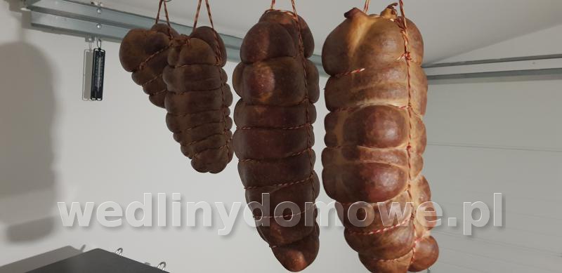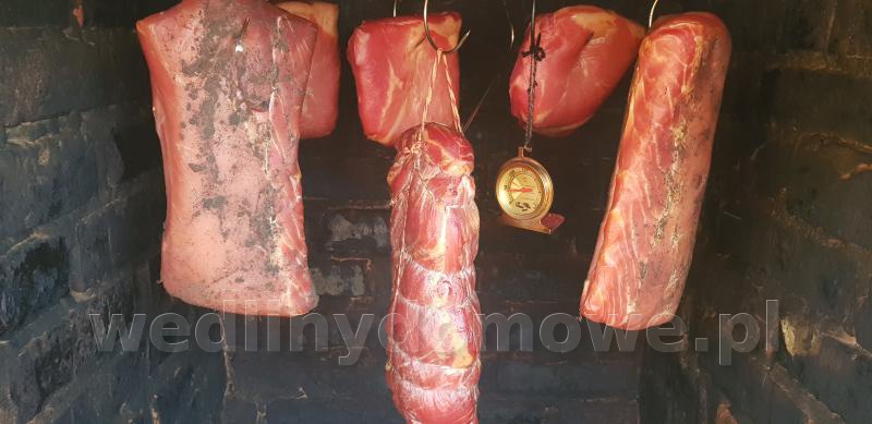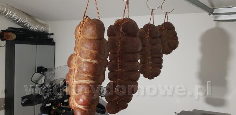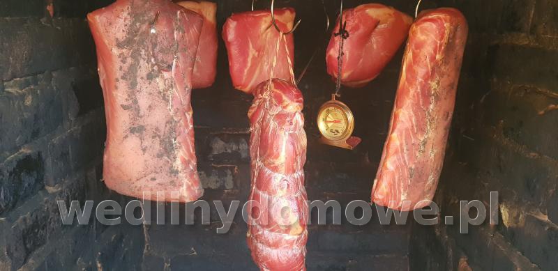 Takie dziś popełniłem wędzonki. Na noc wiszą w garażu, baleron sparzony, dzień uważam za uczciwie przepracowany :-) Aha, to czarne to nie sadza tylko pieprz, którego aromat uwielbiam. Natarłem nim mięso przed wędzeniem bo peklowało się bez przypraw tym razem, tylko peklosól.