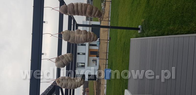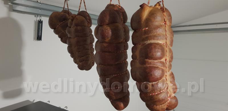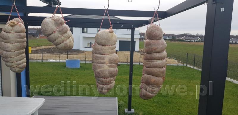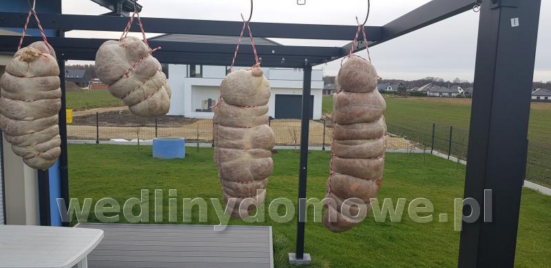 Kiełbasa szynkowa grabarza w kątnicy wieprzowej (wyrób eksperymentalny) Ponieważ kupiłem w listopadzie za dużo kątnic pod wędliny dojrzewające postanowiłem coś z nimi zrobić żeby mi to nie leżało miesiącami w lodówce. Wybór padł na grubachną kiełbasę. 3 kg szynki 2,5 kg łopatki 1 kg podgardla (jakieś takie chudawe było) 400 gramów surowego dorsza Peklosól Pieprz czarny 3g/kg Jałowiec owoce półgarstek Majeranek 30 gramów Gorczyca 1 paczuszka Czosnek ile kto lubi Woda około 600 ml Kątnica wieprzowa Na początku 200 gramów dorsza kroimy w kosteczkę i dajemy kotom żeby się nażarły i poszły spać. Podgardle mielimy na 8mm. To co ładne z szynki i łopatki kroimy w kostkę taką około 3 cm. To co brzydkie mielimy na 8mm. Mięso w kostkach zapeklowane w vacuum przez 36 godzin 20 gr/kg (w osobnych workach). Teraz dajemy kotom pozostałe 200g dorsza i znowu sobie poszły. Mięso wyrabiamy z przyprawami i z wodą aż będzie odpowiednio "kiełbasiane". Smakujemy czy nie za mało soli. Ja trochę dosoliłem zwykłą solą kuchenną. Napełniamy kątnice tak żeby były pełne (uwaga bo łatwo porwać). Sznurujemy kątnice i wieszamy w chłodnym miejscu (najlepiej w przeciągu) niech sobie ocieka przez 12-24 godziny. Osuszamy w wędzarni i wędzimy. Nie wiem jak długo, na razie wiszą i się wędzą. Zobaczymy co z tego wyjdzie Przed wędzeniem wyglądały tak: