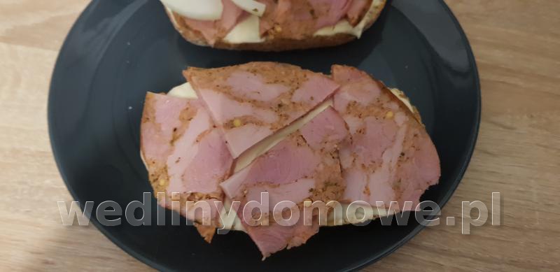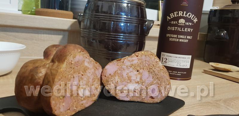 Powiem tak. Piękne to nie jest. Nie wygląda tak jak wyroby że zdjęć Ani. Osłonka po wystygnięciu się tu zmarszczyła, tam zmatowiała, nie jest to takie ładne. W przekroju wygląda fajnie choć śmiesznie, takiego efektu się nie spodziewałem. Niepodobne do niczego co znam ;-) Ten niespodziewany efekt dała papryka która zabarwiła tę zmieloną część wsadu podczas gdy mięso w kostkach zachowało barwę mięsa. W efekcie mamy coś w rodzaju marmurku :-) Ale w smaku po prostu rewelacja. Nie sądziłem że takie dobre to wyjdzie.