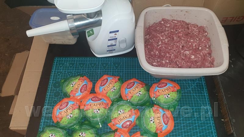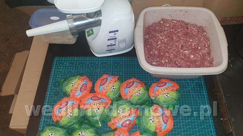 Apetyt rośnie w miarę wędzenia Ponieważ boje z DG zasadniczo zakończone, serki i polędwiczki pomaleńku mi się przejadać zaczęły, zakupiony Zelmotor kurzem zarastać nie może. Udałem się zatem wczoraj na polowanie w sokołowskie knieje Przytargałem 2 kg łopatki bez kości, 1,20 ładnego boczku, 0,6 kg golonki i 1,3 kg indyczego udźca. Wszystko z wyjątkiem golonki zmieliłem na sitku z oczkami 8 mm. Golonkę potraktowałem sitkiem o oczkach 2,7mm, dorzuciłem garstkę indyczego udźca wcześniej mielonego na ósemce. W trakcie mielenia dodawałem ząbki czosnku - po dwa na kilogram, bo lubię kiełbasę mocno czosnkową. Skórę z boczku i golonki oraz gnaty z golonki i udźca wygotowałem w małej ilości wody z przyprawami (liść laurowy, parę ziaren ziela angielskiego i pieprzu czarnego). Odcedziłem z tego szklankę wywaru, dodałem do niego peklosól pół na pół z solą 16 g/kg i przyprawy - garść majeranku, dwie łyżeczki pieprzu, pół opakowania owoców jałowca (ok 8,5 g) trzy łyżeczki nasion gorczycy i łyżeczkę cukru. Po wymieszaniu wlewałem to porcjami do drobno zmielonej frakcji w miarę wyrabiania. Stopniowo też dodawałem mięso zmielone na ósemce. Po ok dziesięciu minutach masa była już dostatecznie kleista, ubiłem ją, przykryłem talerzykiem i odstawiłem w chłodne miejsce na 24 godziny. Teraz pora na nadziewanie jelit - kaliber 28-30 wymoczone, wypłukane i przewinięte na prawą stronę, żeby nie straszyły wystającymi kosmkami. Pamiętam jak licho się nadziewało maszynką 22, ósemką Zelmotora będzie jeszcze marniej, ale już zamówiona nadziewarka 2,5 kg powinna dojechać przed następną kiełbasą