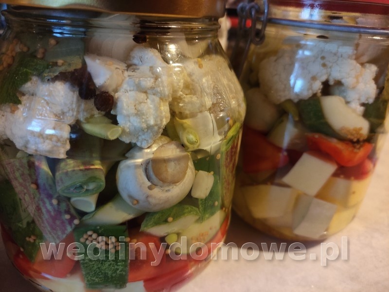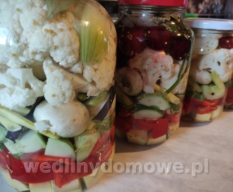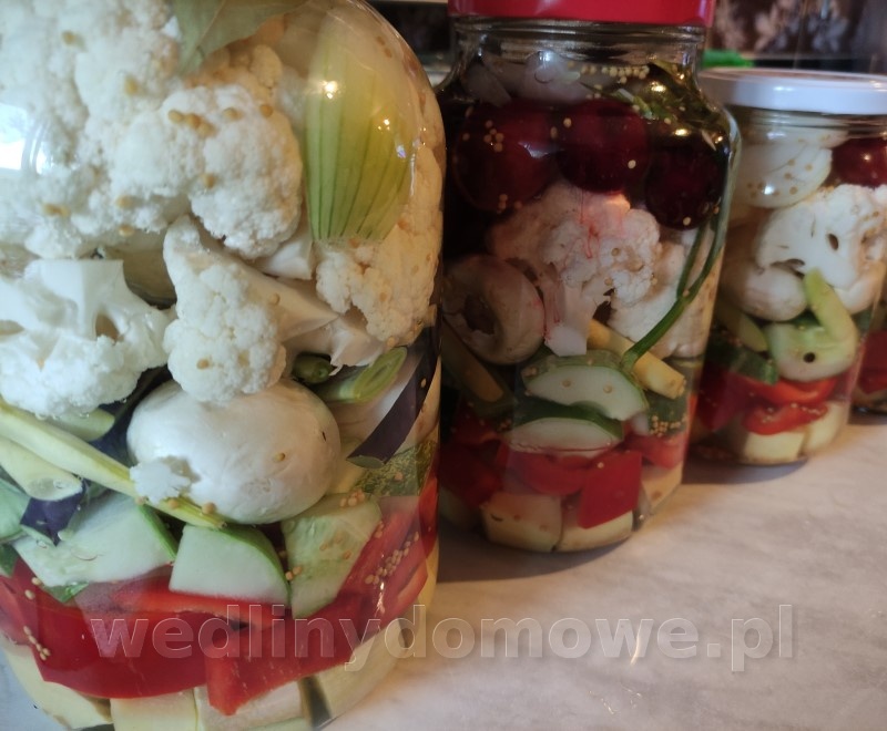 1. Pikle - każdy zna, każdy lubi, każdy robi inaczej. Ja robię mieszankę, z tego co akurat mam. Papryka słodka czerwona Cukinia Młoda dynia piżmowa Ogórki duże tzw. sałatkowe Kalafior Fasolka szparagowa i młoda fasola tyczna Pieczarki Młoda cebulka Warzywa kroimy według uznania, ja układam warstwami. Do każdego słoika wkładam czosnek, liście lubczyka i selera, kwiatostan kopru lub fenkułu. Do kilku słoików włożyłem parę sztuk śliwek, śliwka polska odmiana ogrodowa, nieduża bardzo słodka. Zalewa: 2,5l wody 0,5 litra octu 10% 400 g cukru 20g soli Liść laurowy, gorczyca, ziele angielskie, pieprze czarny ziarno. Słoiki zalewam gorącą zalewą, pasteryzuję 20min.