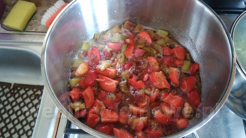 Rabarbar kroimy na kawałki ok. 2 cm. długości i zasypujemy na 1 godz. cukrem. Po tym czasie wstawiamy na palnik i dodajemy truskawki.