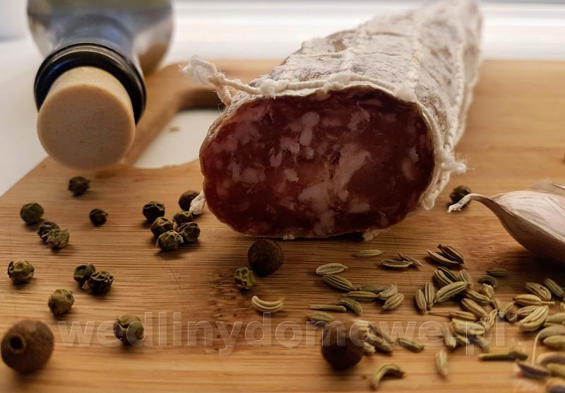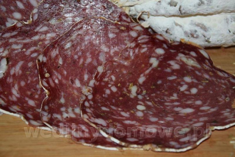 qzym Opublikowano 22 Listopada 2019 Autor Zgłoś Udostępnij #39 Opublikowano 22 Listopada 2019 Mięso było lekko podmrozone (jakieś -1) słonina zamrozona, mielone razem z przyprawami, wyrabiane metodą"boksowania" jakieś 3-4 minuty.Potem do schłodzenia a nastepnie nadziewane.Grudki były wyczuwalne. Wątki o sposobie wyrobu przeczytalem tyle razy,że niektore znam na pamięć... O osłonkach wiem ,ze zły typ ale akurat innych nie mialem.... nabijałem dość ściśle, w nabijarce bylo ubite.Potem batoniki nakłute i fermentowane( już z pH metrem) no i do dojrzewalni... Dzisiaj wydobyte.... Myślę, że to suma wszystkich czynnikow, - wyrabianie, pakowanie do nabijarki, nabijanie w oslonki, same oslonki- jak sie w kazdym etapie popełni nawet mały bładto później się to wszystko nakłada i efekt końcowy jw. Cytuj Odnośnik do komentarza https://wedlinydomowe.pl/forum/topic/16555-z-domowej-dojrzewalni-i-nie-tylko/page/2/#findComment-646770 Udostępnij na innych stronach Więcej opcji udostępniania...