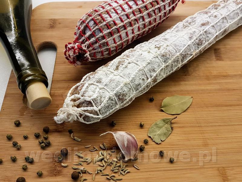 qzym Opublikowano 22 Listopada 2019 Autor Zgłoś Udostępnij #37 Opublikowano 22 Listopada 2019 Pierwsze ( testowe) salami wyjęte z dojrzewalni.. .. Salami typu Cascina (cieńsze) i Finocchiona (grubsze), utrata wagi odpowiednio 41 i 42 %. W smaku suuuuper, zgodnie z oczekiwaniami, wykonanie jak na 1 raz - powiedzmy "do przyjęcia". Finocchiona w osłonce niby bialkowej ale nie obkurczała się razem z batonem, wewnatrz batonu widoczne kieszenie powietrzne i rozwarstwienia.Cascina w oslonce naturalnej wp. - o niebo lepiej. Tak czy siak trzeba będzie jeszcze popracowac nad "domową technologią"........ Gdzie popelniłem błąd?? - za słabo wyrobione?? zbyt luźne nadzianie? Cytuj Odnośnik do komentarza https://wedlinydomowe.pl/forum/topic/16555-z-domowej-dojrzewalni-i-nie-tylko/page/2/#findComment-646743 Udostępnij na innych stronach Więcej opcji udostępniania...