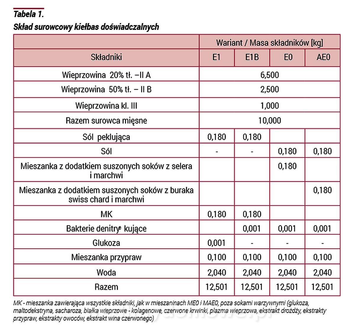 Maxell Opublikowano 8 Lutego 2024 Zgłoś Udostępnij #1 Opublikowano 8 Lutego 2024 Ocena możliwości tworzenia barwy peklowniczej z wykorzystaniem suszy owocowo-warzywnych Poza ograniczonym zastosowaniem konserwantów, najnowsze trendy rynkowe wskazują na potrzebę ograniczenia udziału dodatków funkcjonalnych w produkcji wyrobów mięsnych. Sieci dyskontów, dyktujące warunki na rynku wędlin, są zainteresowane wyrobami z tzw. clean label, czyli bez definiowania na etykiecie dodatków z E, szczególnie alergennych. Już w starożytności sól stanowiła jeden z pierwszych i zarazem najważniejszy produkt wymienny w handlu. Hebrajczycy używali soli przede wszystkim podczas ceremonii i uroczystości religijnych, ale również doceniali jej wartości lecznicze. Rzymianie używali soli do konserwacji ryb, oliwek, sera i mięsa. Sól jako produkt luksusowy była również środkiem płatniczym, w soli wypłacano np. żołd żołnierzom. W krajach Maghrebu sól była towarem płatniczym. W Etiopii oraz w Tybecie wytwarzano z soli krążki, których używano jako monet. W Biblii sól zajmuje ważne miejsce, była niemą „towarzyszką" błądzenia Jezusa Chrystusa i Jana Chrzciciela na pustyni. W średniowieczu powstawały tzw. drogi solne, wyznaczające kierunki handlu solą, zarówno we Francji, jak i w Skandynawii oraz innych krajach europejskich. Ponieważ sól była elementem niezbędnym i bardzo cennym, rządy wielu państw wprowadziły podatek od tego kruszcu. Solenie, a później peklowanie mięsa służyło pierwotnie przede wszystkim do przedłużenia trwałości i obok wędzenia oraz suszenia miało duże znaczenie jako metoda konserwowania mięsa, ponieważ chłodzenie i zamrażanie było możliwe tylko w miesiącach zimowych. Rozwój chłodnictwa sprawił, że zarówno barwa mięsa peklowanego, jak i jego bukiet smakowo-zapachowy, a także walory użytkowe zyskały na znaczeniu, spychając na dalszy plan efekt utrwalający. Pierwotnie peklowanie wykonywano wyłącznie przy użyciu azotanów (V) (tzw. saletra). Dopiero pod koniec XIX stulecia odkryto, że dla uzyskania efektu peklowania, z azotanów (V) musi powstać najpierw azotan (III). Według stanu dotychczasowej wiedzy, to przekształcenie (redukcja) jest wynikiem działania wybranych mikroorganizmów. Dostępne dane literaturowe wskazują, że barwa peklownicza nie powstaje zgodnie z jednym mechanizmem, np. enzymatycznym, lecz biorą w nim udział różne nieenzymatyczne systemy redukcyjne mięśni (rys. 3). W miarę obniżania się pH i wzrostu stopnia zdysocjowania kwasu azotawego zwiększa się efekt działania azotanu (III). Czerwień peklownicza powstająca w wyniku połączenia tlenek azotu - mioglobina, jest stosunkowo oporna na oddziaływanie światła i tlenu, przede wszystkim jednak na oddziaływanie ciepła. Oznacza to, że peklowany przetwór mięsny, po obróbce cieplnej, ma barwę różowoczerwoną, podczas gdy bez peklowania, mimo dodatku soli kuchennej, ma barwę szarobiałą lub szarobrązową. Minimalna ilość azotanu (III) niezbędna do wytworzenia odpowiedniej barwy mięsa peklowanego i jego przetworów wynosi około 30-50 ppm (mg/kg). Wiele roślin; przypraw i warzyw zawiera na tyle dużo związków azotowych, że zastosowane w celu nadania smaku mogą powodować efekt zmiany lub tworzenia barwy. Bardzo charakterystyczną jest tzw. barwa peklownicza powstała często przez niezamierzoną reakcję azotanów (V) zawartych w roślinach. Efektem jest czerwona kaszanka lub biała kiełbasa o barwie różowej. W tych przypadkach „odpowiedzialny" za tworzenie czerwonej barwy peklowniczej jest majeranek. Absolutnie nie możemy określać tego zjawiska mianem peklowania. Nie można zapomnieć o soli morskiej, często bogatej w pozostałości roślinne zawierające związki azotowe - azotany (V). Ryby i mięso konserwowane taką solą zawsze zyskiwały na atrakcyjności, dzięki tworzącej się w czasie przechowywania różowej barwie - barwie peklowniczej. Obecnie standaryzuje się dodatki smakowe i żywność barwiącą na zawartość azotanów (V). Klasycznym przykładem są suszone soki warzywne z selera i buraka (odmiana swiss chard), które dla potrzeb przemysłu zostały wystandaryzowane na zawartość azotanów (V), na poziomie 17000 mg/kg. Standaryzacji dokonano na podstawie analiz laboratoryjnych. W warunkach przemysłowych powtarzalny poziom azotanów (V) otrzymuje się m.in. dzięki mieszaniu partii surowców (zwanych szarżami, które to określenie bardzo nie przypadło do gustu niektórym naukowcom). Suszony sok z marchwi użyty w identycznej ilości w obydwu mieszaninach MEO i MAEO zawierał 500 mg azotanów (V)/kg. Te soki posłużyły jako modelowe susze warzywne w celu przeprowadzenia badań nad tworzeniem barwy peklowniczej. Dla przyspieszenia procesu redukcji stosuje się między innymi kultury bakterii denitryfikujących czasami zwane również (moim zdaniem odrobinę kontrowersyjnie) bakteriami kwasu mlekowego. W przeprowadzonych badaniach przygotowano kiełbasy doświadczalne w czterech wariantach (skład surowcowy - tabela 1). Do redukcji azotanów (V) zawartych w suszonych sokach warzywnych w wariantach kiełbas E0 i AEO zastosowano dodatek bakterii denitryfikujących zawierających kultury bakterii Staphylococcus carnosus i vitulinus. Ich dodatek zastosowano również w produkcie zawierającym w recepturze sól peklującą (E1 B). W celu zachowania identycznych proporcji składników w kiełbasie oznaczonej E1 zastosowano dodatek glukozy (zamiast szczepionki), która stanowi główny nośnik szczepów bakteryjnych w zastosowanym preparacie. We wszystkich wariantach zastosowano identyczny dodatek mieszanki przyprawowej. Dodatek wody w ilości 2,040 kg uzupełniał skład recepturowy wytwarzanych kiełbas wieprzowych. Elementem oceny sensorycznej kiełbas była ocena barwy przekroju. Wyniki przedstawiono na rys. 2. Na ich podstawie stwierdzono, po dwóch dobach od wyprodukowania
