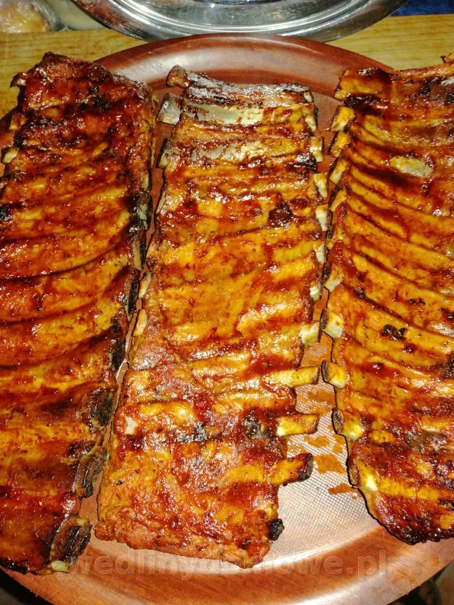 Z żeberek ściągamy błonę opłucną, po opłukaniu osuszeniu nacieramy ulubionymi przyprawami, mogą być oregano, bazylia, majeranek, pieprz, papryka słodka i ostra, czosnek granulowany, vegeta,  owijamy pergaminem oraz w folię aluminiową