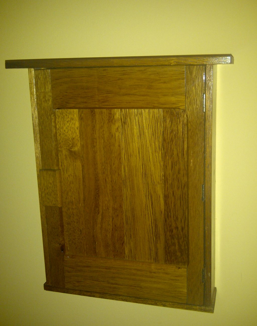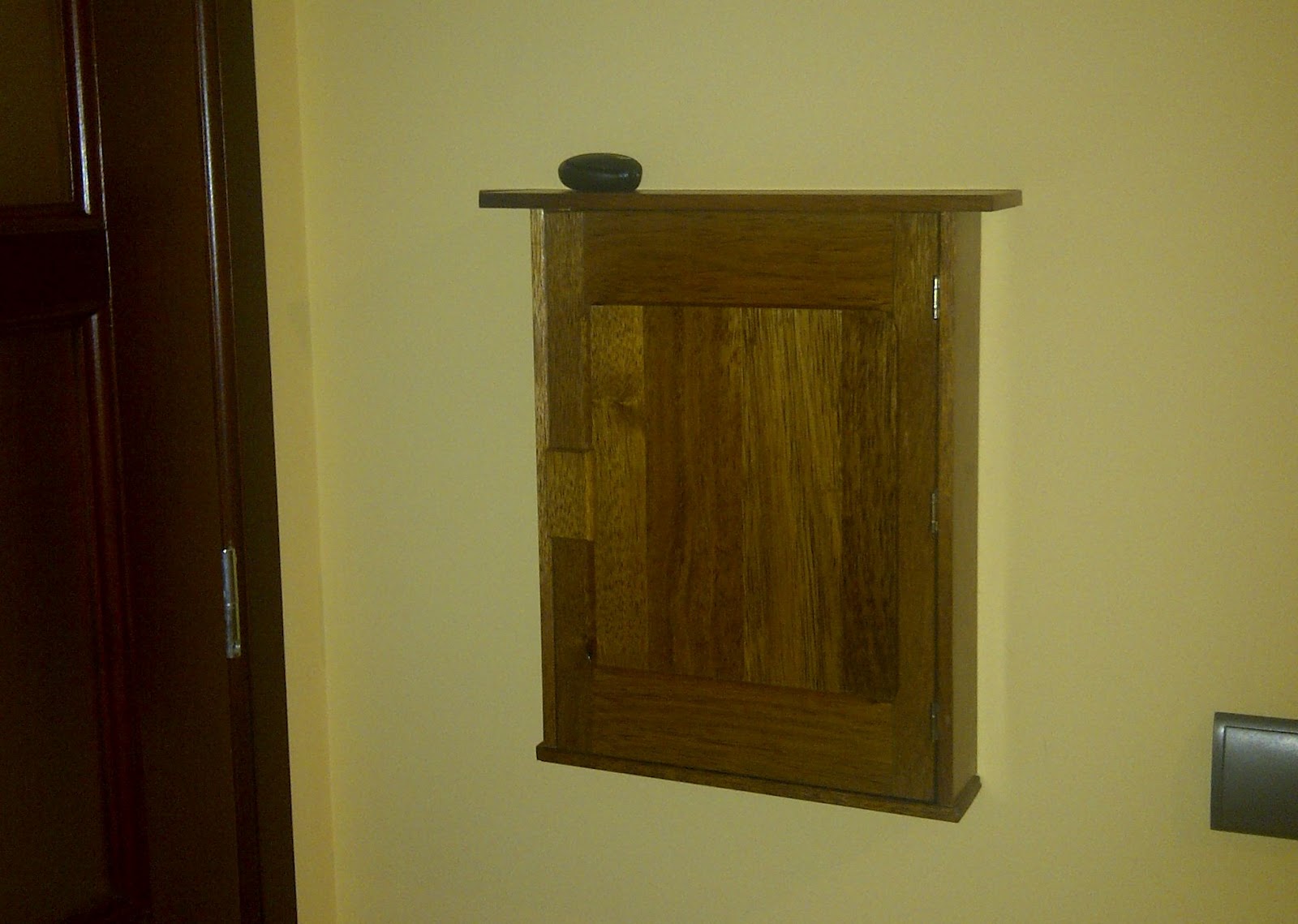 Odkąd sprzedałem poprzedni domek i z premedytacją pozostawiłem tam naszą skrzyneczkę na klucze (bo była za mała i nie dało się jej domknać) wiedziałem że zrobię nową sam. Potem kiedy kupowałem z żonką deski na podłogę też wiedziałem że z nich właśnie zrobię ten "domek na klucze". No i w sumie idealna okazja żeby poćwiczyć pracę z tym materiałem, bo co tu dożo mówić, merbau to nie sosna i zanim zacznę robić z niego parapety czy schody to trzeba go poznać. Dośc szybko zrobiłem drzwiczki, tak szybko że nawet nie mam zdjęć z procesu produkcyjnego. Kilka sklejonych deseczek a na wierzch ramka. Ramka była nudna więc trochę podfrezowałem ją po wewnętrznej stronie.