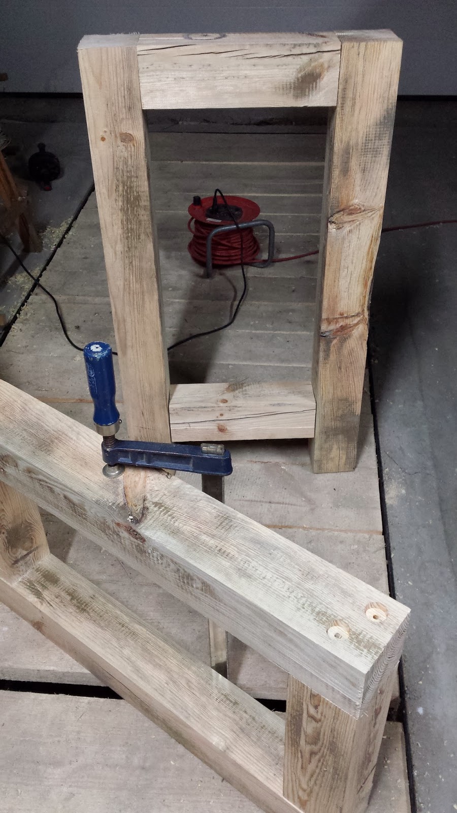W niedzielę zabrałem się za skręcanie. Najpierw po frezowałem wpusty na śruby, żeby łby nie wystawały oraz żeby gwint wszedł głębiej w drugą belkę. Potem skręcałem nogi ściskiem stolarskim, nawiercałem otwory i wkręcałem śruby z podkładkami.